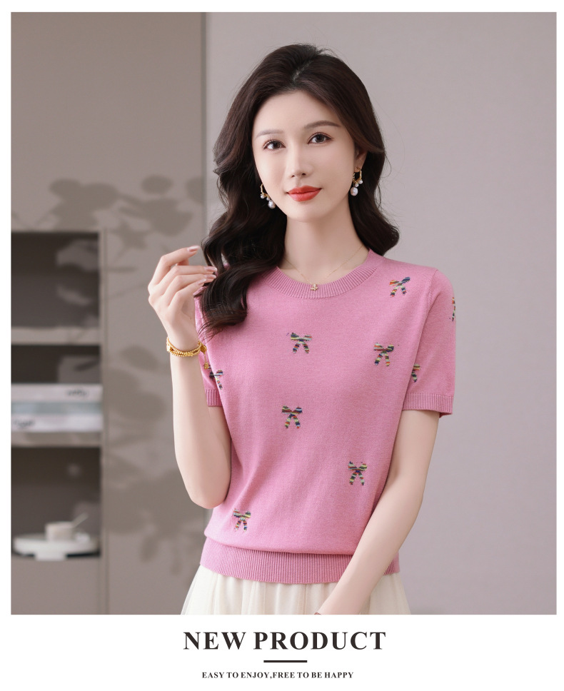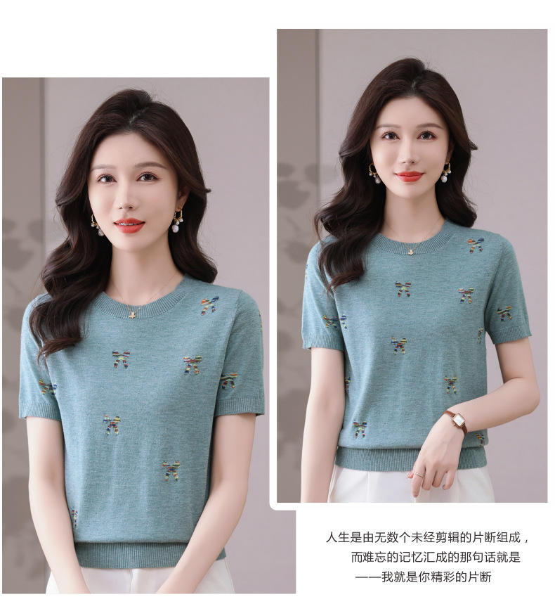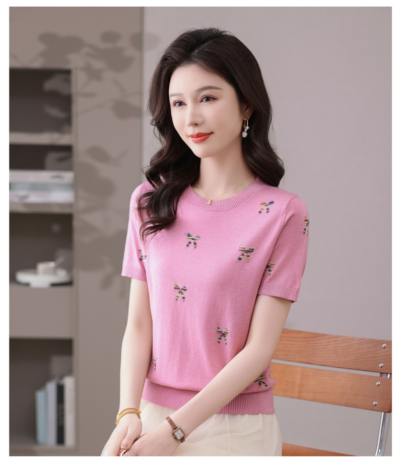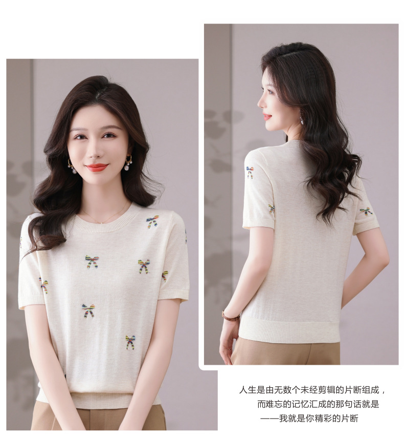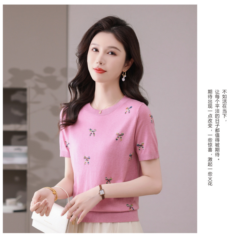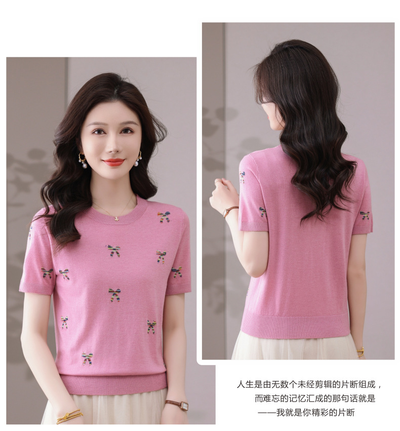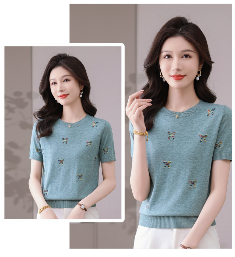 CC-101-356时尚刺绣圆领冰丝短袖t恤女2025新款夏季薄款针织衫显瘦短款上衣