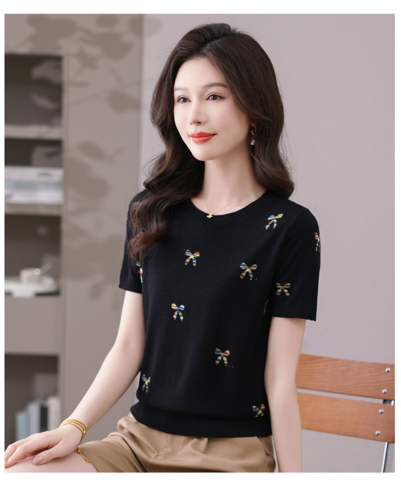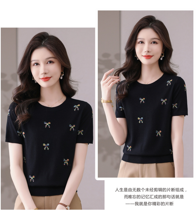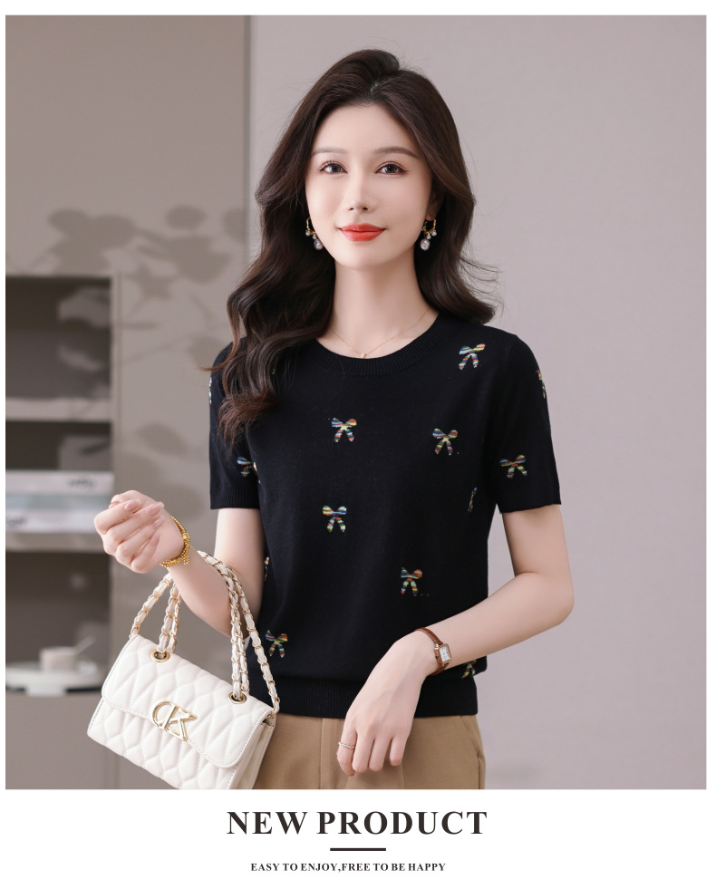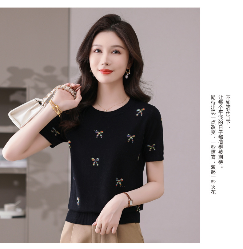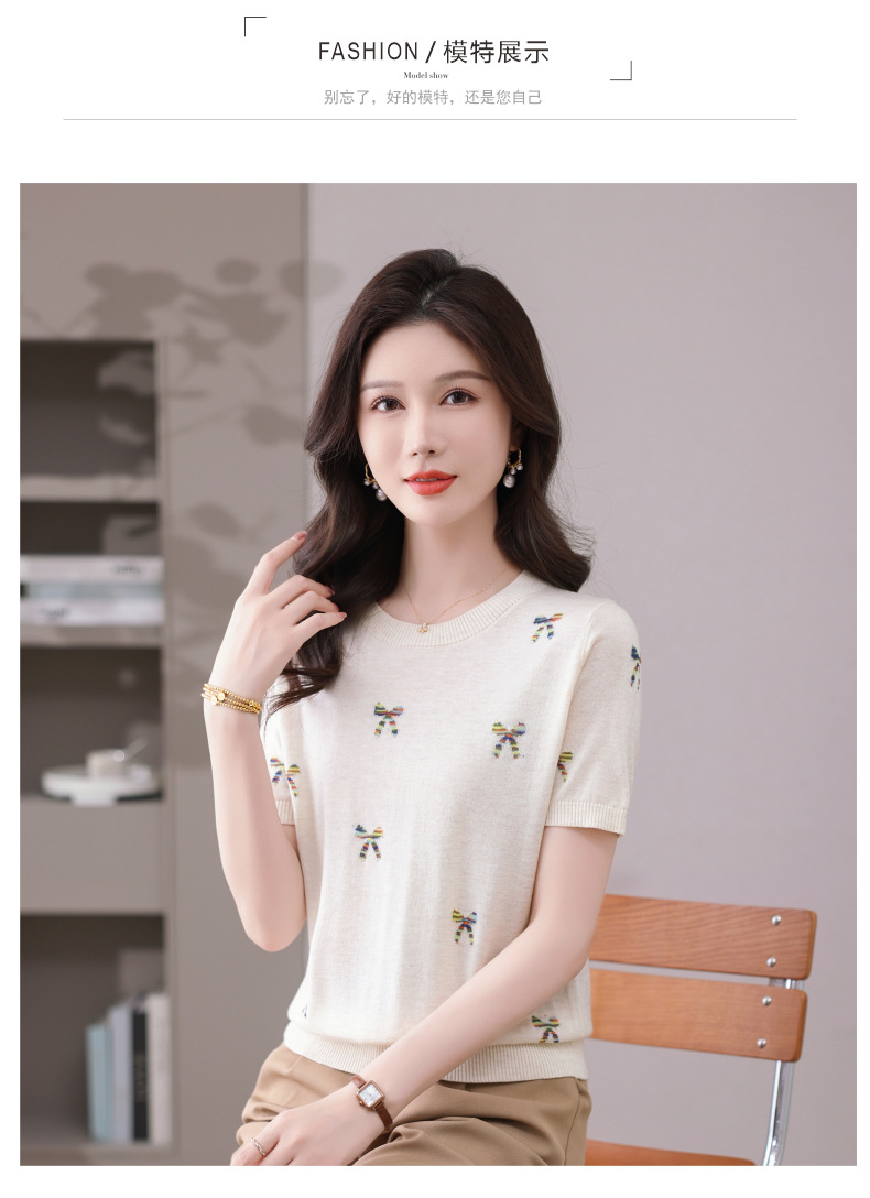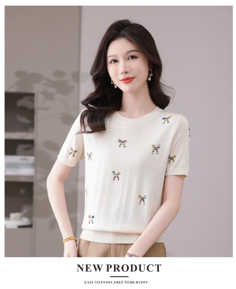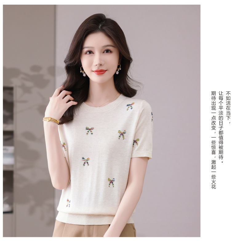 CC-101-356时尚刺绣圆领冰丝短袖t恤女2025新款夏季薄款针织衫显瘦短款上衣