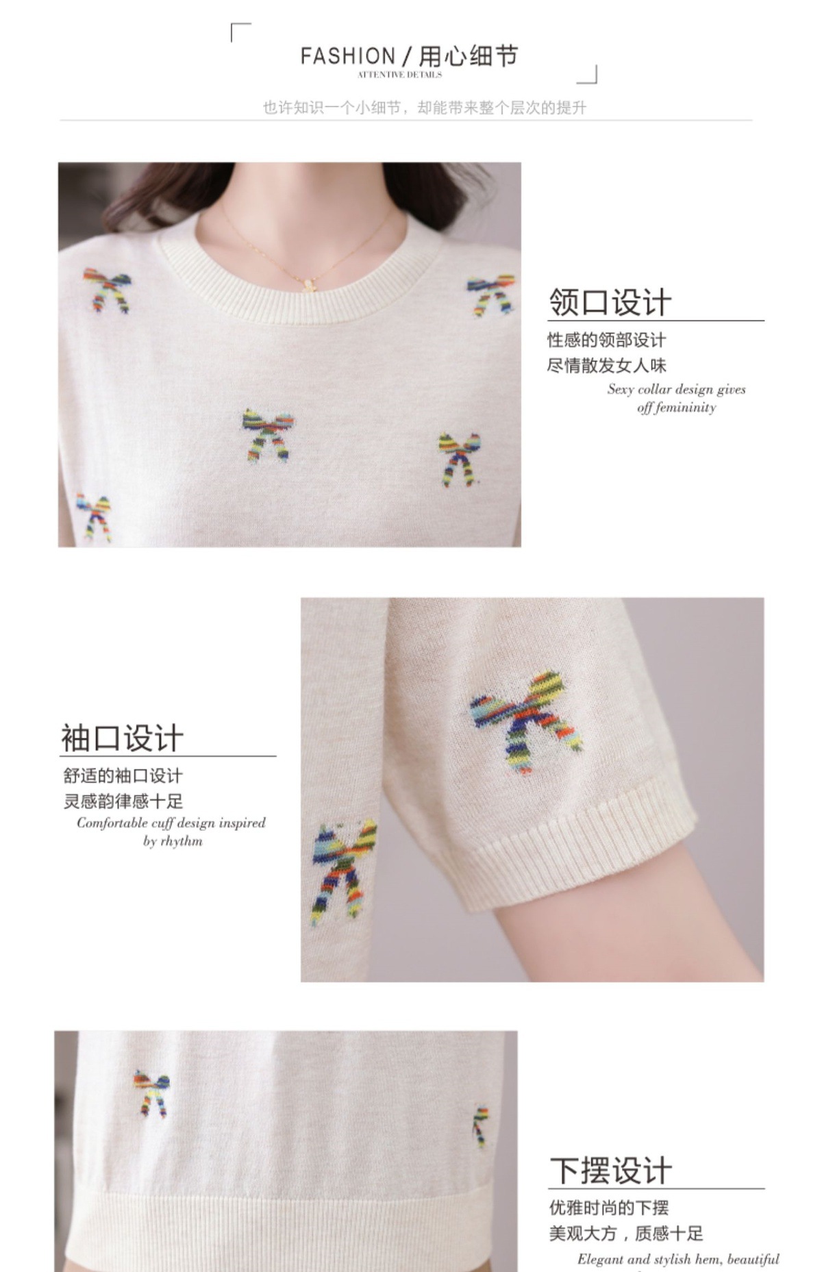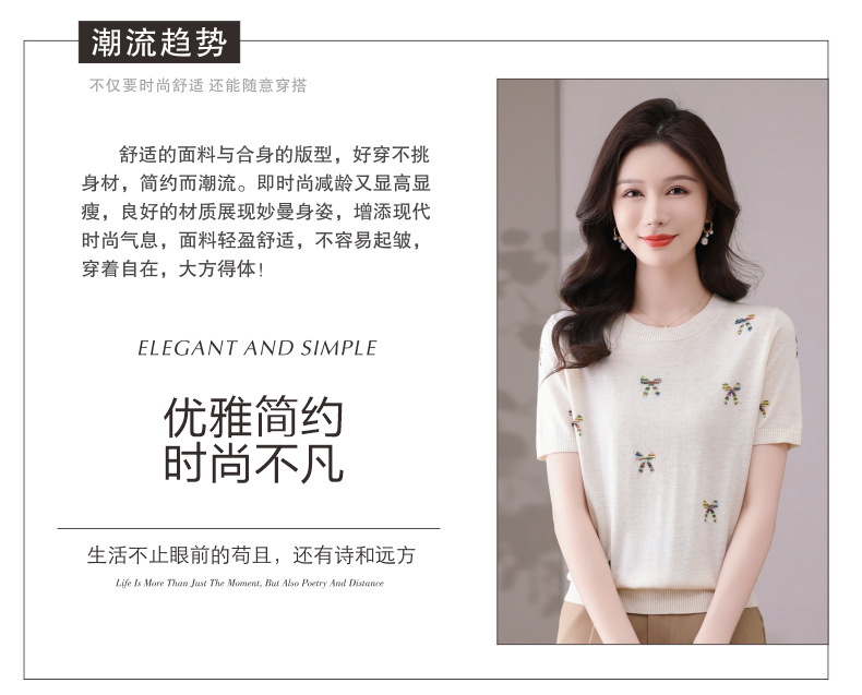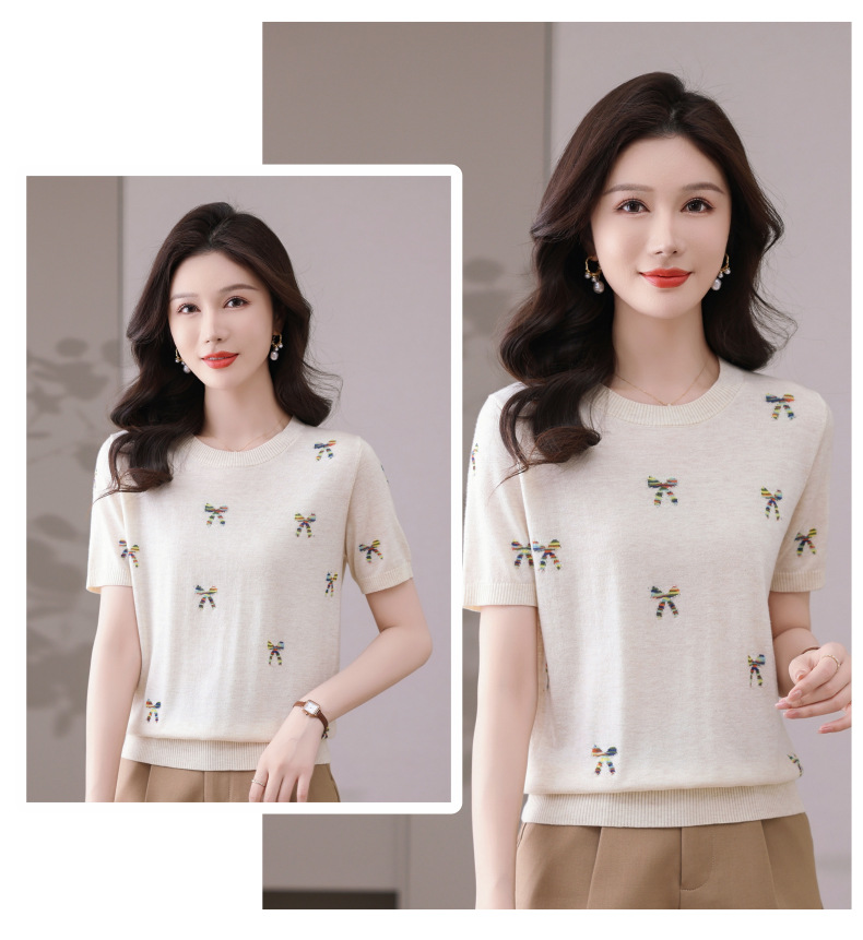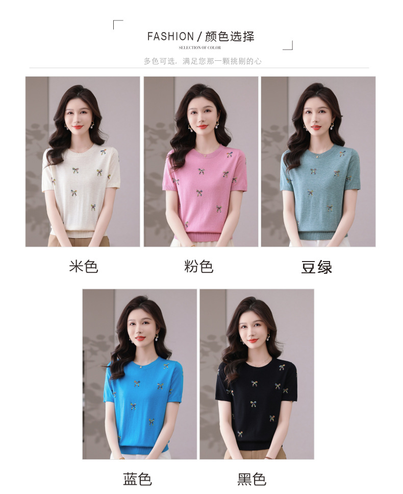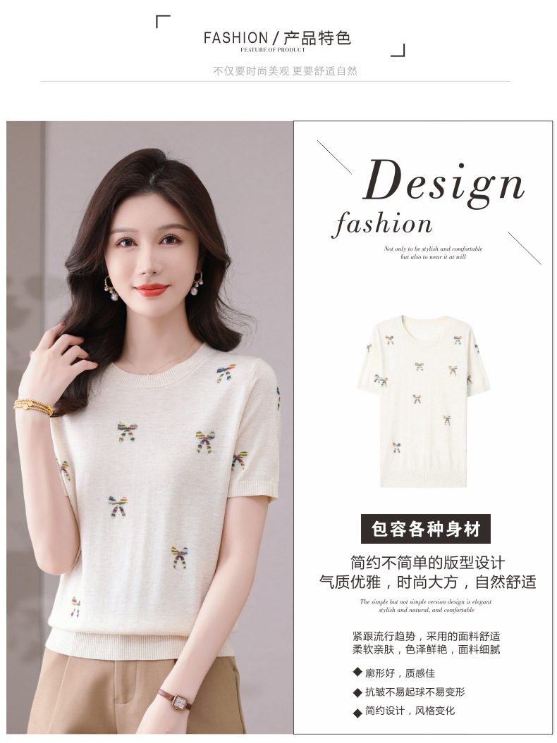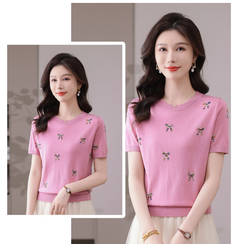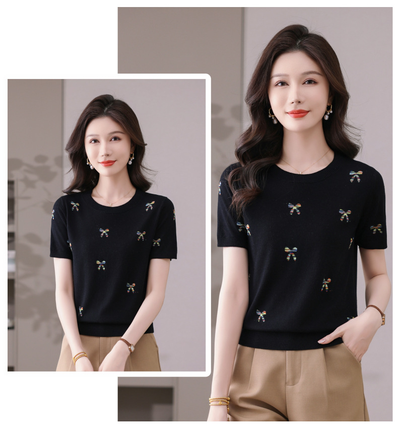 CC-101-356时尚刺绣圆领冰丝短袖t恤女2025新款夏季薄款针织衫显瘦短款上衣