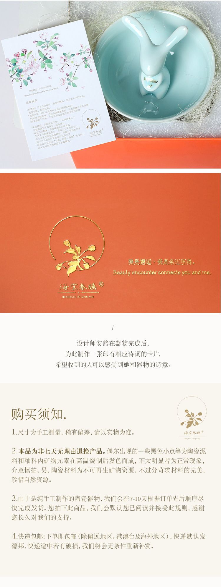 小tips:手工陶瓷不是机器成品,无法做到每个都一模一样,十全十美,可能存在烧制过程中釉的正常现象(小水泡、小黑点等),并非是质量问题,是纯手工制作的印记哦~