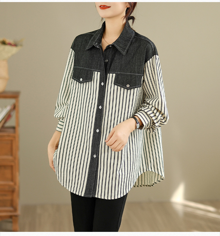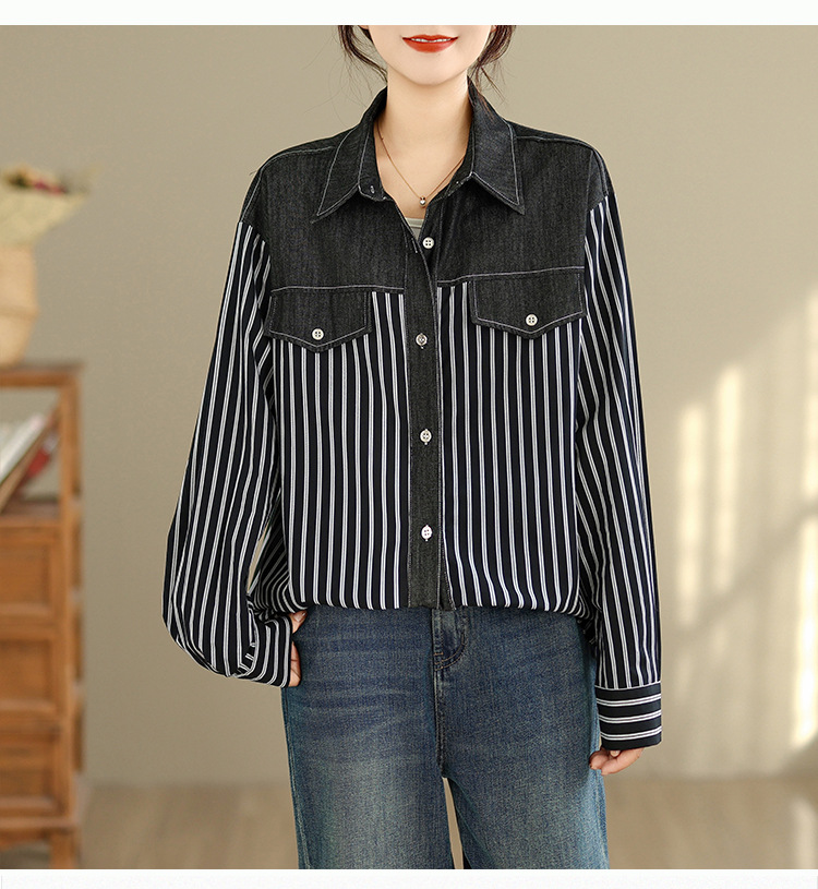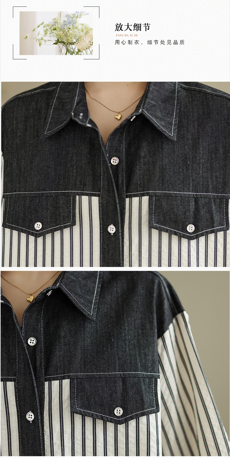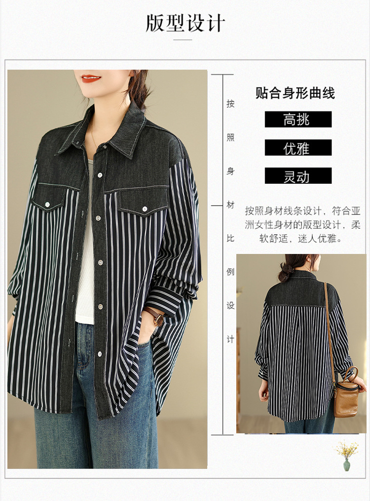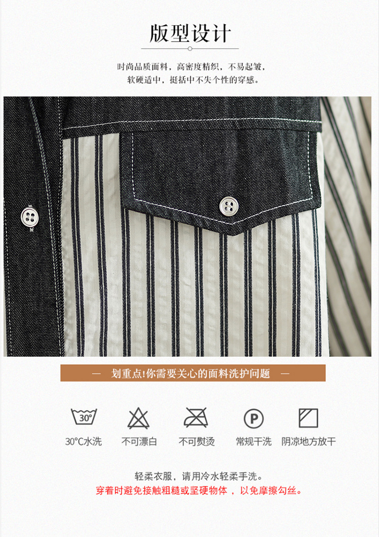 GYH 1779长袖宽松街头牛仔拼接条纹衬衫不规则上衣外套