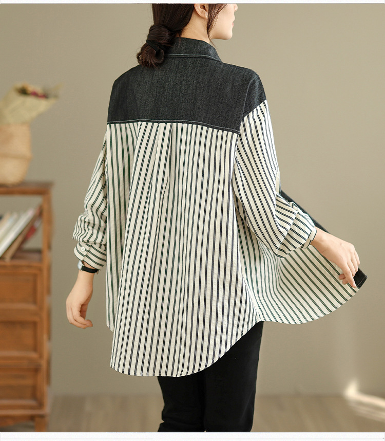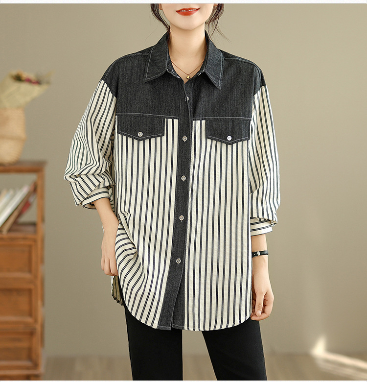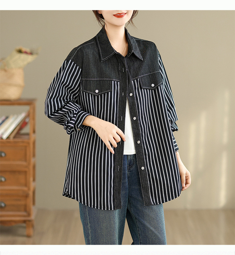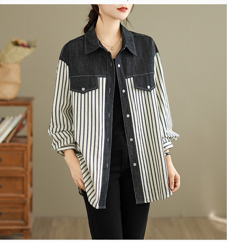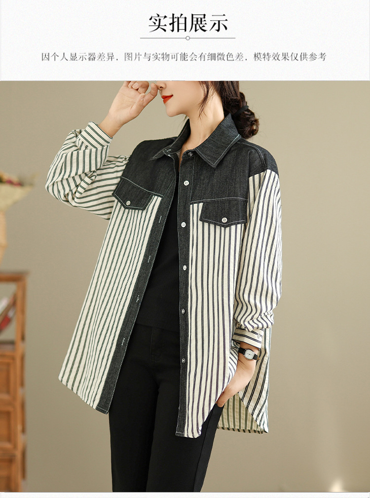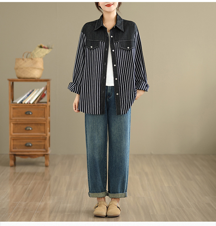 GYH 1779长袖宽松街头牛仔拼接条纹衬衫不规则上衣外套
