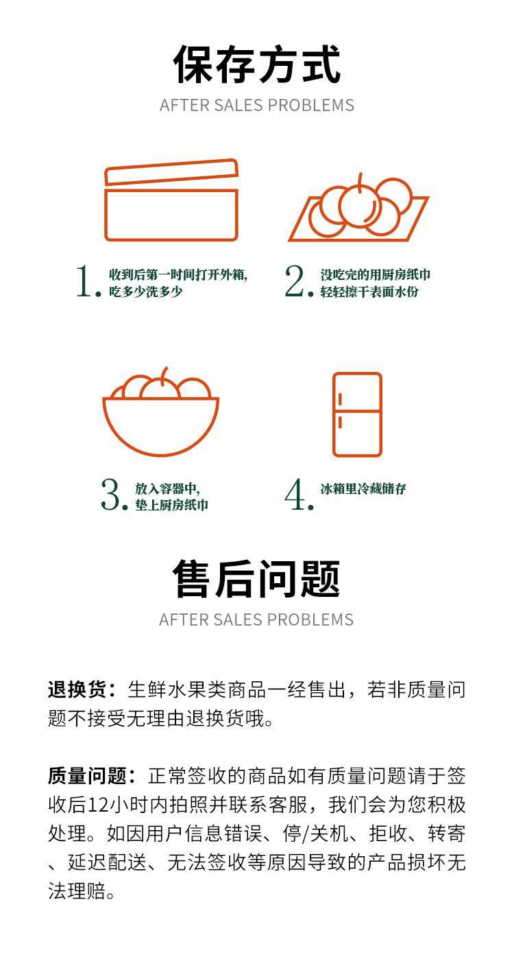 1:小樱桃收到后请在2小时内打开包装放冰箱,发现有损坏的拍照联系客服,樱桃娇贵10%以内属于正常损耗,不支持赔偿,2斤15颗免赔,3斤25颗免赔,超过按照一颗0.3元(如2斤坏果20颗,赔付5*0.3),因为保存不当造成的损坏我们不负责哦~