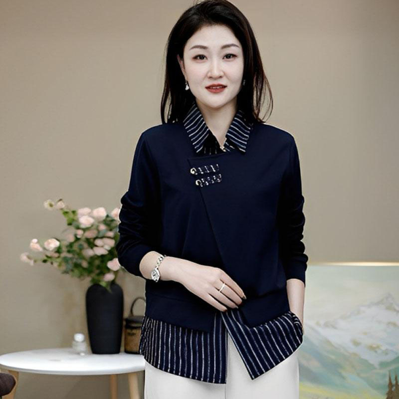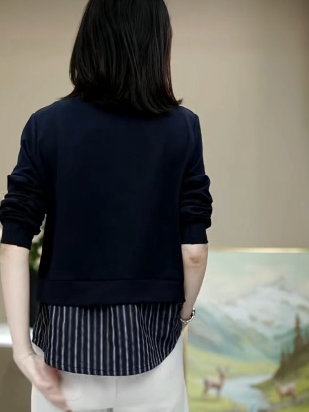 气质条纹翻领假两件拼接衬衫2025秋季E时尚减龄休闲百搭显瘦小衫
