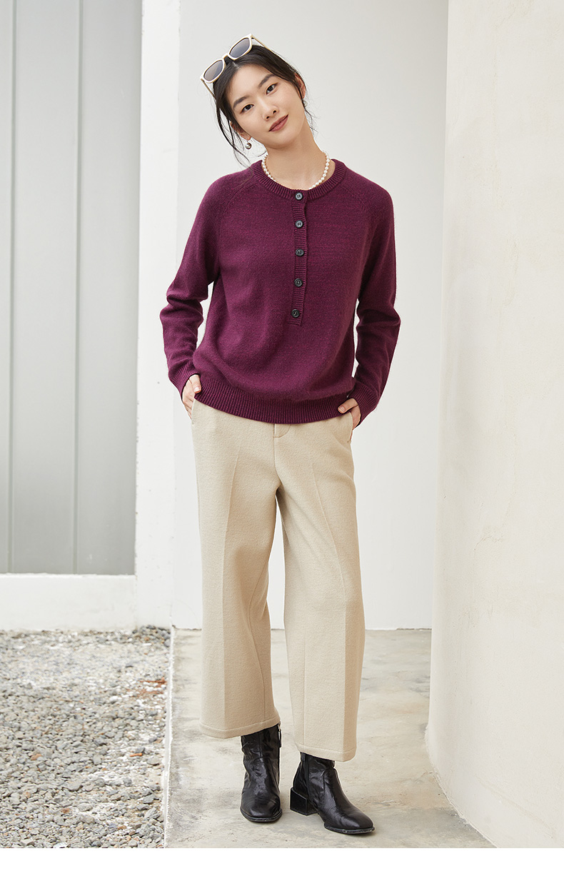 酒红色亨利领羊毛针织衫,复古纽扣设计 + 软糯质感 + 宽松版型,承包你冬日叠穿的温柔气质与保暖刚需