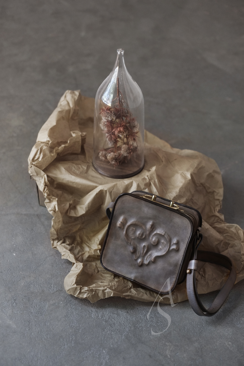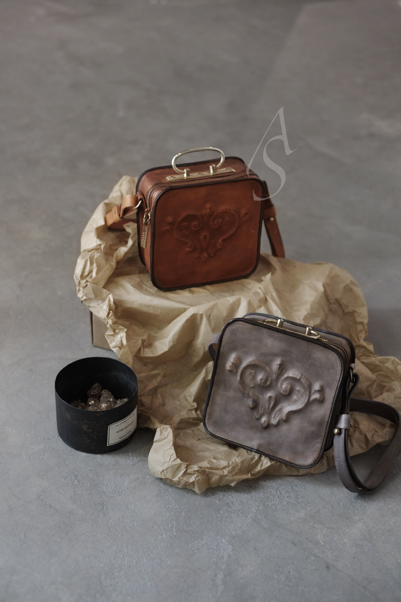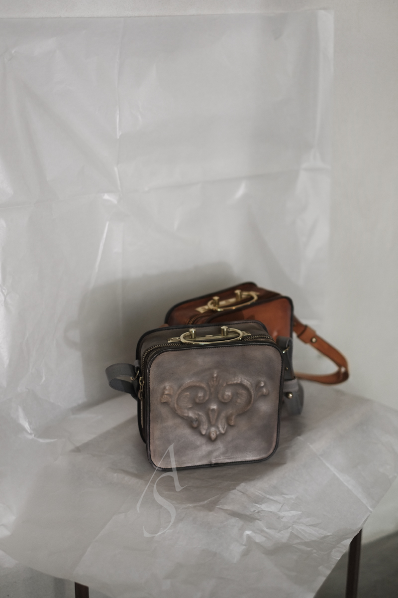 方正的包形精致小巧,由手工染色的西班牙上等牛皮制作,富有自然做旧的色泽肌理感。压印立体的浮雕犹如一幅古旧的壁画,带来原始的手工质感。鞍褐色、浅石色两色可选。