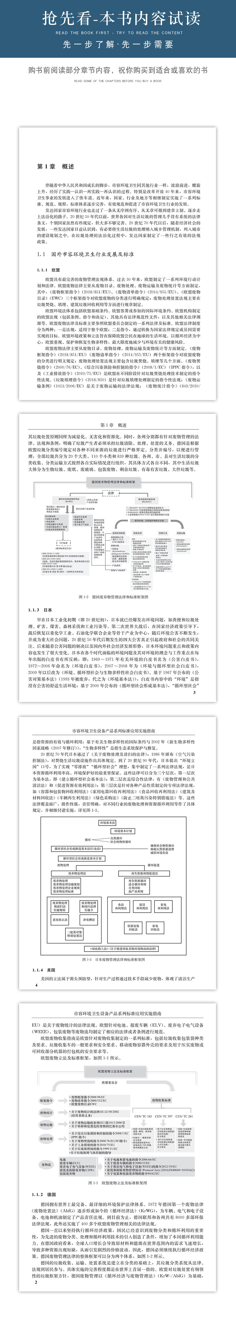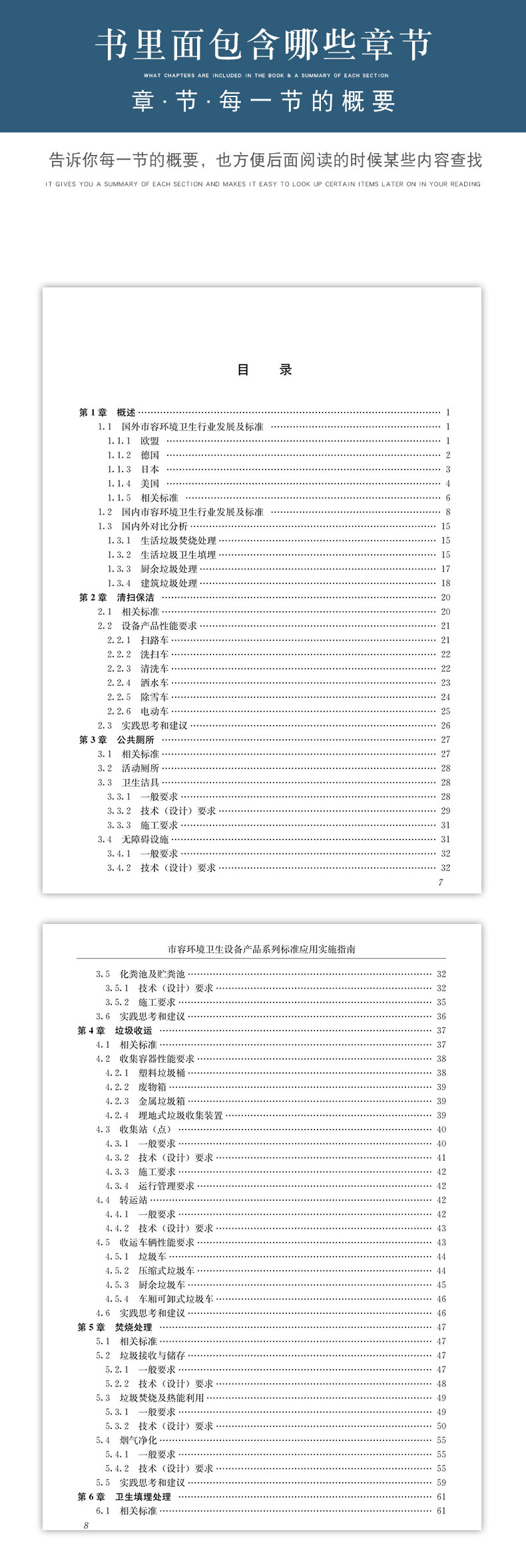 共分12章。第1章对国内外市容环境卫生行业发展及标准进行了梳理分析;第2章对清扫保洁相关设备产品的基本性能、应用选型进行了分析;第3章对公共厕所的设置、安装以及设备产品的基本性能进行了分析;第4章对垃圾收集转运设备产品的基本性能、应用选型进行了分析;第5章对焚烧处理垃圾接收与储存、焚烧及热能利用、烟气处理等系统设备产品性能、设计、施工、运行管理等进行了分析;第6章对卫生填埋处理防渗与封场覆盖系统、渗沥液与地下水导排系统、填埋气导排与利用等系统设备产品性能、设计、施工、运行管理等进行了分析;第7章对厨余垃圾处理接受与储存、预处理、厌氧消化、好氧生物处理等设备产品性能、设计、施工、运行管理等进行了分析;第8章对建筑垃圾处理破碎、筛分、分选及资源化系统设备产品性能、设计、施工、运行管理等进行了分析;第9章对粪便预处理接收、固液分离、螺旋输送、储存调节、絮凝脱水等系统设备产品性能、设计、施工、运行管理等进行了分析;第10章对渗沥液预处理、厌氧生物处理、膜生物反应器、纳滤及反渗透、高级氧化、蒸发、浓缩液处理等系统设备产品性能、设计、施工、运行管理等进行了分析;第11章对臭气控制与处理等系统设备产品性能、设计、施工、运行管理等进行了分析;第12章分析了市容环境卫生行业的新产品新技术发展方向以及标准需求。