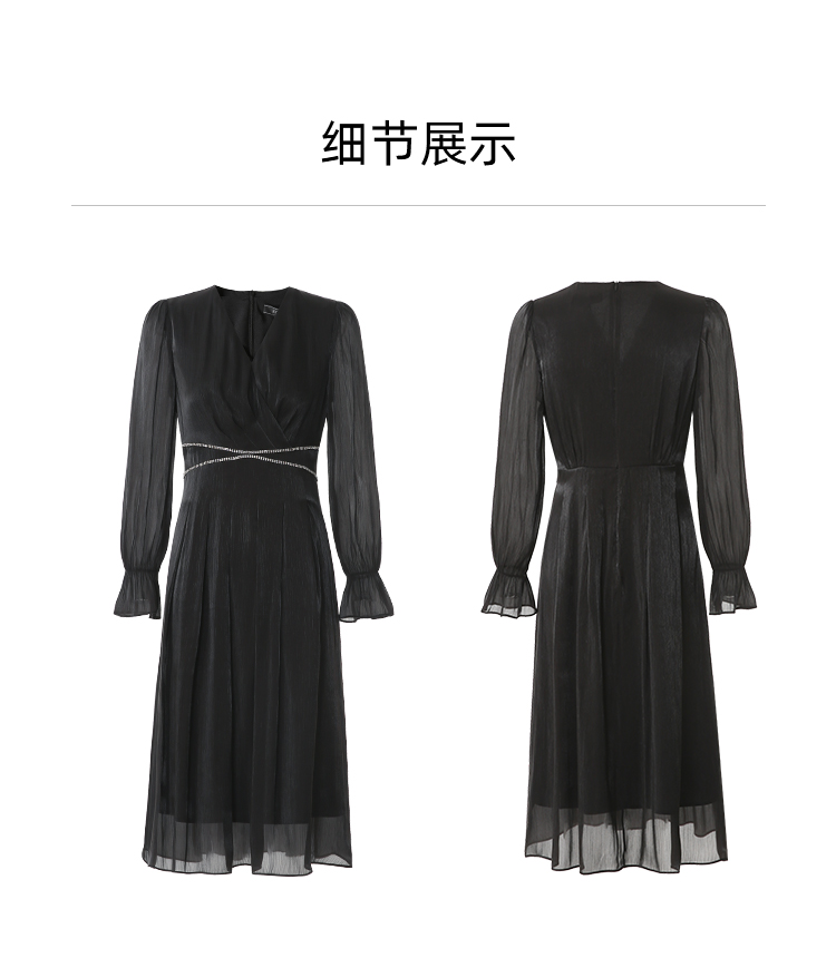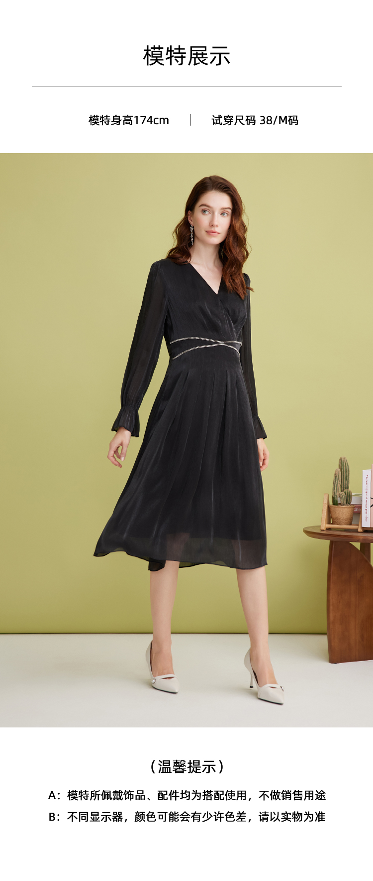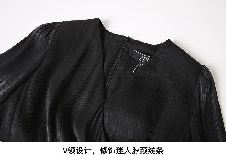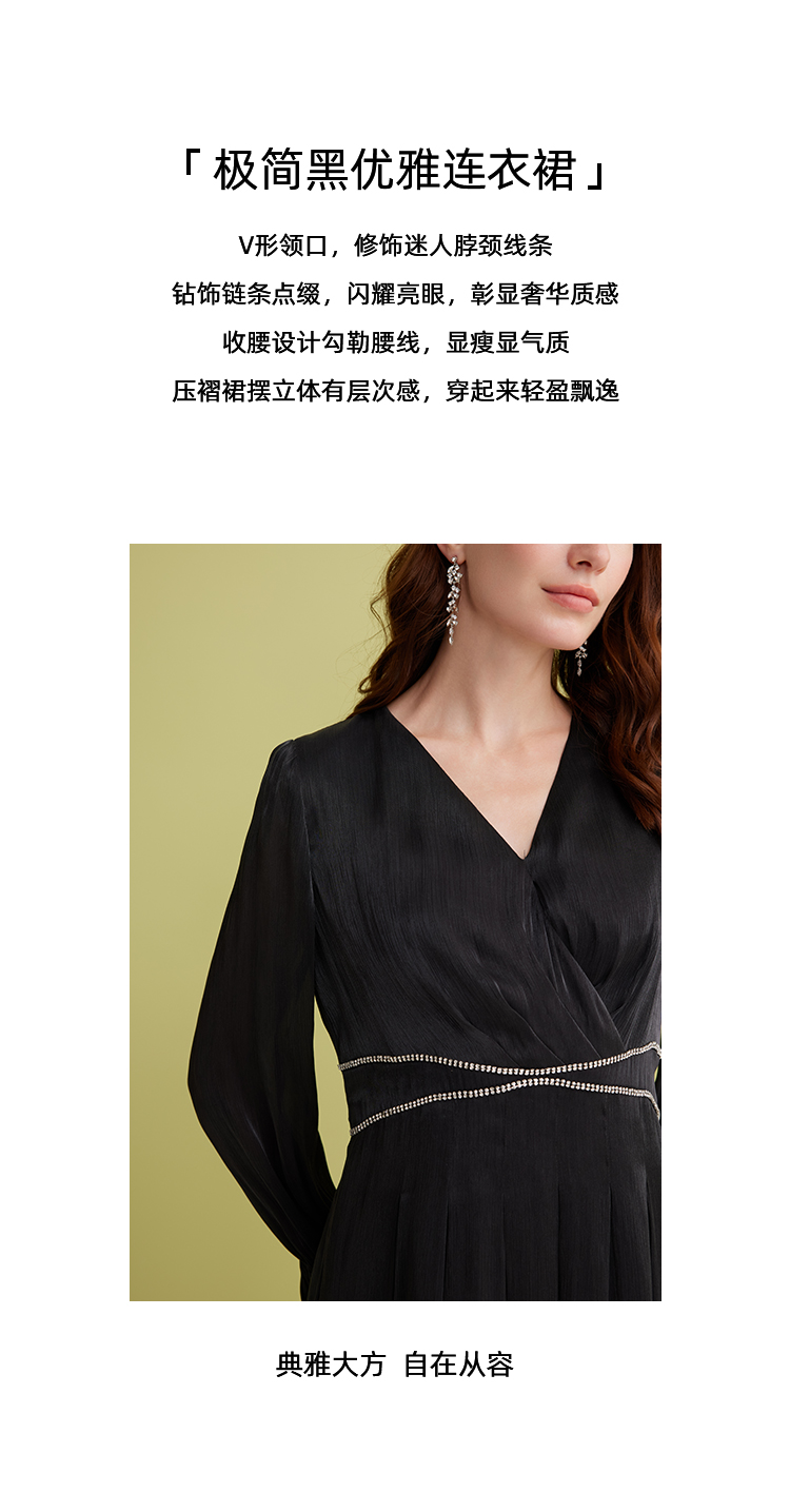EITIE爱特爱气质优雅V领收腰垂坠压褶连衣裙2025春季新款A2507529