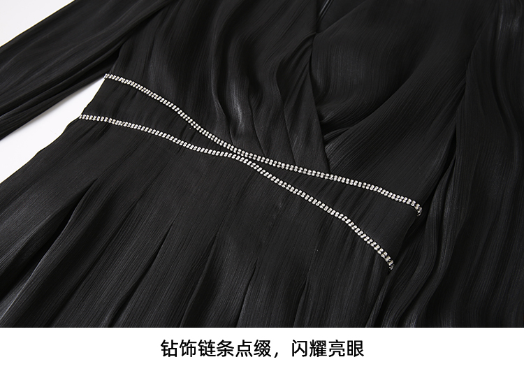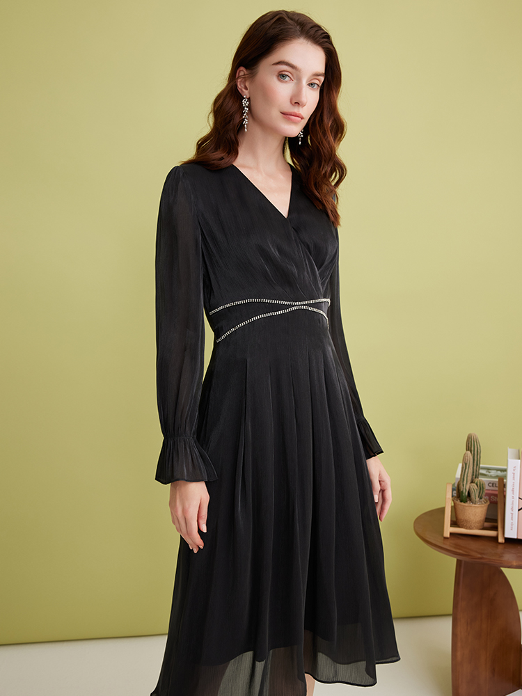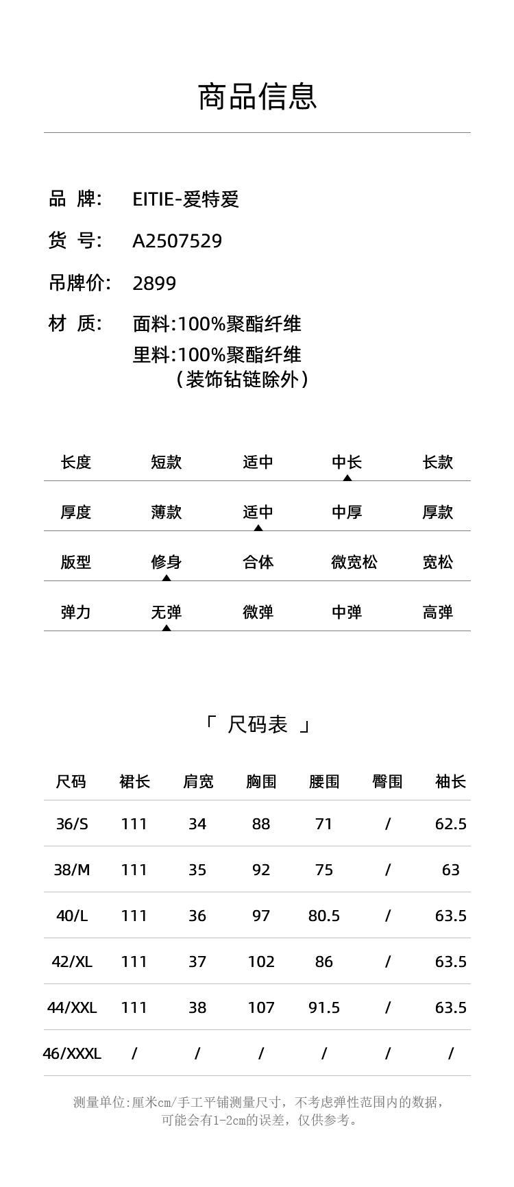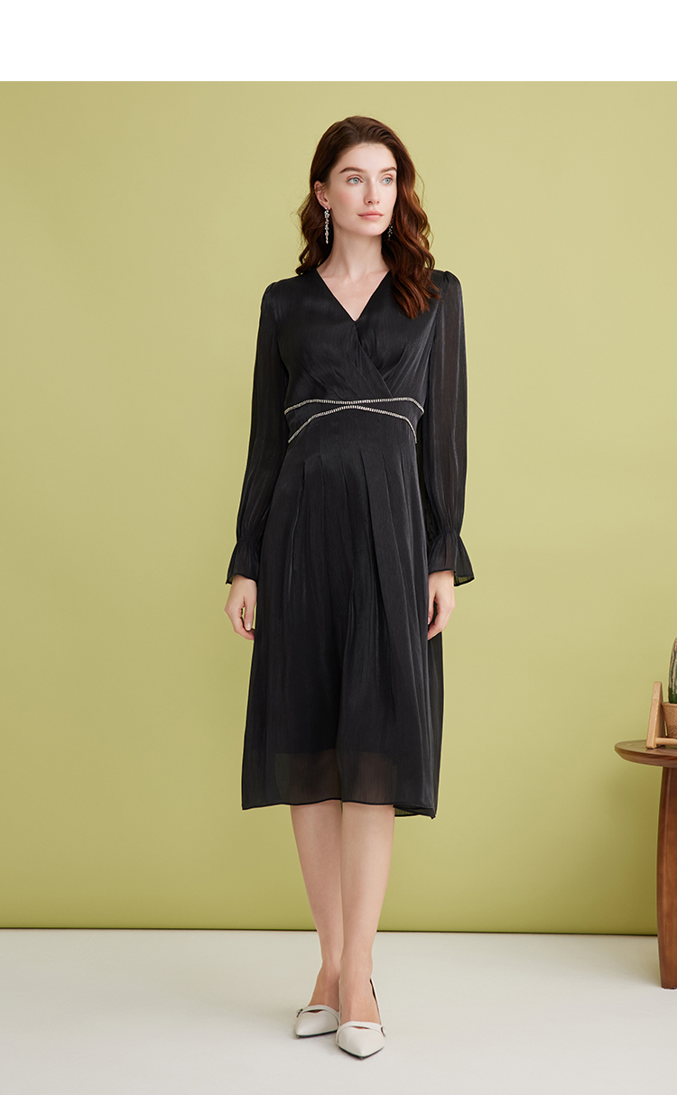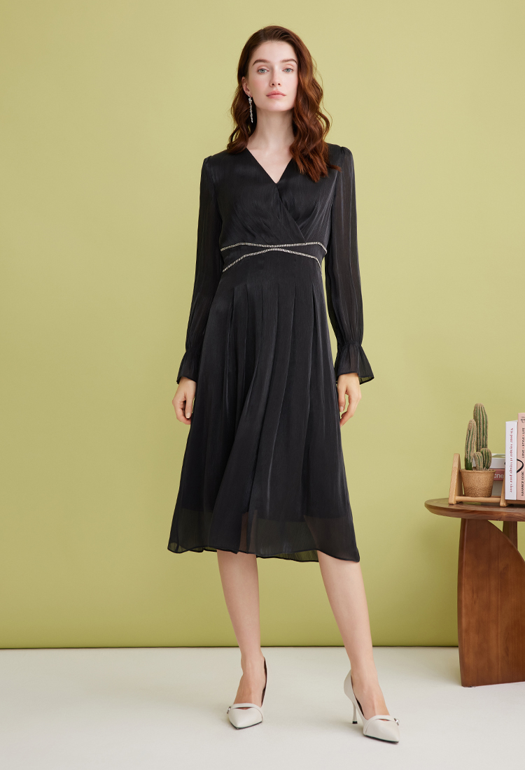 EITIE爱特爱气质优雅V领收腰垂坠压褶连衣裙2025春季新款A2507529