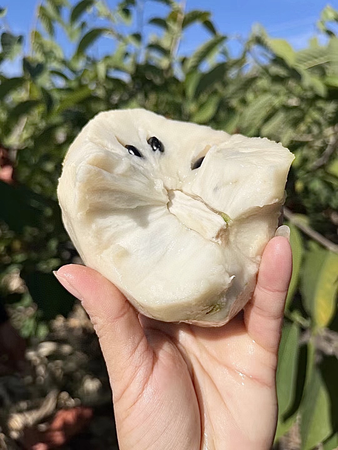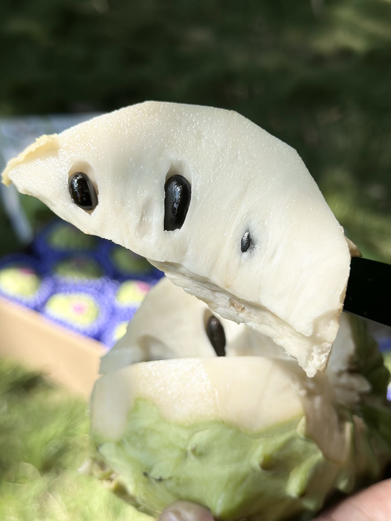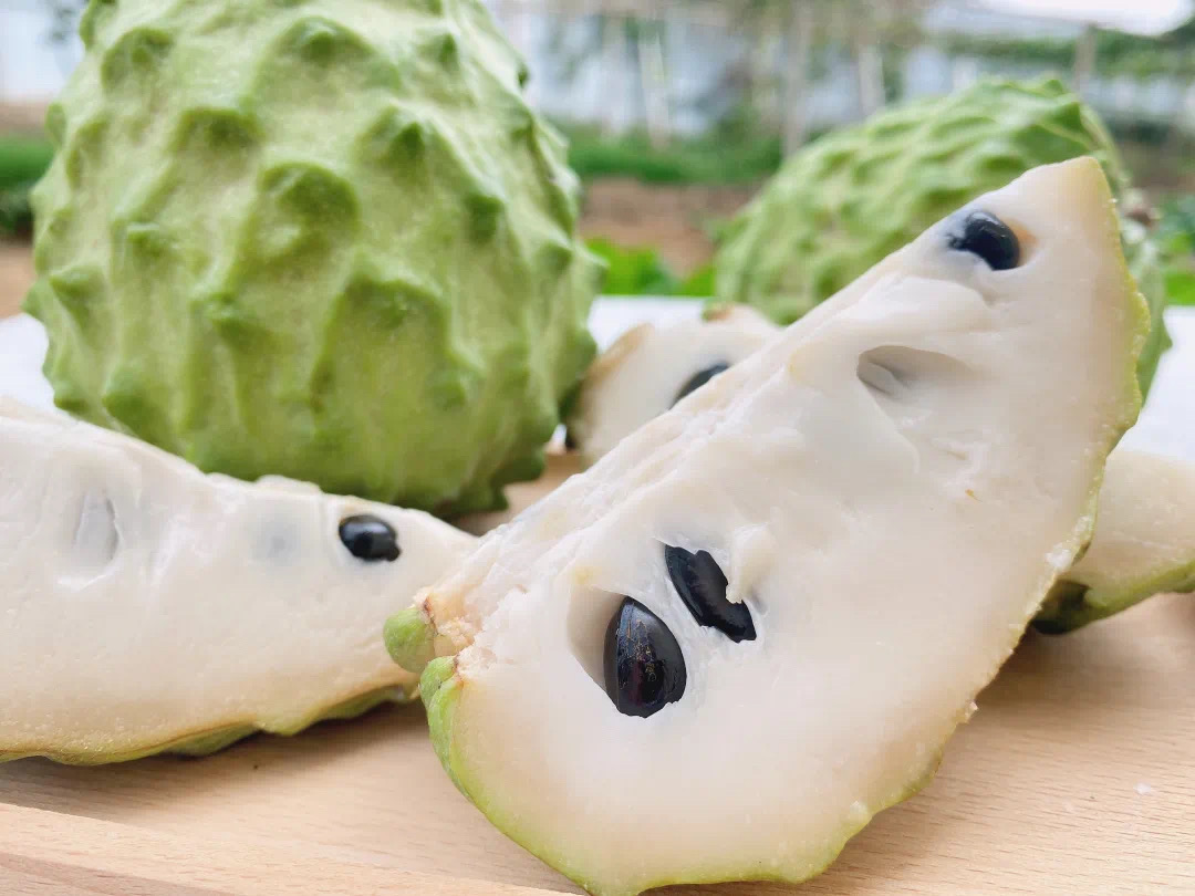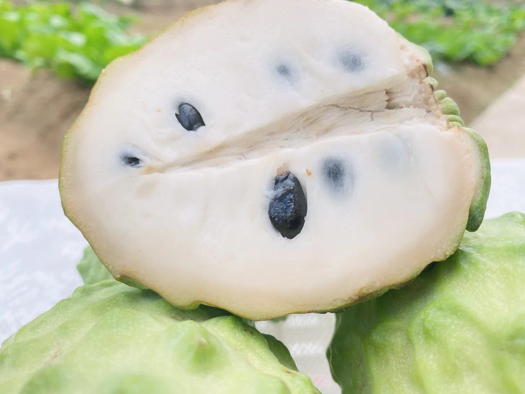 释迦翠绿如玉的外表,里面是诱人的乳白色果肉,每个瓣里含有一颗乌黑晶亮的籽。相较于普通释迦——凤梨释迦聚合果更大,肉更厚,汁更多,味更甜,籽更少。