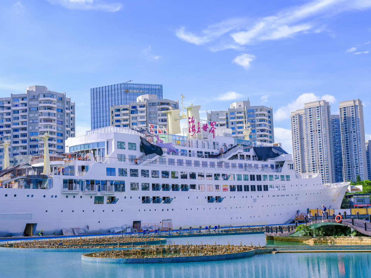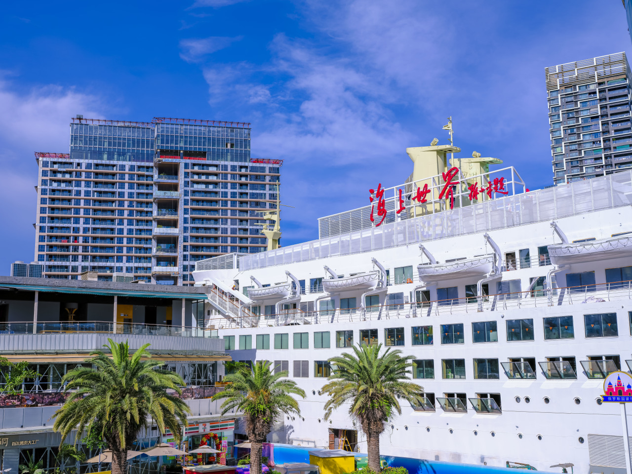 •明华轮白天细节:阳光下邮轮的金属质感、复古舷窗与楼梯线条,适合拍建筑肌理与复古风人像。