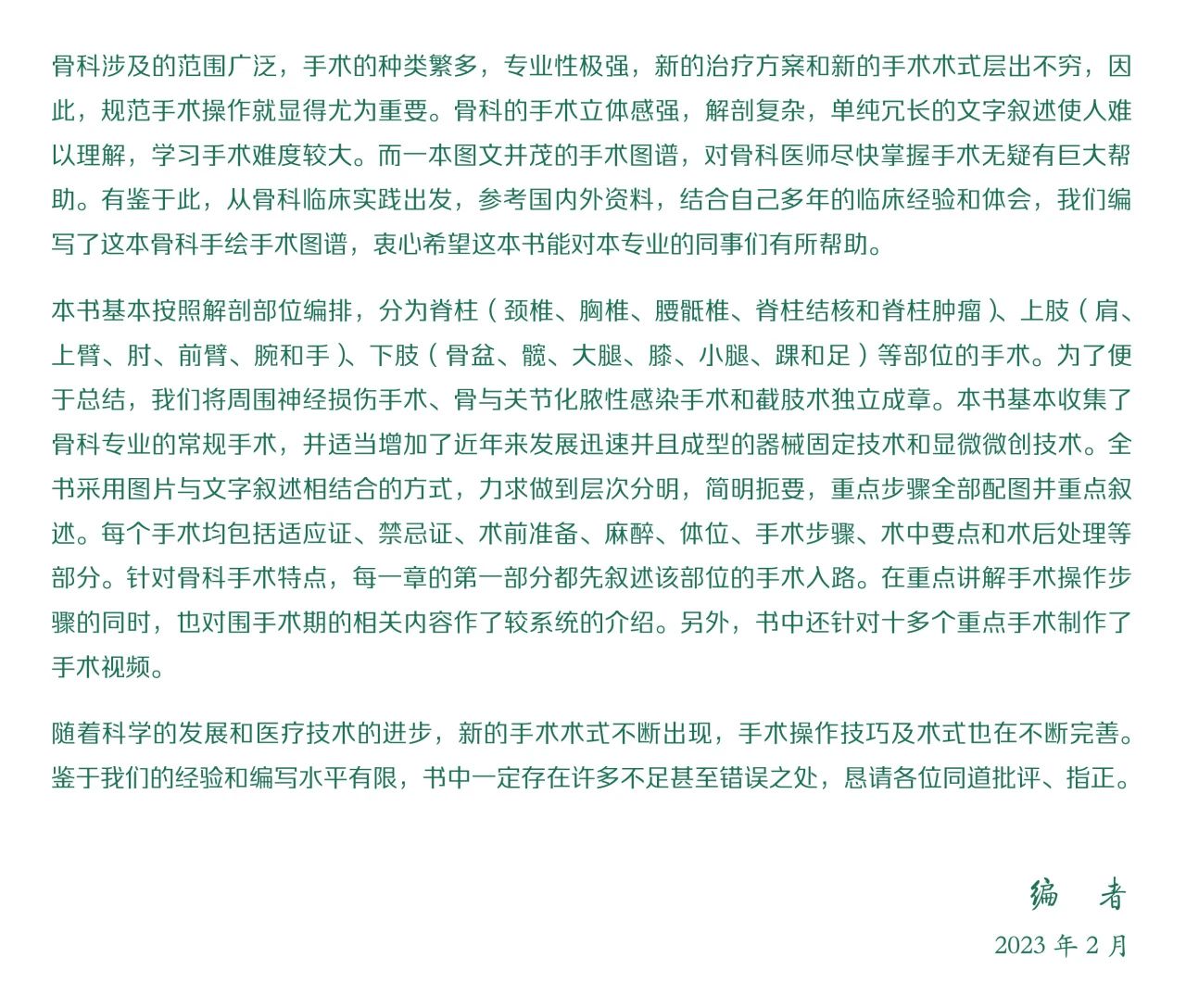 本书基本按照解剖部位编排,分为脊柱、上肢、下肢等部位手术。为了便于总结,我们将周围神经损伤手术、骨关节化脓性感染手术和截肢术独立成章。本书基本收集了骨科专业的常规手术,并适当增加了近年来发展迅速并且成型的器械固定技术和显微微创技术。全书采用图片与文字叙述相结合的方式,力求做到层次分明,简明扼要,重点步骤全部配图并重点叙述。