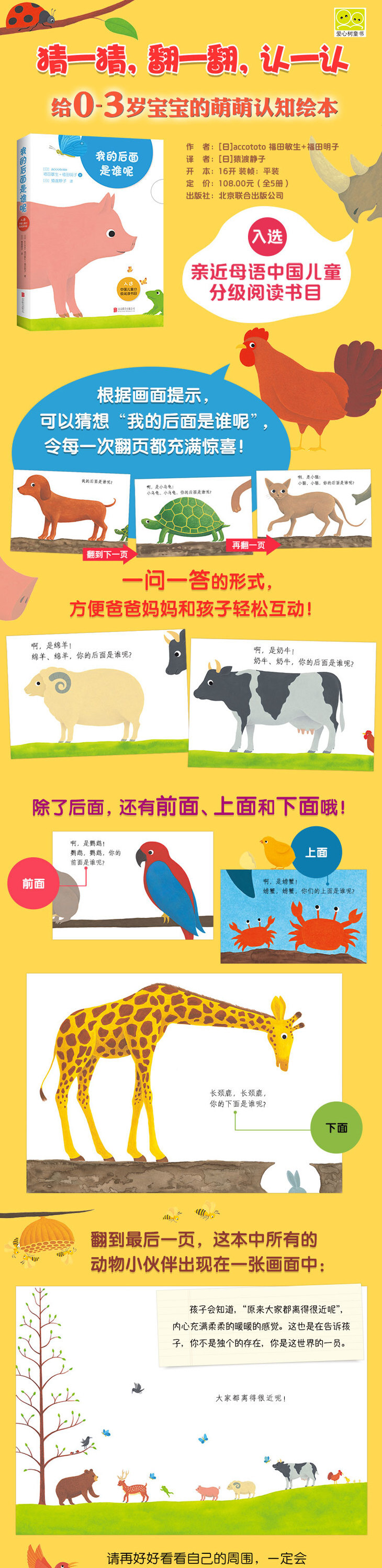 《我的后面是谁呢》(全5册)是专为0-3岁幼儿设计的认知绘本。全书均以“绵羊,绵羊,你的后面是谁呢”这样的句式提问,让孩子根据画面中的提示进行猜想,翻页发现身旁的动物。当所有的动物小伙伴出现在一张画面中,孩子会知道,“原来大家都离得很近呢”,内心充满柔柔的暖暖的感觉。