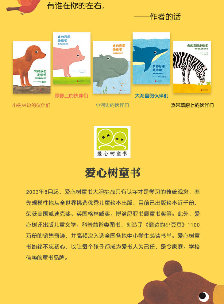 比如有一套书《我的后面是谁呢》,书中每页有一只动物,这只动物上下或前后的某个方向上还有另一只动物的小局部。每页还有个提问,句式如“我的后面是谁呢”。既教会孩子方位,又能让孩子通过猜一猜的有趣方式,认识陆地、水中、天上的动物。