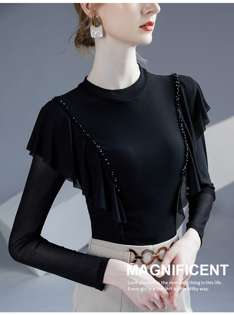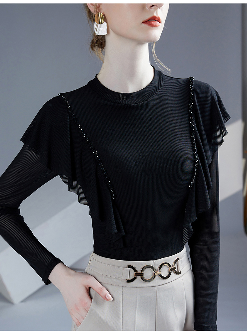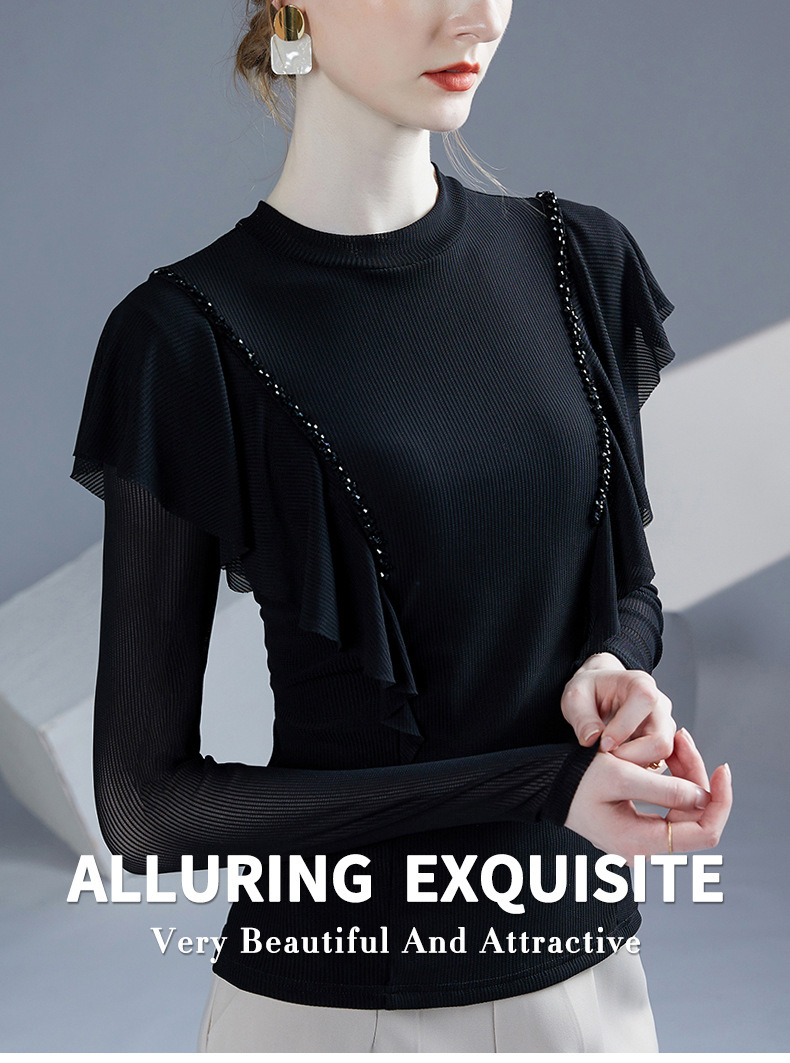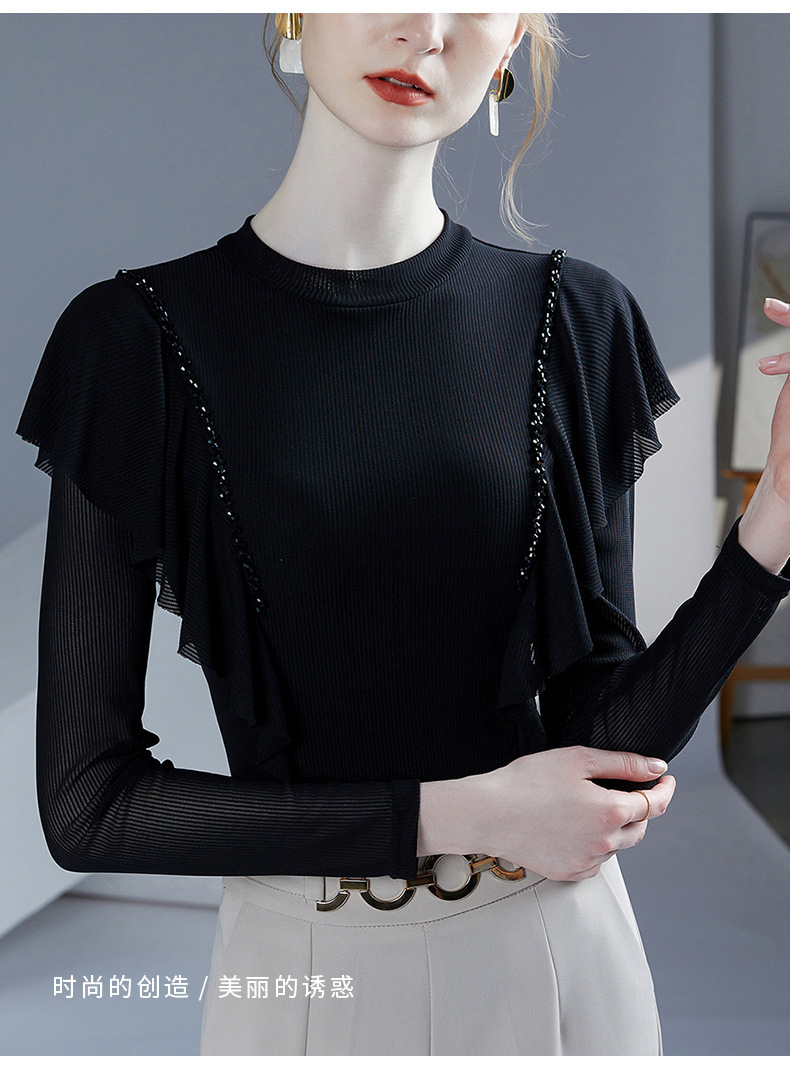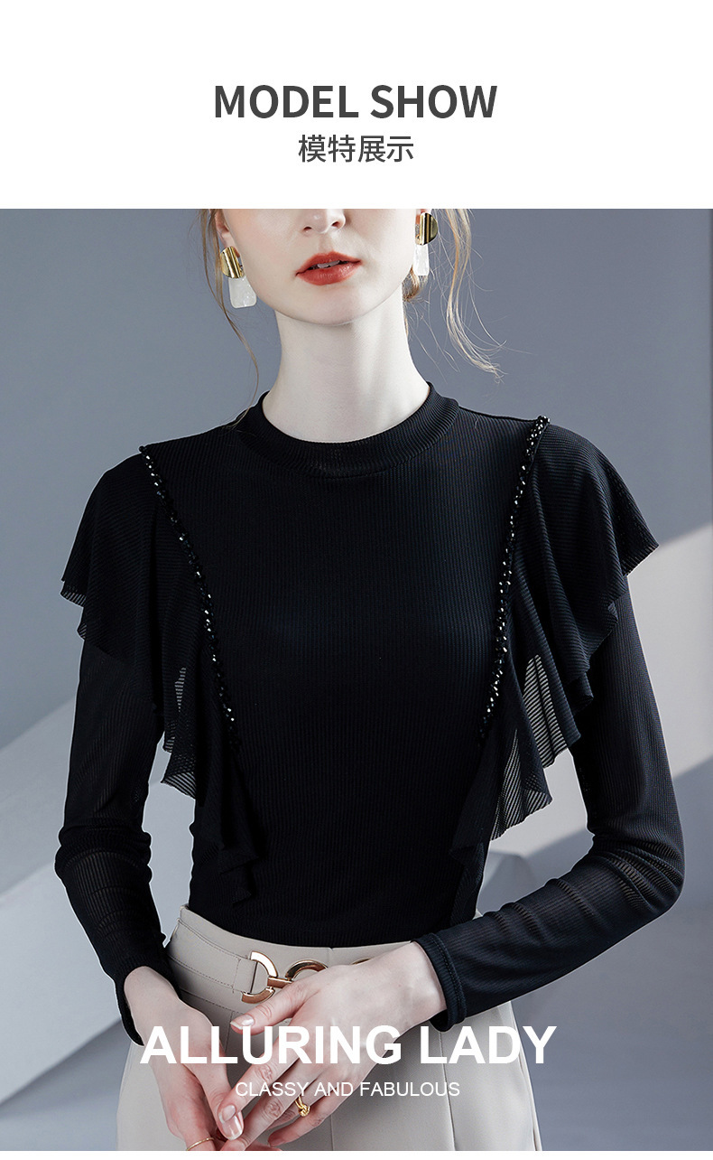 雀说新款荷叶边钉珠打底衫网纱长袖洋气时尚女上衣小衫AL36760