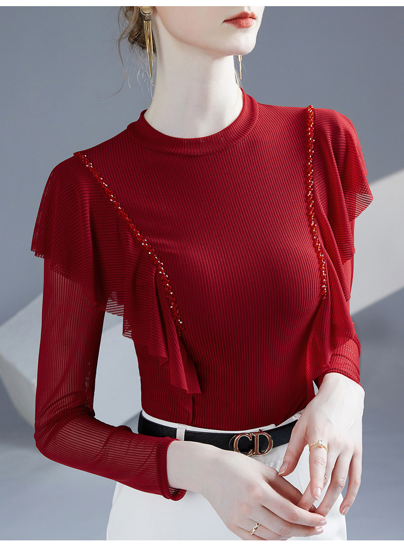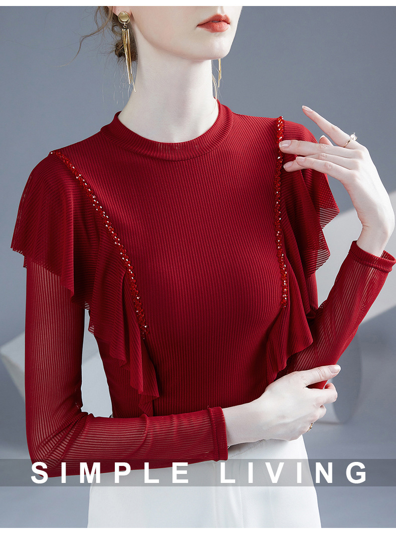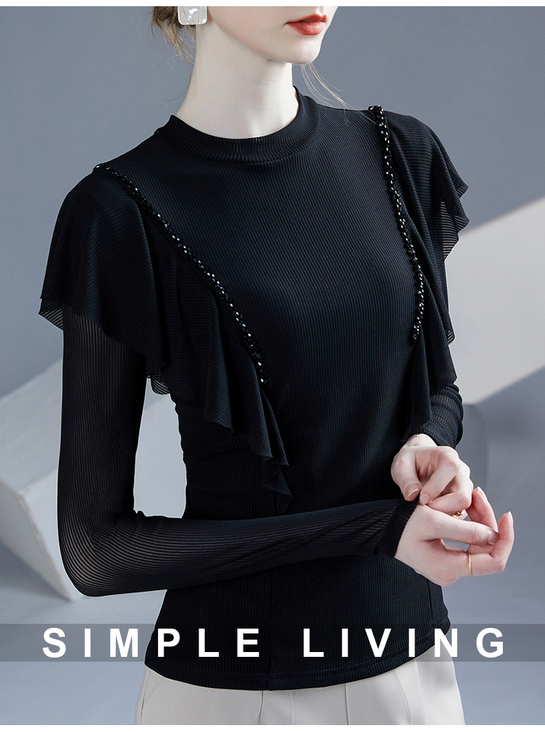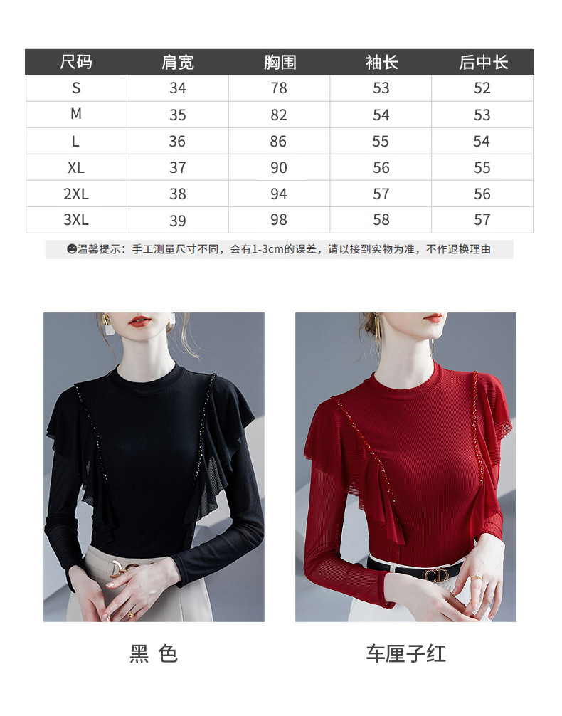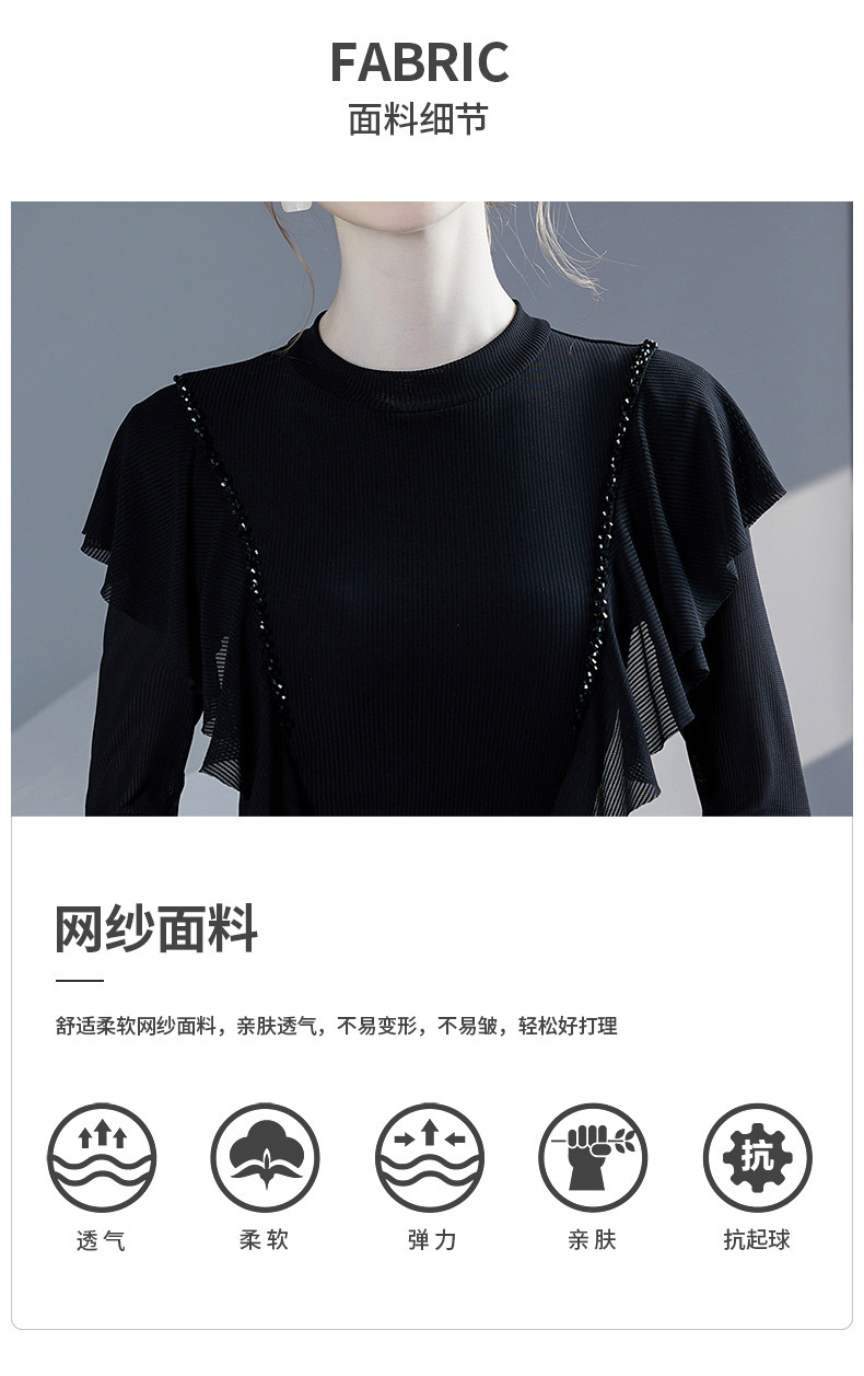 雀说新款荷叶边钉珠打底衫网纱长袖洋气时尚女上衣小衫AL36760