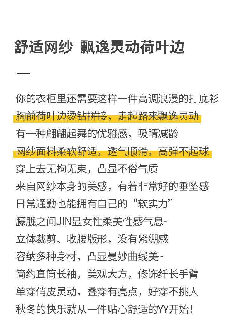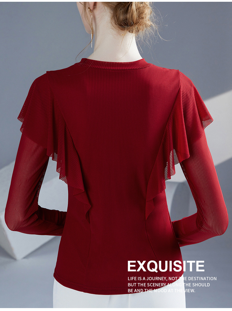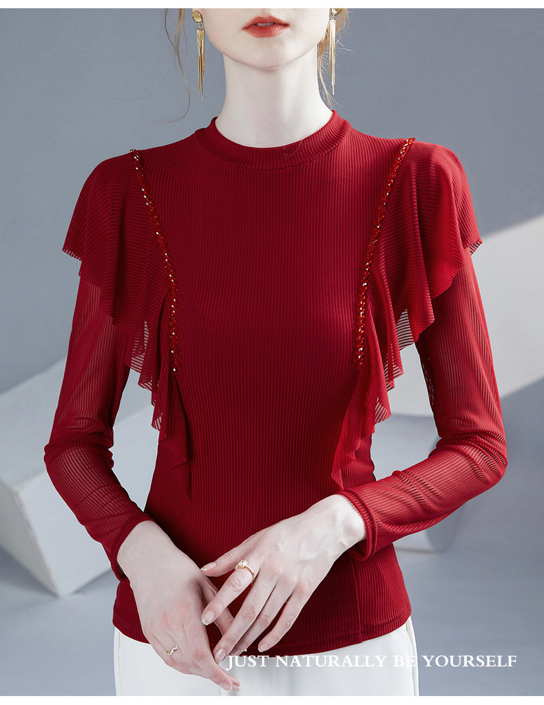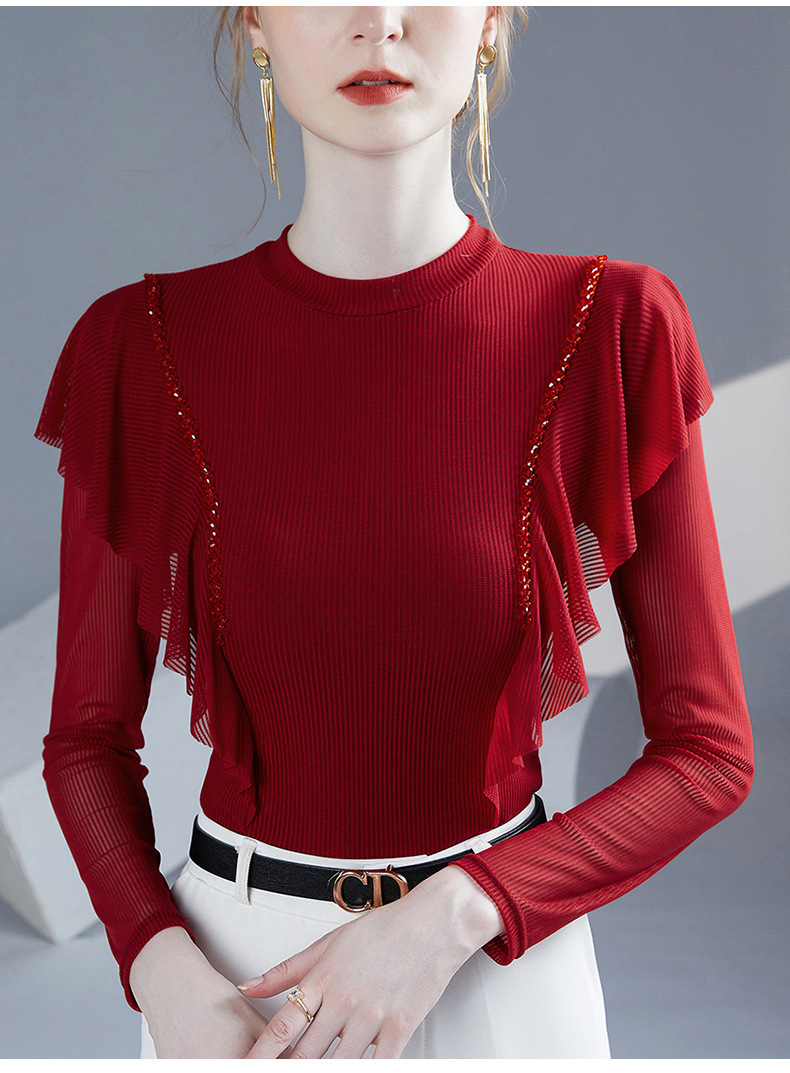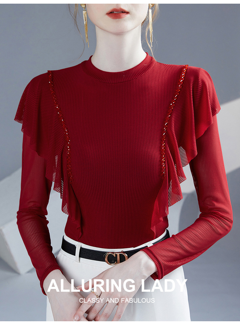 雀说新款荷叶边钉珠打底衫网纱长袖洋气时尚女上衣小衫AL36760