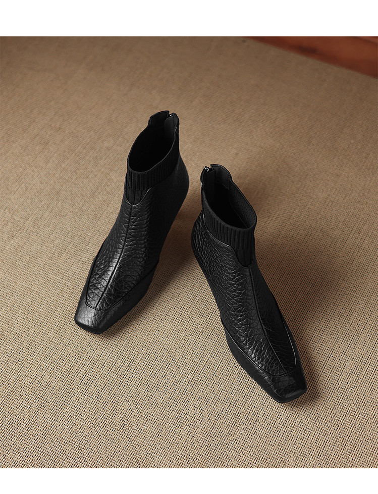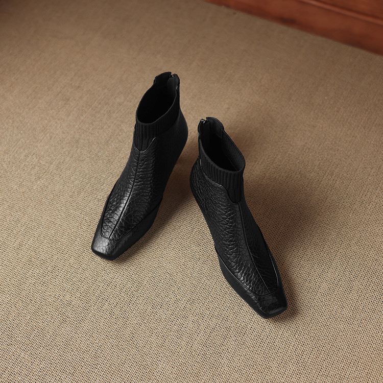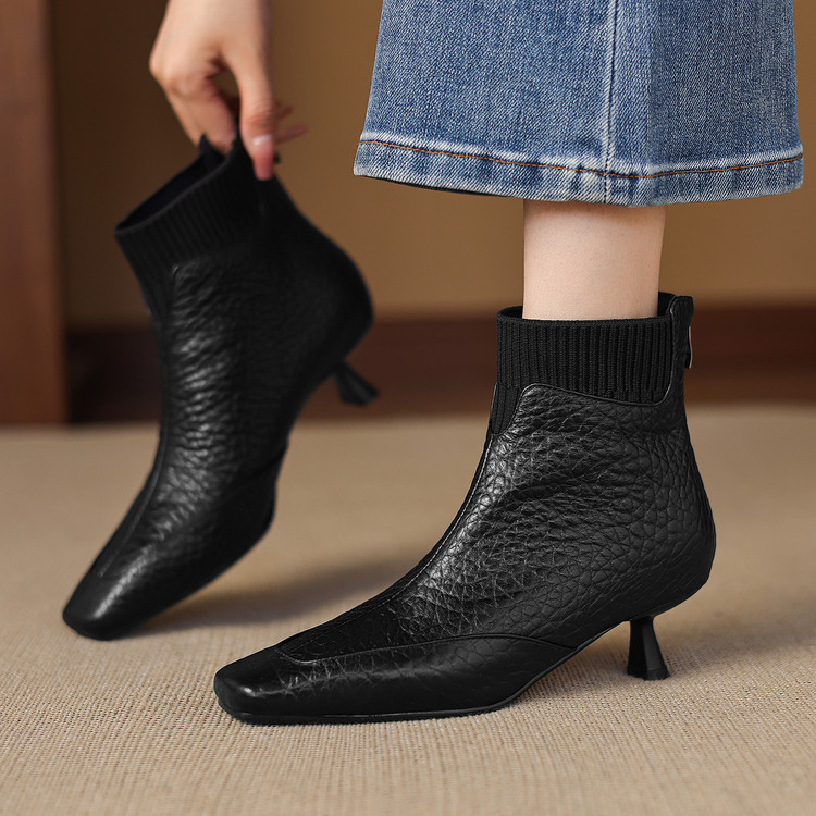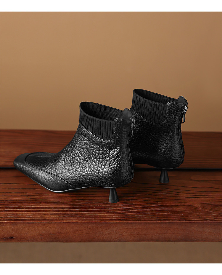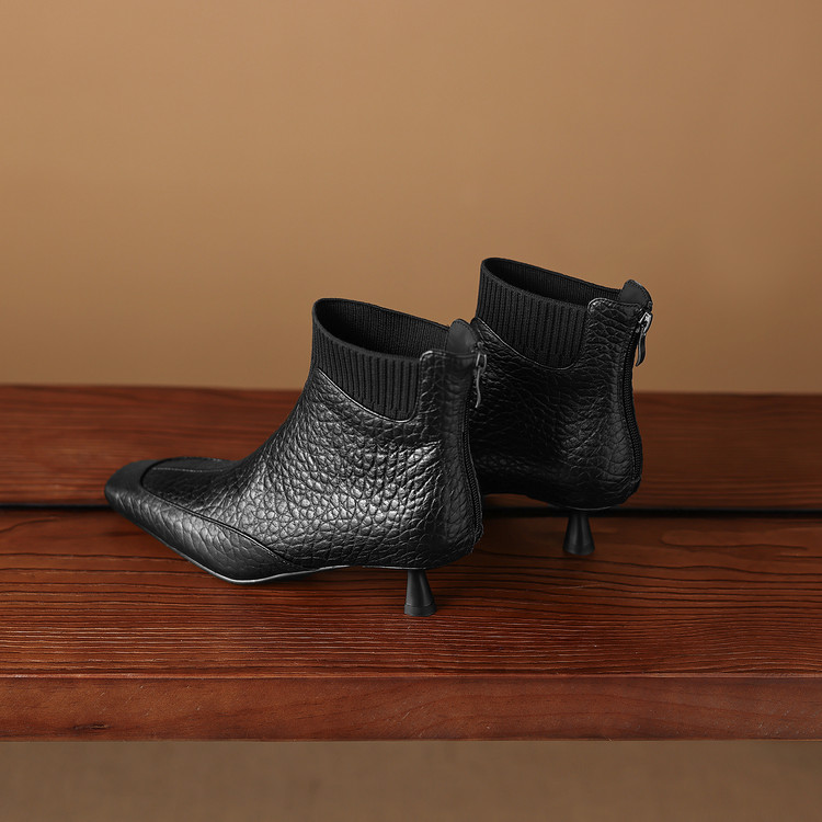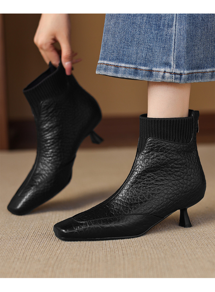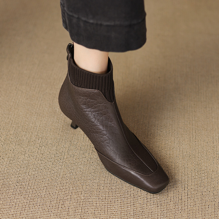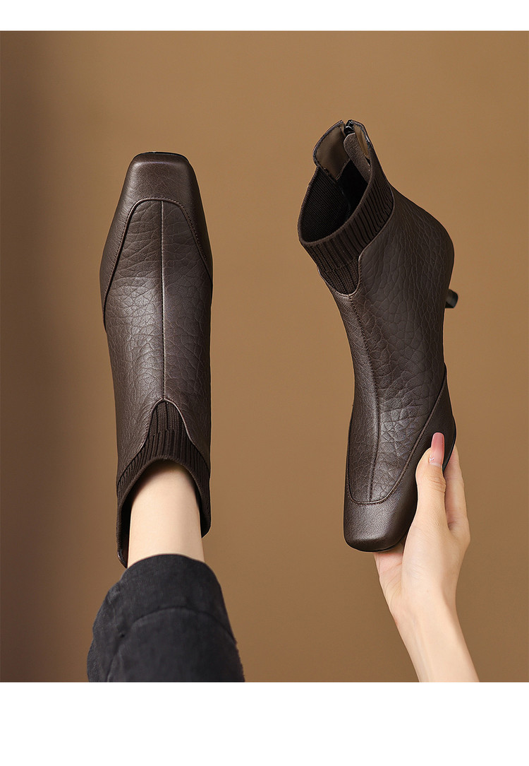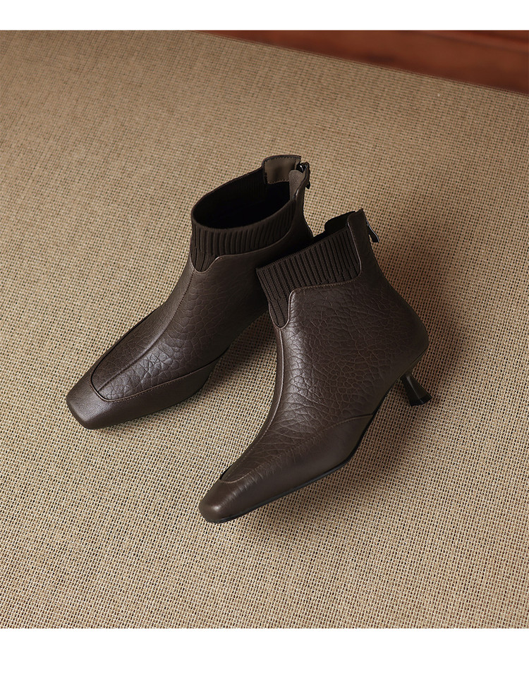 【预售5天】4.5cm牛皮尖头短靴女秋冬棕色切尔西靴子新款细跟弹力瘦瘦靴DMJFG&9558F