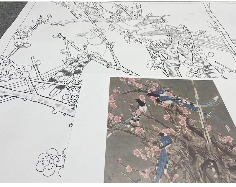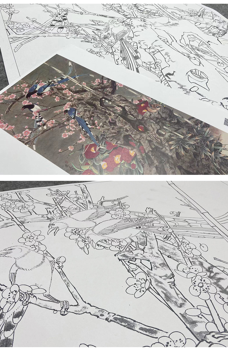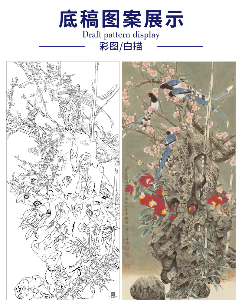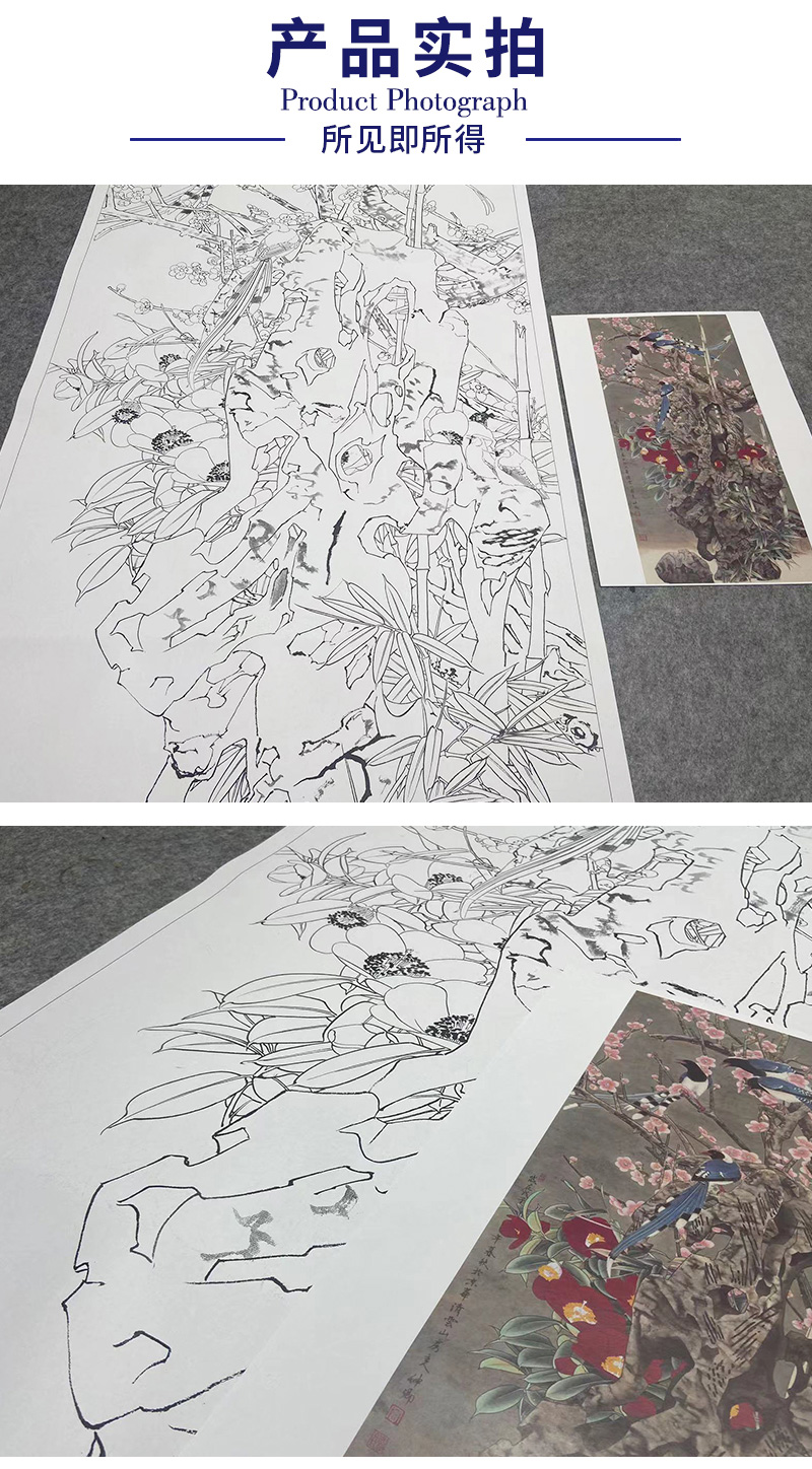 【大彩图】窦绅卿工笔画白描底稿《华堂益多图》山茶绶带鸟花鸟线稿HN08