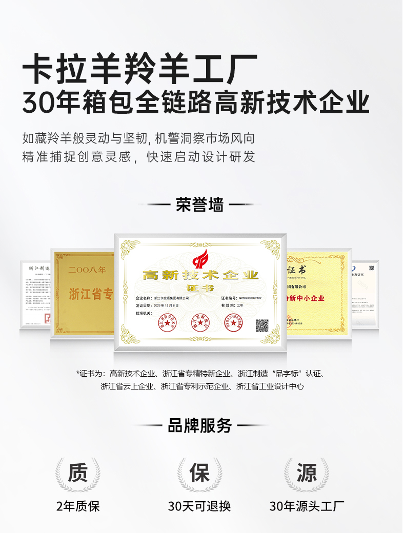 - 浙江卡拉扬集团有限公司专注箱包27年,旗下有卡拉羊和9UM两大品牌,有浙江海宁和江苏沭阳两大工厂,拥有多项知识产权,是集智能化、设计生产、品牌营销为一体的综合型企业。