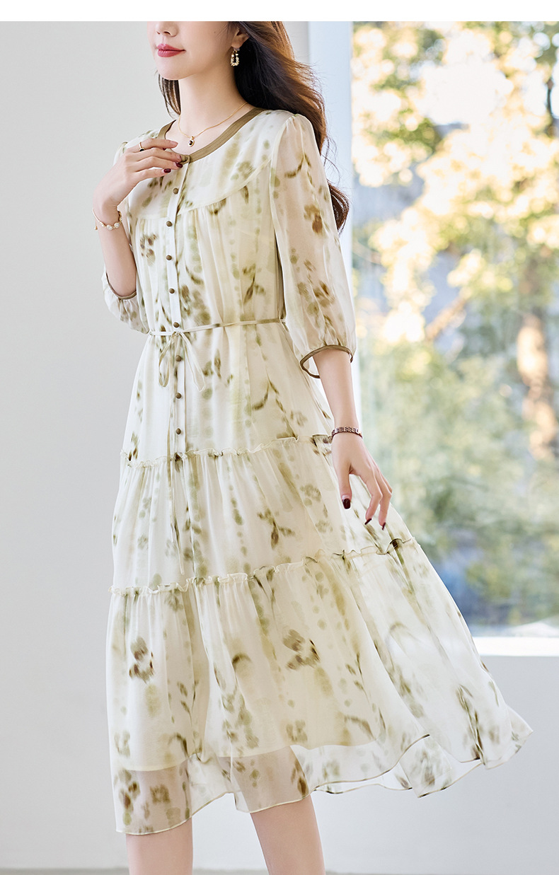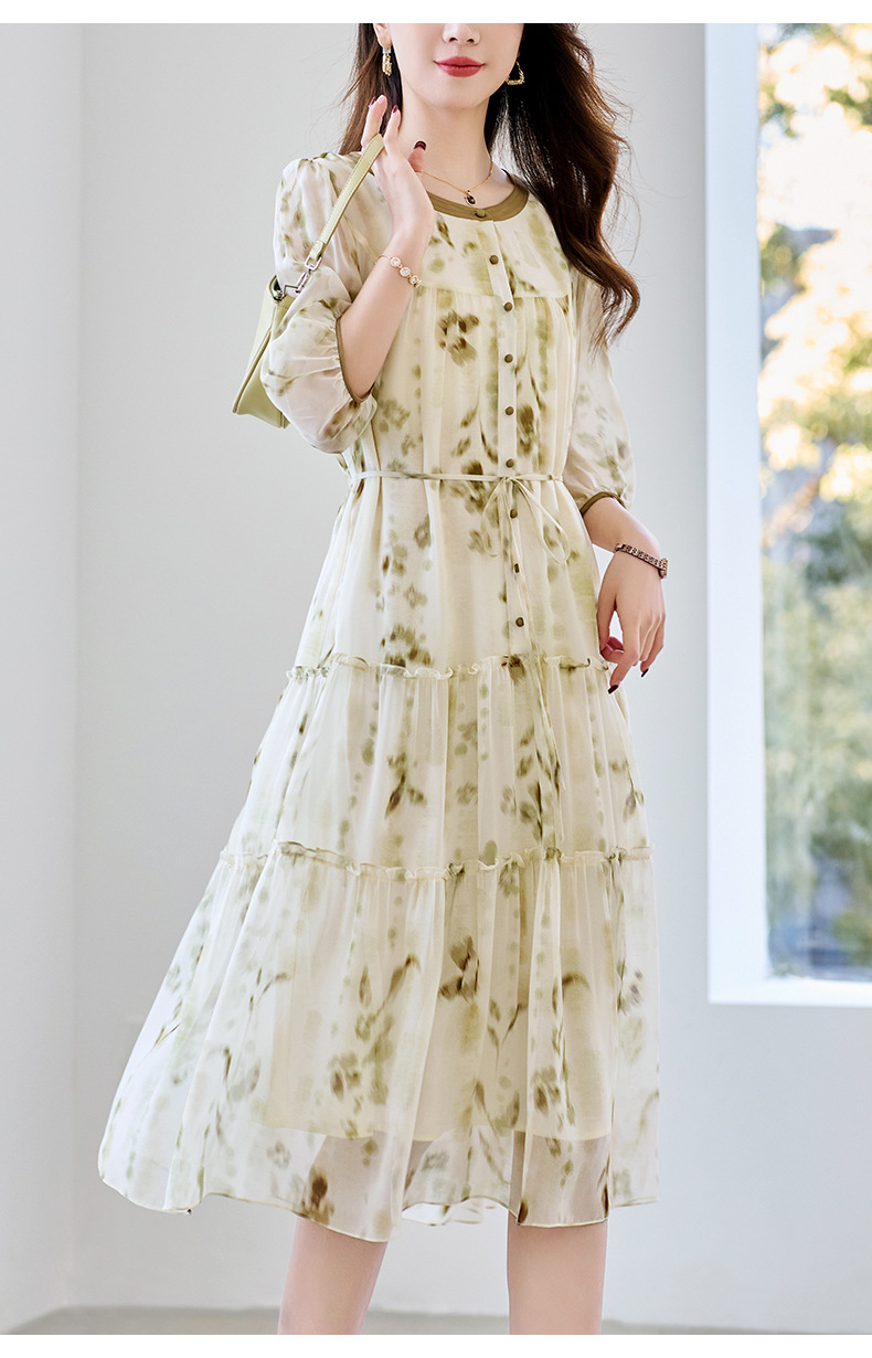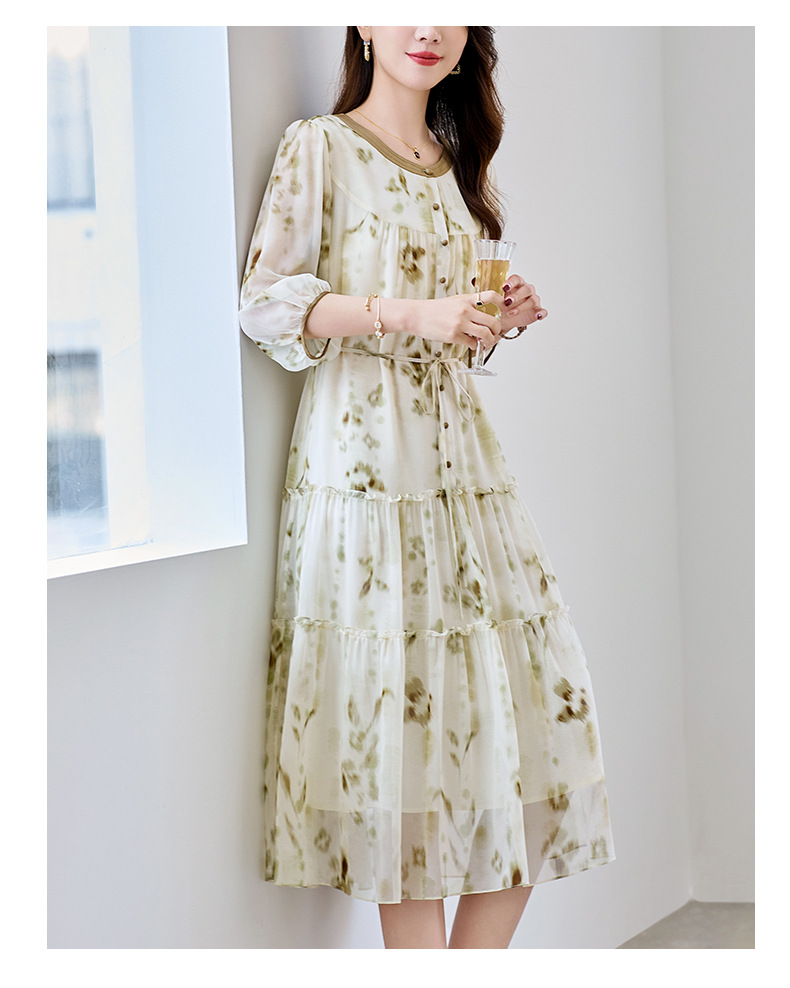 SM 82496900乔其真丝连衣裙时尚印花系带收腰桑蚕丝裙 商品图1