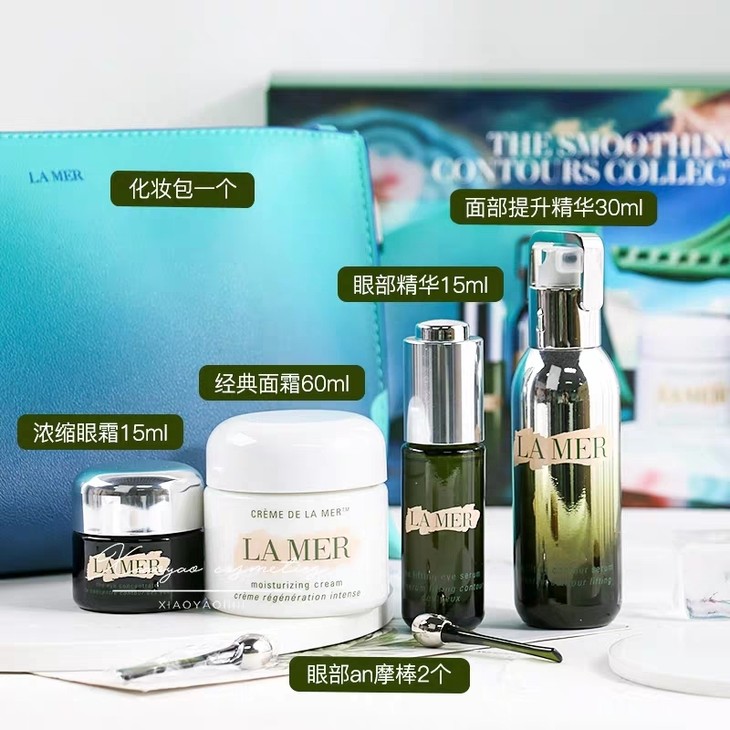 LA MER新款超值四件套裝👍重磅套盒又来啦!护肤旅行四件套,出行护肤首选,全方位呵护你的肌肤,还配有化妆包👛,方便携带,真的太贴心了~ 旅行疲惫,肌肤容易松弛,这时有塑颜精华就不怕了💖。啫喱状的质地涂抹后变为液体,吸收后有即时拉紧的感觉,🍡除了有专利的活性精萃Miracle Broth,还添加了酵素成分,能刺激肌肤自身的胶原蛋白新生,⬆提升肌肤的密度,面部立体感和线条;去再干燥的地方有经典面霜也无所畏惧,💦保湿、滋润、修护角质层、抗过敏、缩小毛孔,通通不在话下,✨还能改善肌肤,对淡化疤痕、暗疮印、斑点都有很好的效果~谁用谁知道;🛥旅行难免舟车劳顿,睡眠质量难保,这时眼部肌肤就容易变差,眼霜和眼部精华的出场机会来了~👣深层并舒缓脆弱的眼周肌肤,改善黑眼圈,清除浮肿,抚平细纹,还富含磁化矿石🎐,能让眼周肌肤充满活力。补水能力超凡,瞬间平滑眼部肌肤,提拉紧致,👀坚持使用你就能拥有一双blingbling的眼睛。 套装包括:提升塑颜精华30ml+焕活眼部精华15ml+经典面霜60ml+浓缩修护眼霜15ml+眼部按摩棒2个+化妆包一个