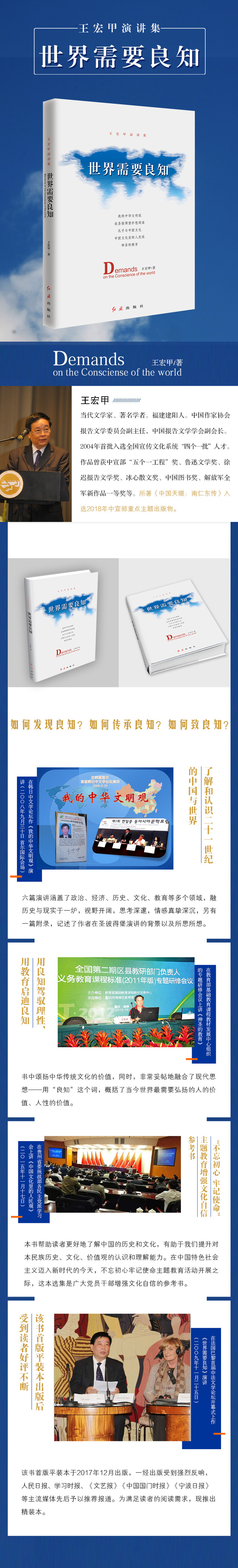 《世界需要良知:王宏甲演讲集》汇集了作者从2004年至2017年的6篇演讲稿。作者在多个国际学术论坛上,通过讲述一个历史故事,介绍一部中国典籍,或者阐释一个古老汉字,征引一句中国成语,向世界展示中国人的文化自信,阐述中国传统智慧的当代价值,表达中国人参与世界文明发展的积极精神。
