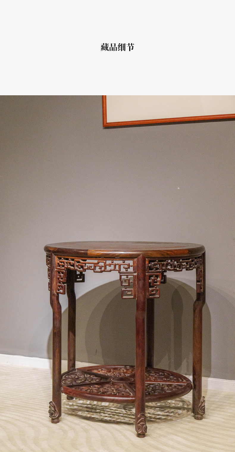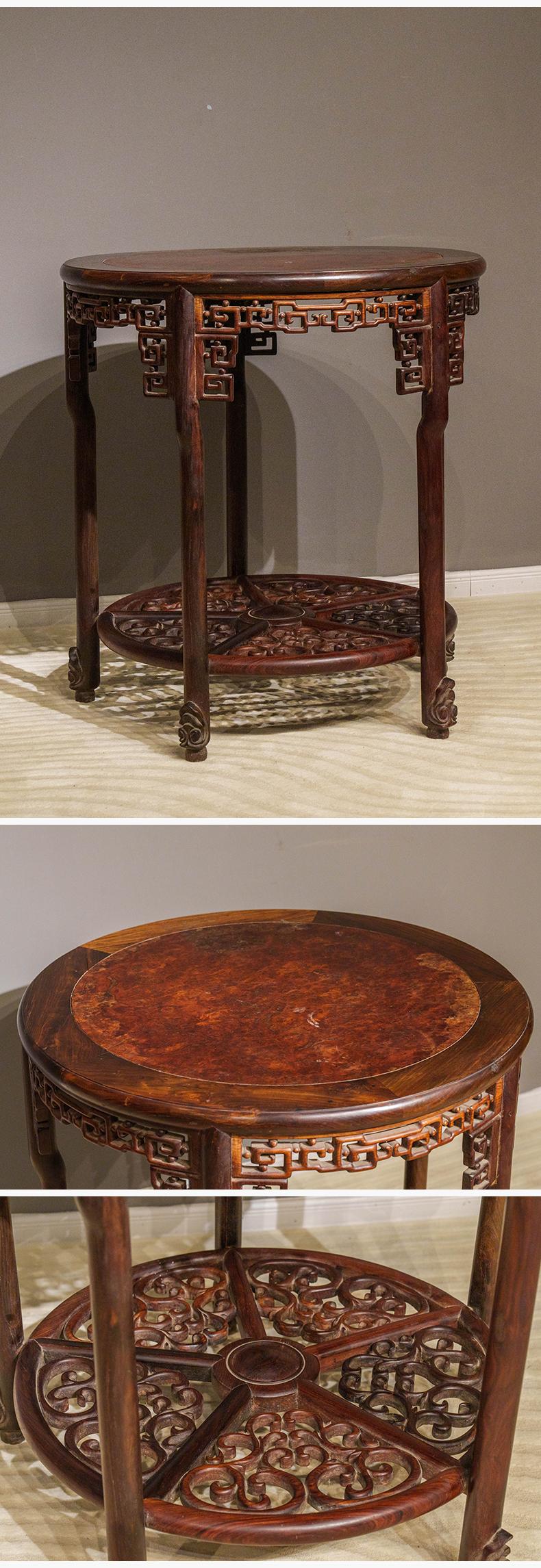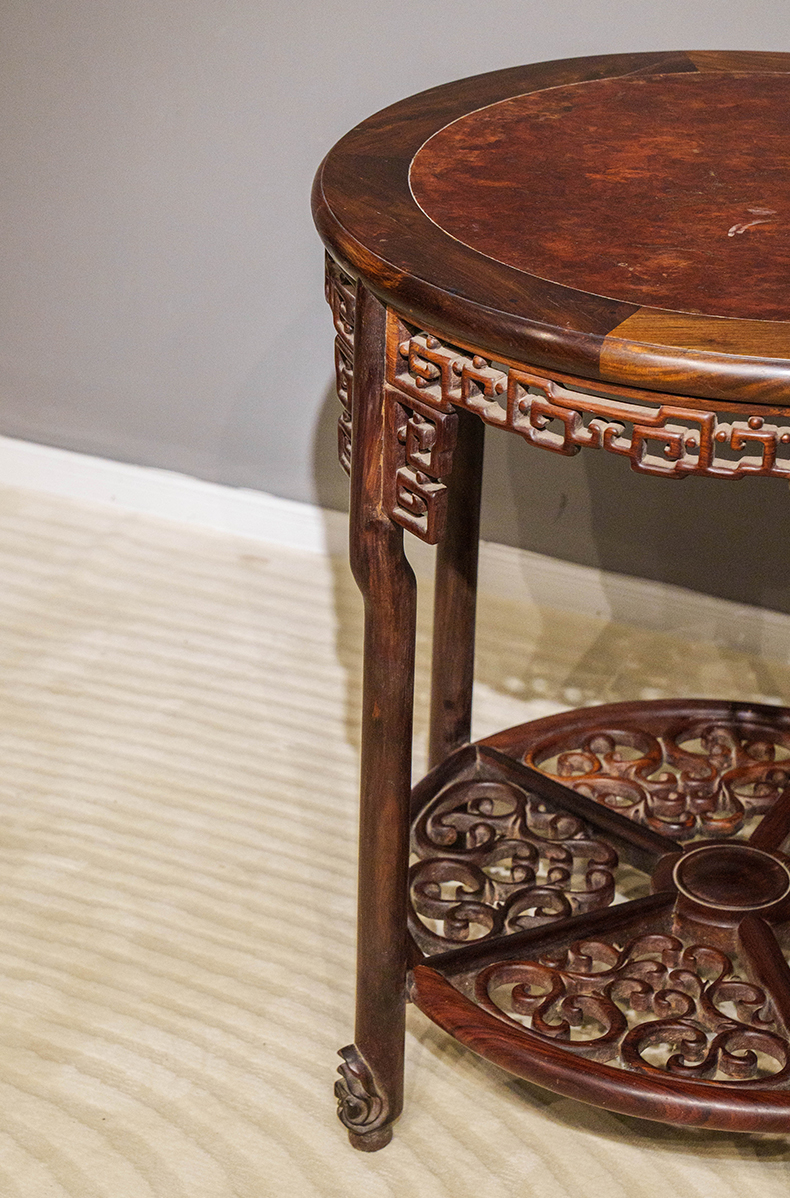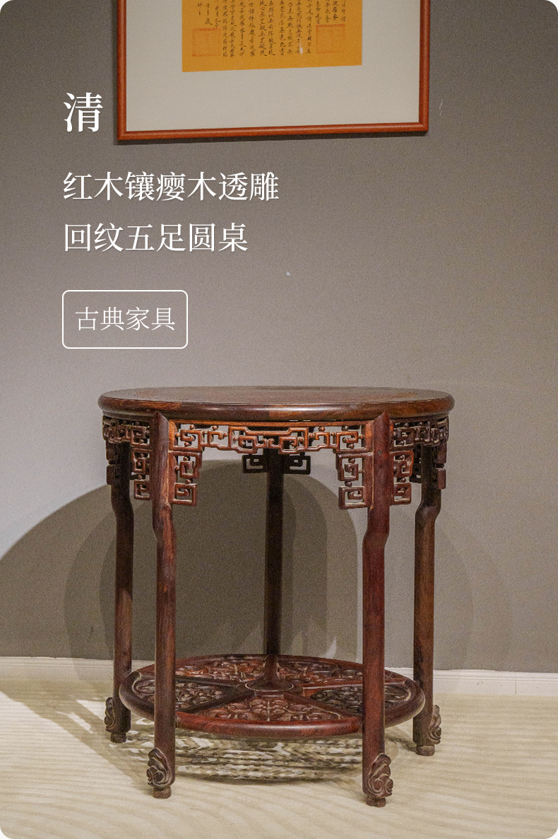 清 红木镶瘿木透雕回纹五足圆桌