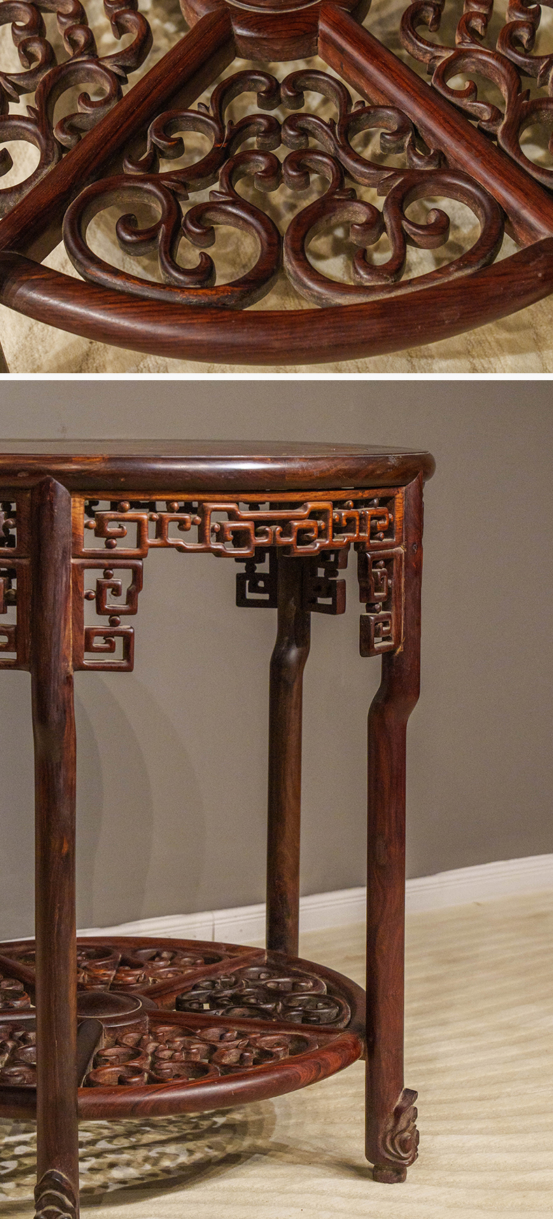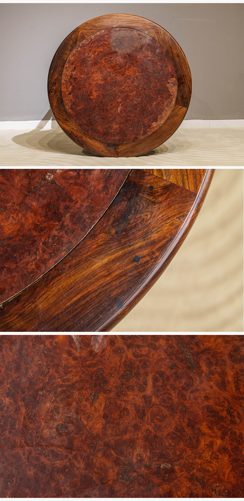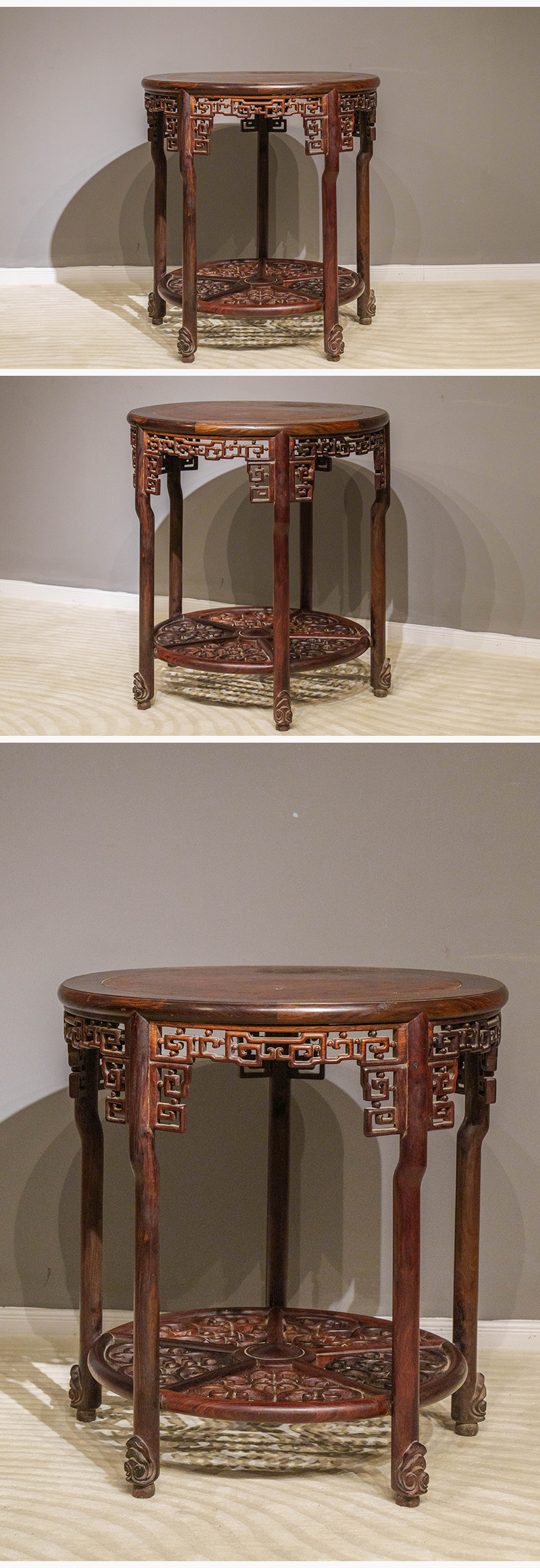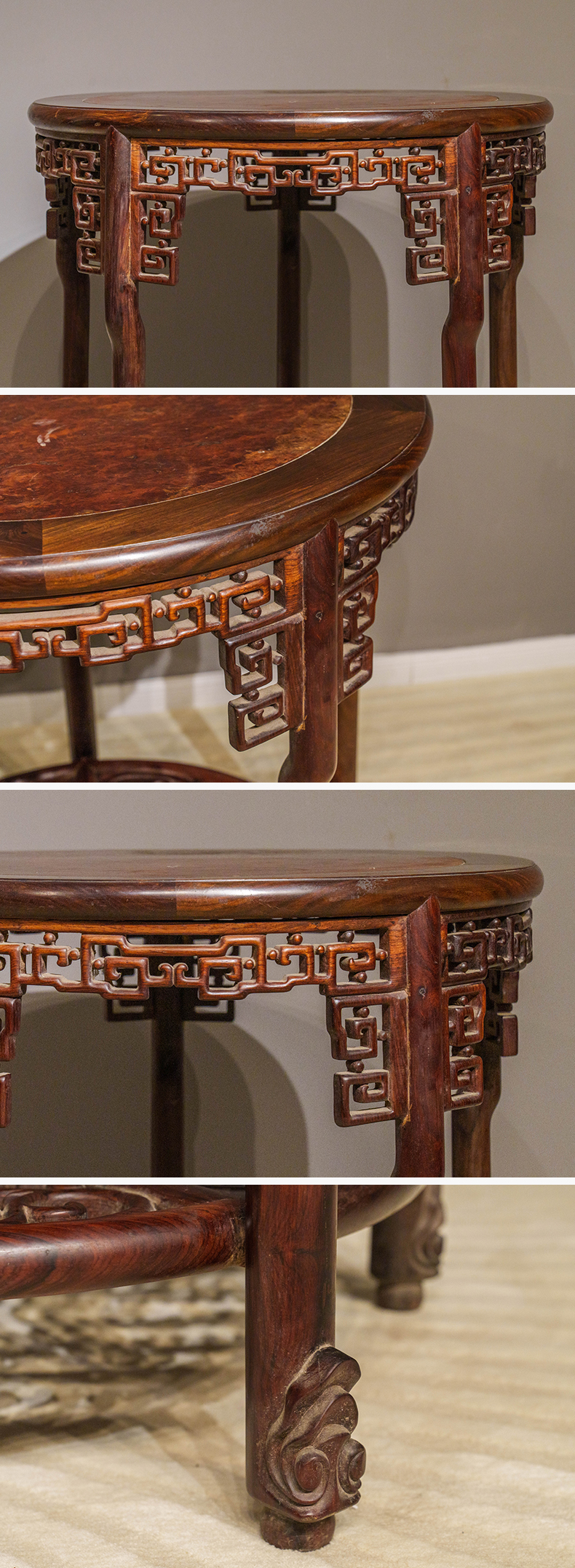 清 红木镶瘿木透雕回纹五足圆桌