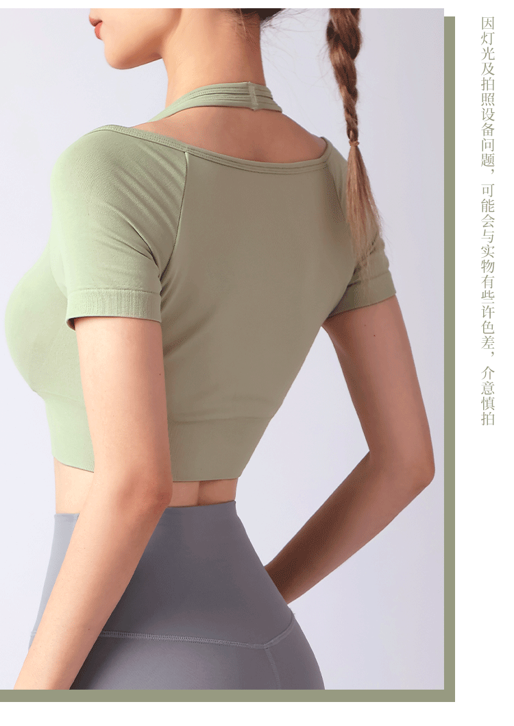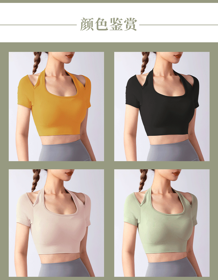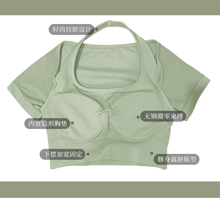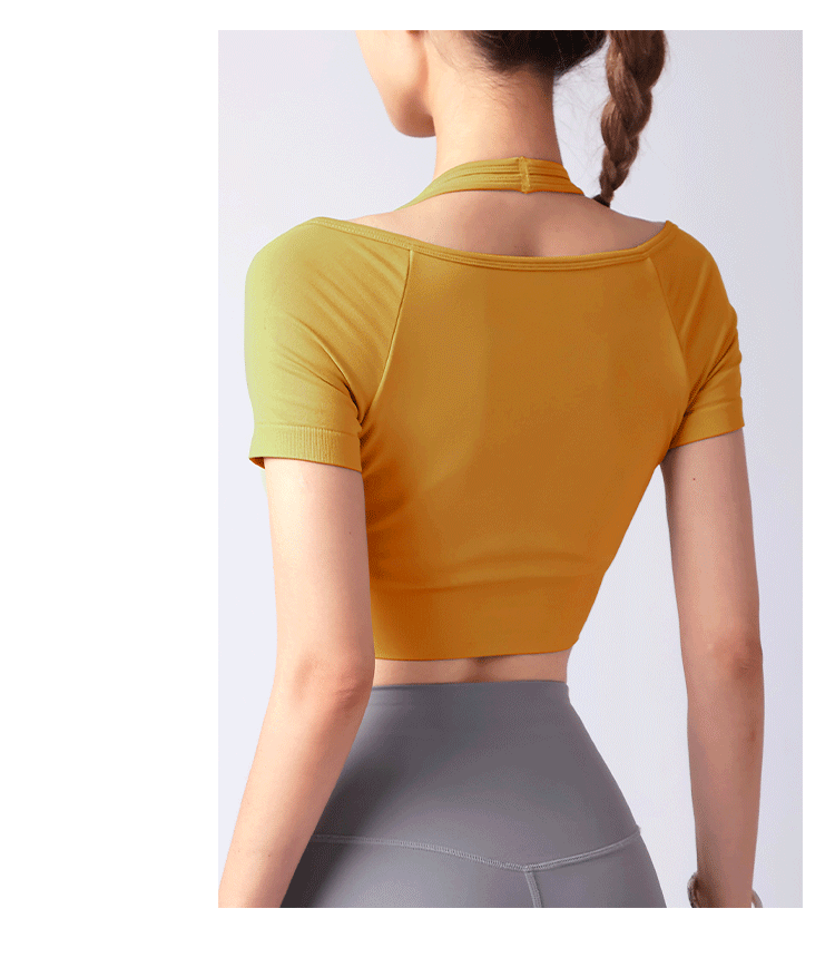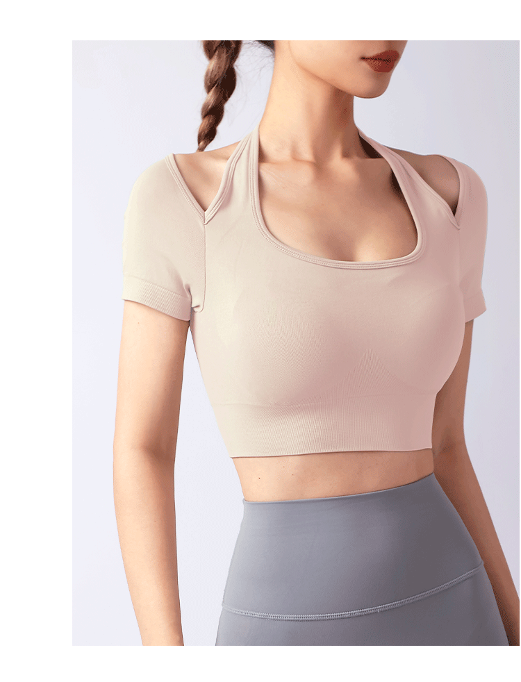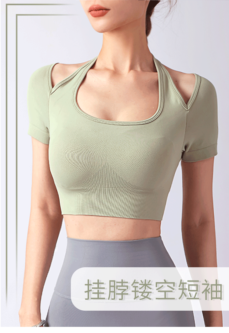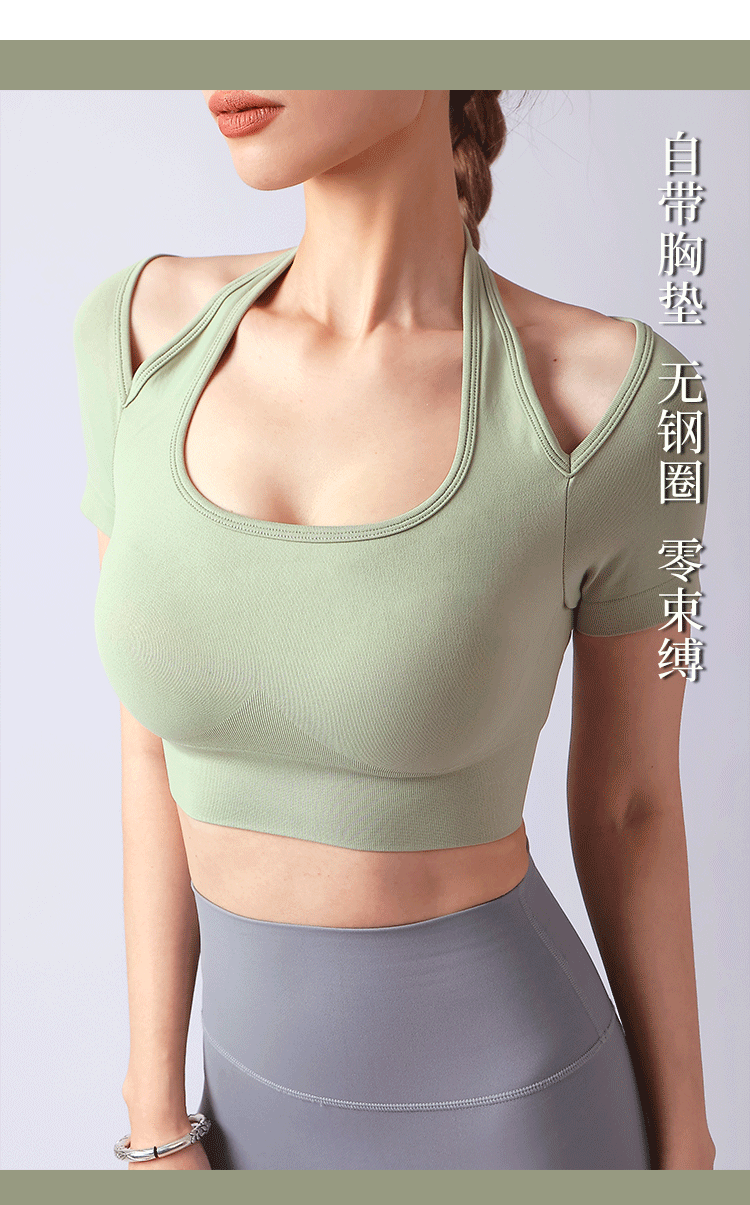 跃牌【美西西系列】夏季新款带胸垫瑜伽上衣运动短袖休闲修身显瘦辣妹T恤挂脖文胸DX-028