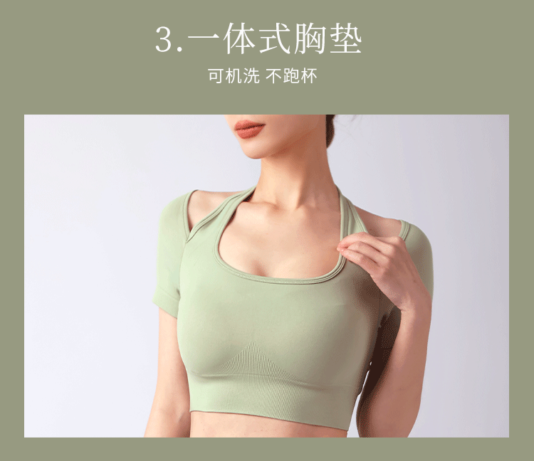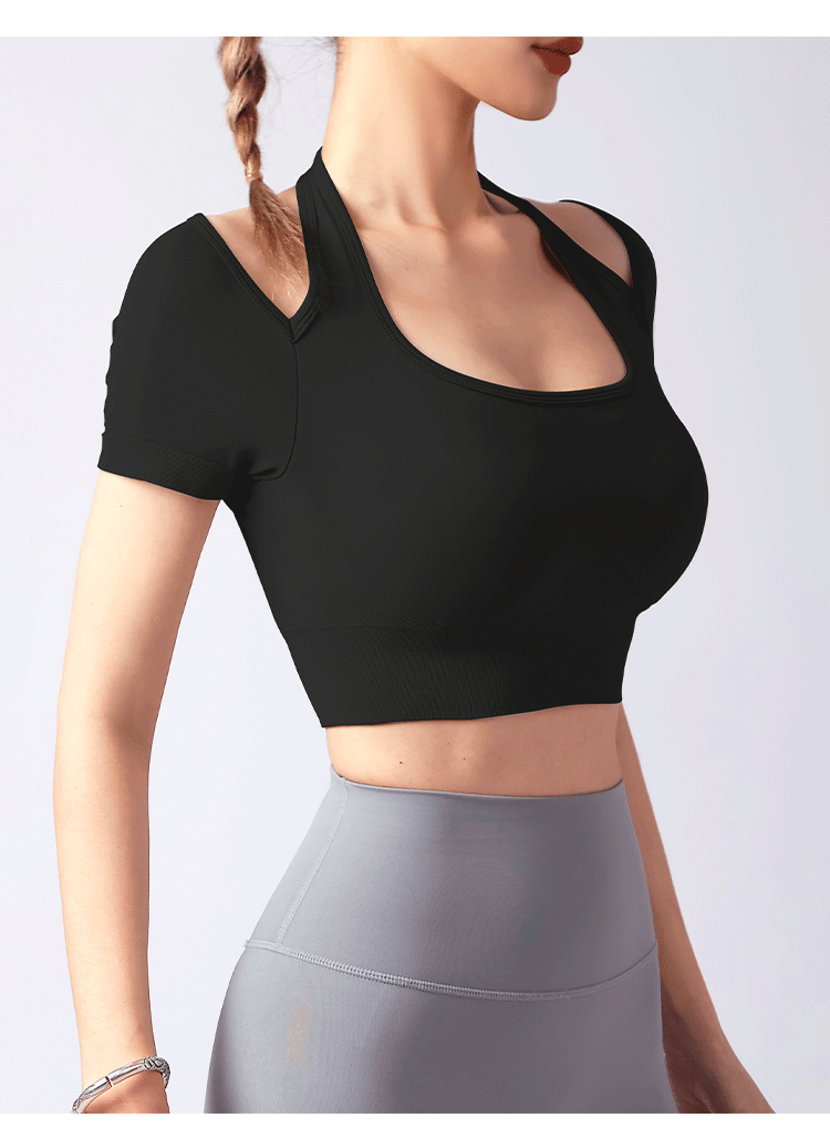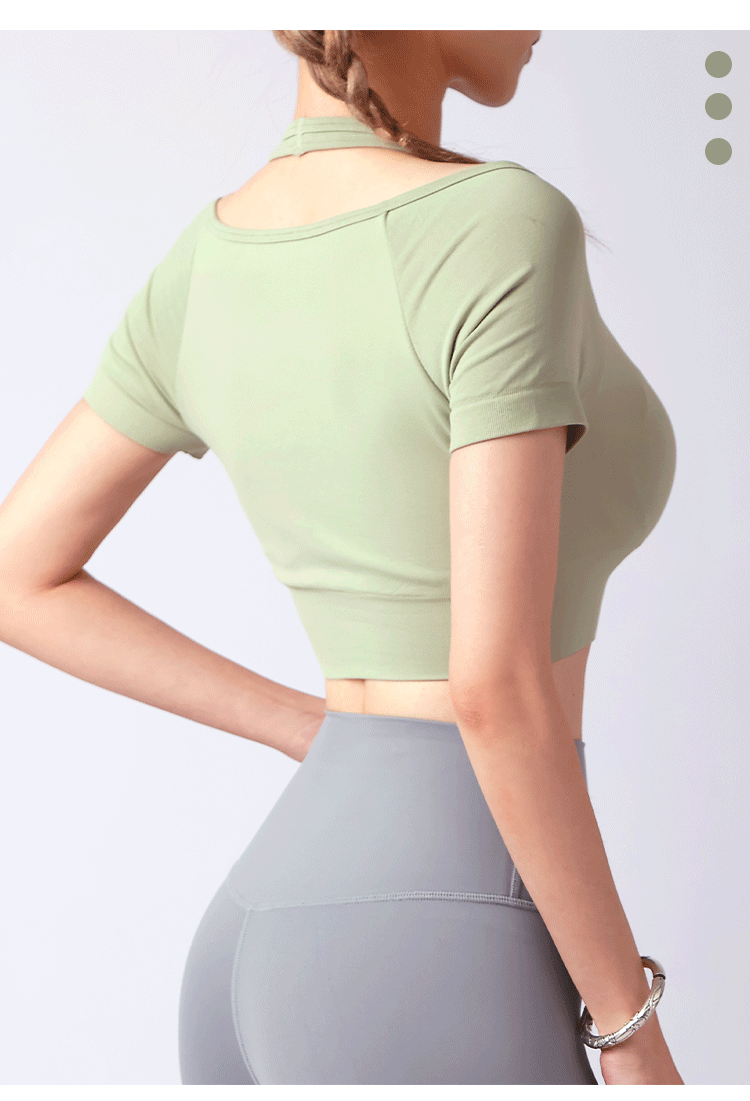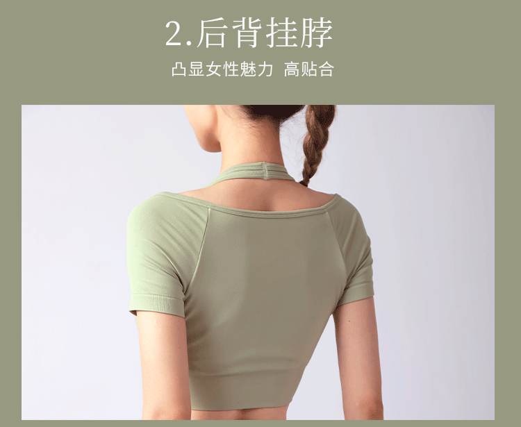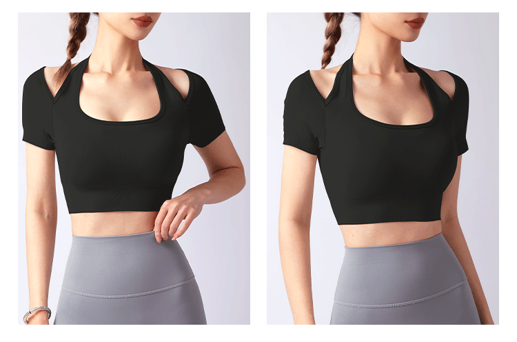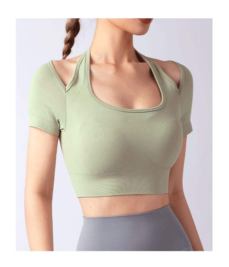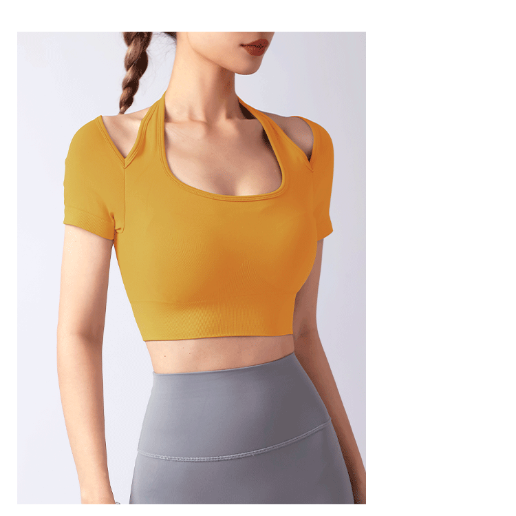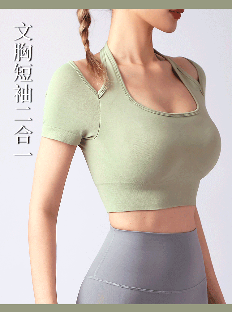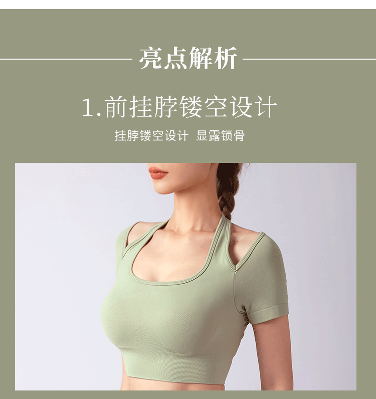 跃牌【美西西系列】夏季新款带胸垫瑜伽上衣运动短袖休闲修身显瘦辣妹T恤挂脖文胸DX-028