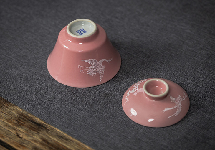 碗身与碗盖上皆以堆白工艺呈现祥云、仙鹤的图样。