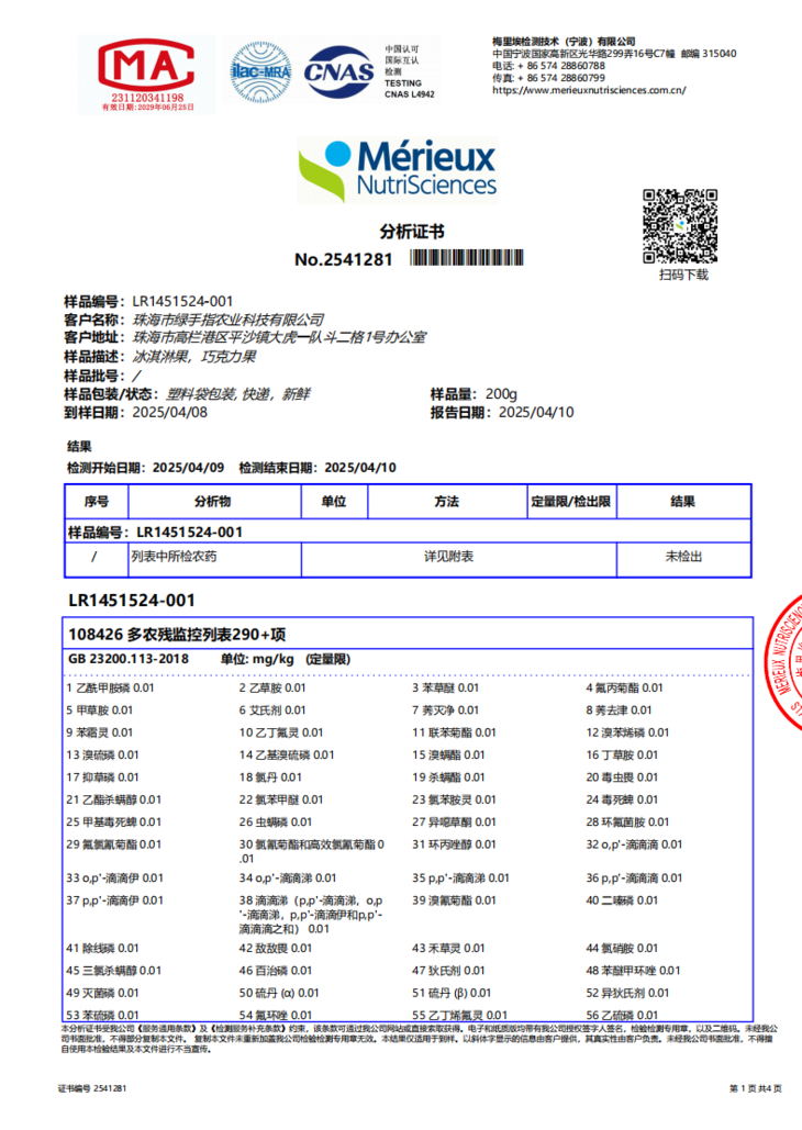 今年4月份的时候基地走访,园子里种植了百香果、冰淇淋果和巧克力果,都是取得了有机认证,当时因为百香果还没有产果,就采样送检了园子里的冰淇淋果和巧克力果,农残没有检出。