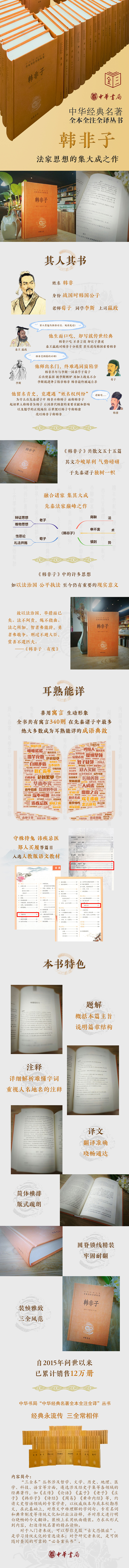 《韩非子》是先秦法家集大成之杰作,是我国古代政治学方面的名著,在古代哲学、文学史上也享有盛誉。韩非的文锋犀利,议论透辟,推证事理,切中要害。值得一提的是,书中记载了大量脍炙人口的寓言故事,如“自相矛盾”、“守株待兔”、“讳疾忌医”、“滥竽充数”等,至今仍给人以深刻的启迪。