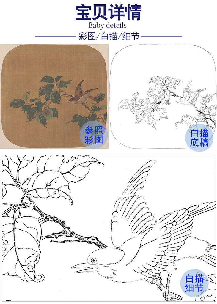 工笔画白描底稿明清花鸟小品-《折枝青桃山雀图》-多种白描尺寸可选-MQ11