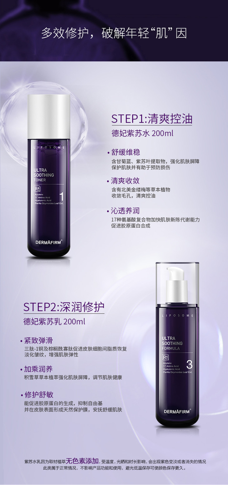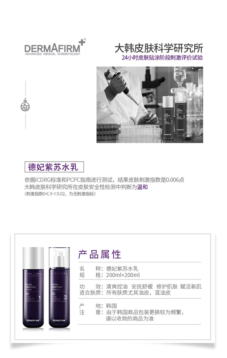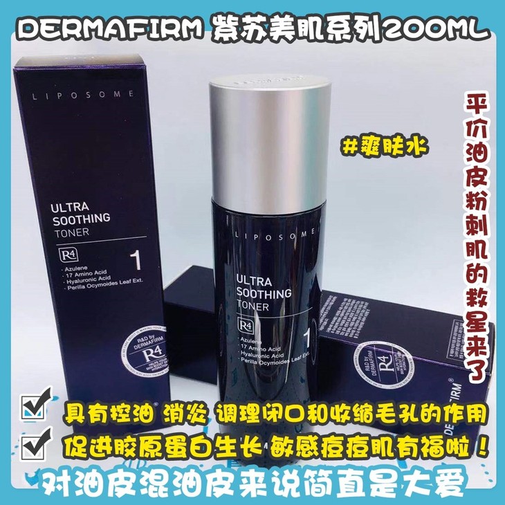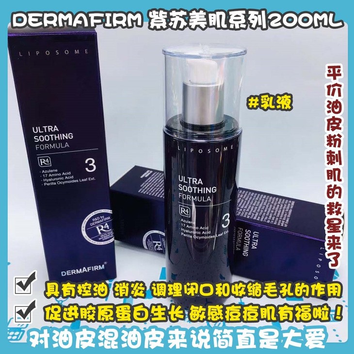 DERMAFIRM 紫苏美肌系列200ML#爽肤水/#乳液👍平价油皮粉刺肌的救星来了❗❗❗DERMAFIRM德妃是韩国🇰🇷医疗护肤品牌,还添加了获得过诺尔贝奖的成分👏,用于帮助修护受损肌肤💆,促进胶原蛋白生长🥚,敏感痘痘肌有福啦🤩!紫苏本身具有控油、消炎、调理闭口和收缩毛孔的作用😇,再配合薰衣草的舒缓💜,敏感红血丝会慢慢消失哦🌬~皮肤发热泛红时,搭配化妆棉把爽肤水敷在脸上发热部位2-3min立马褪红了耶😊,镇定消炎一级棒!乳液吸收完巨清爽🍃,对油皮混油皮来说简直是大爱👯,孕妇可用!