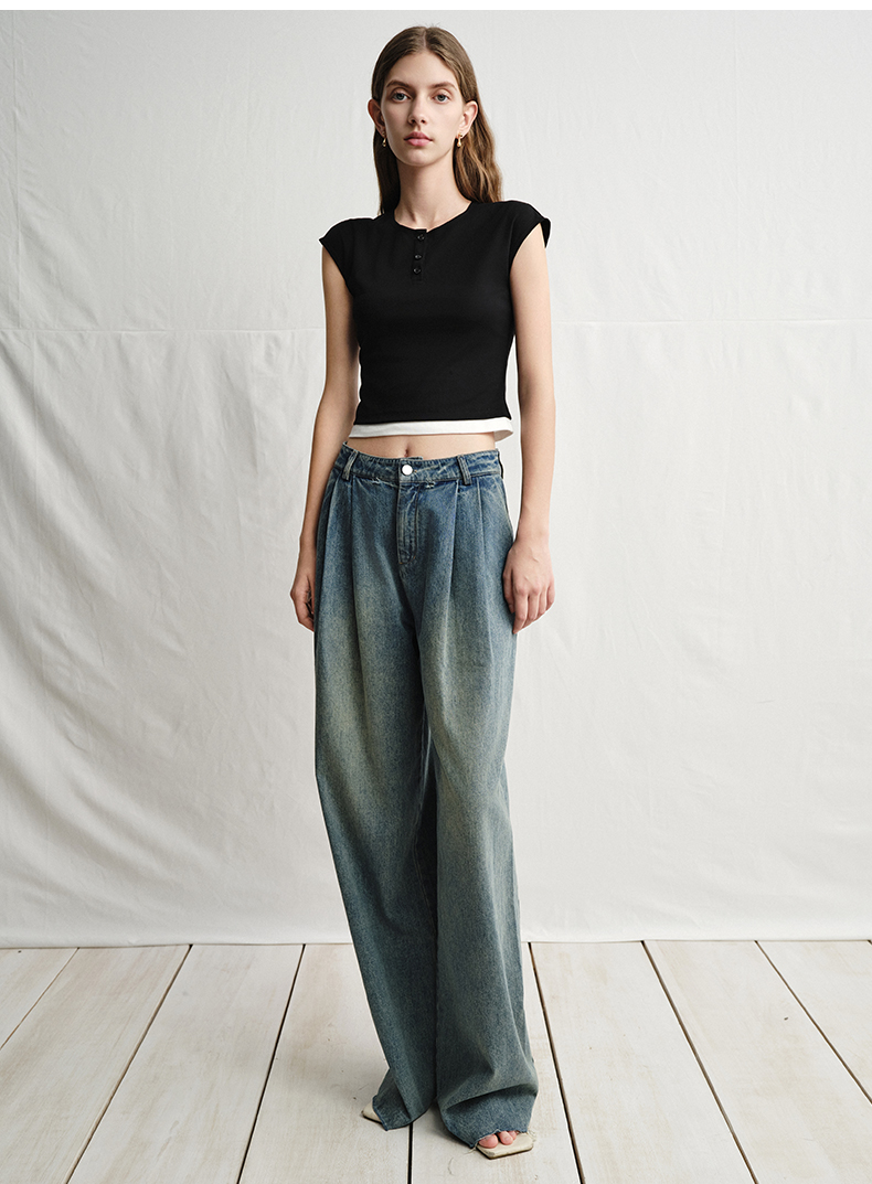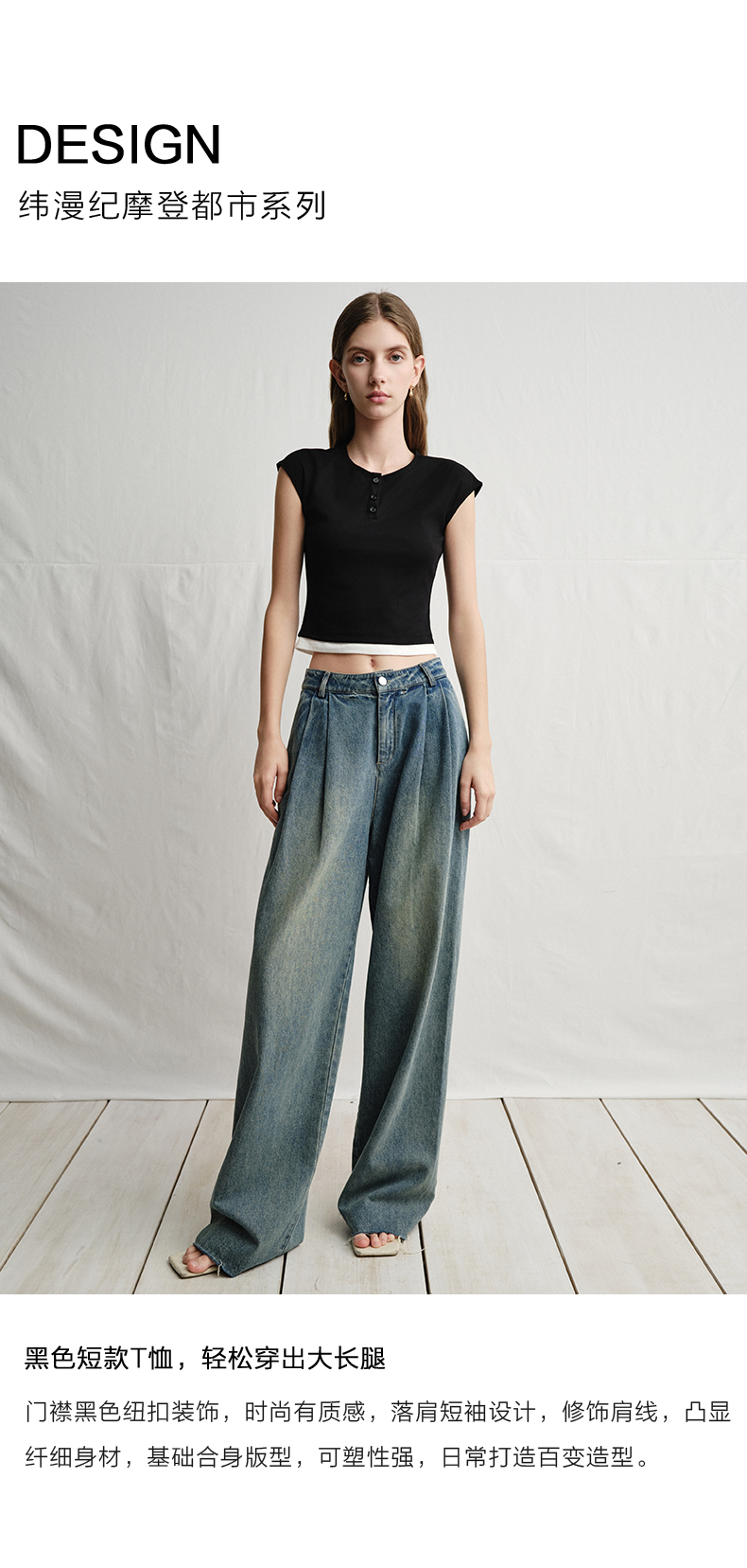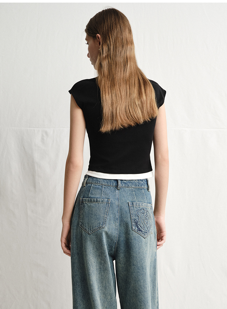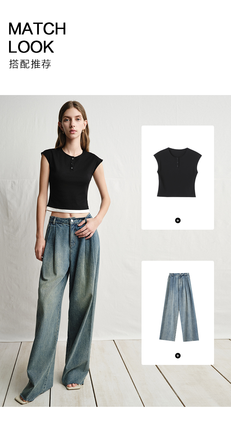 VIMAGE纬漫纪黑色短款美式辣妹简约百搭修身短袖T恤2025夏季新款V2302905