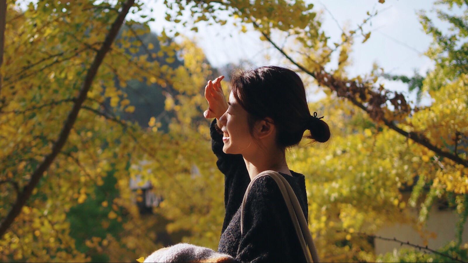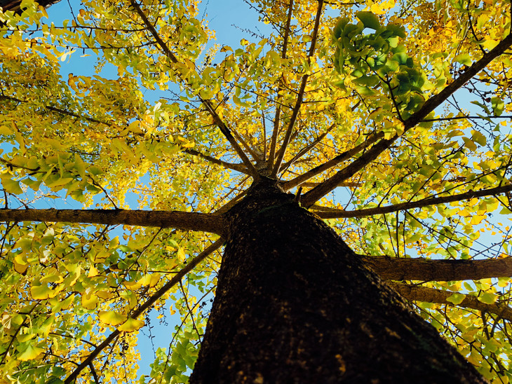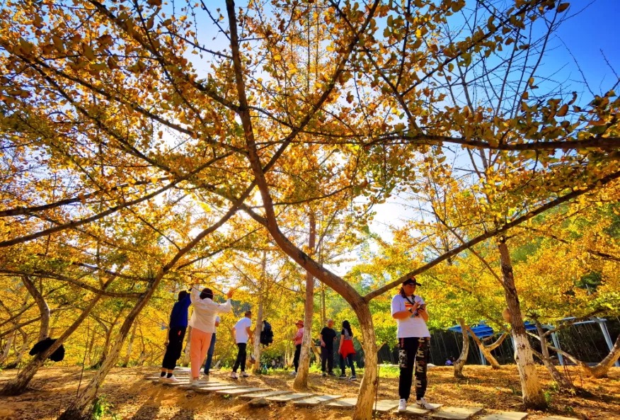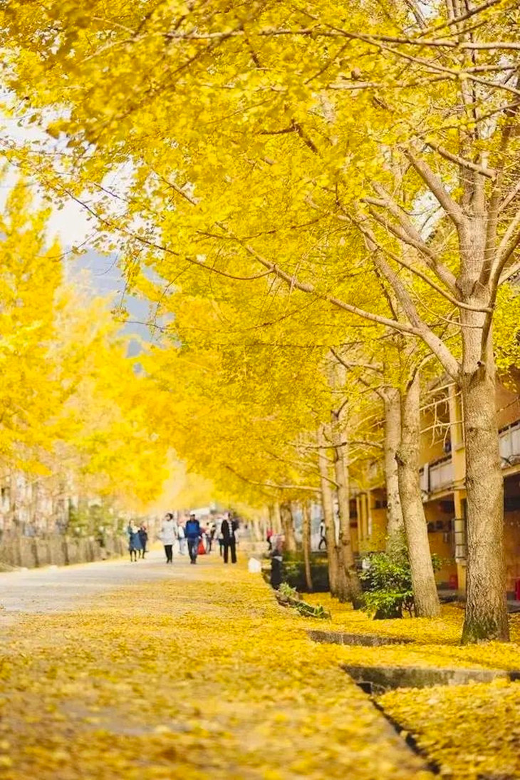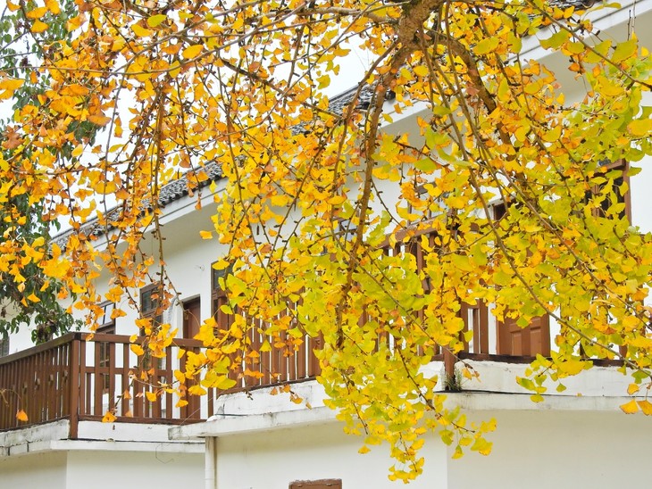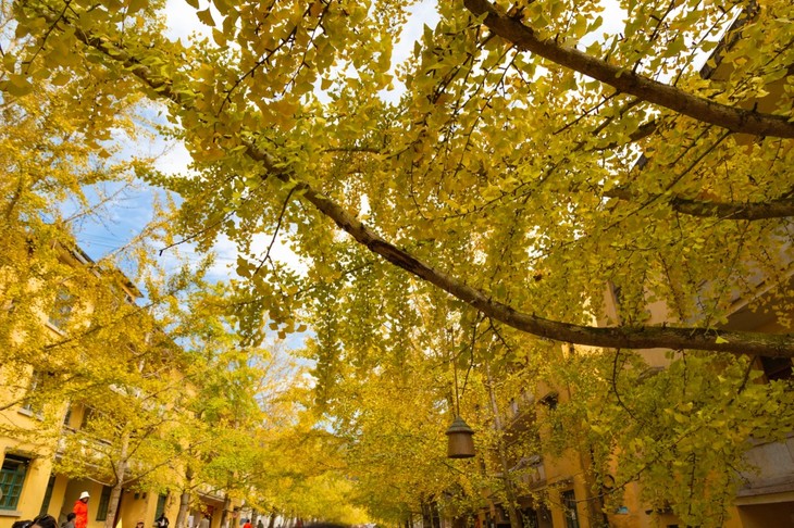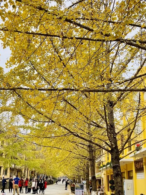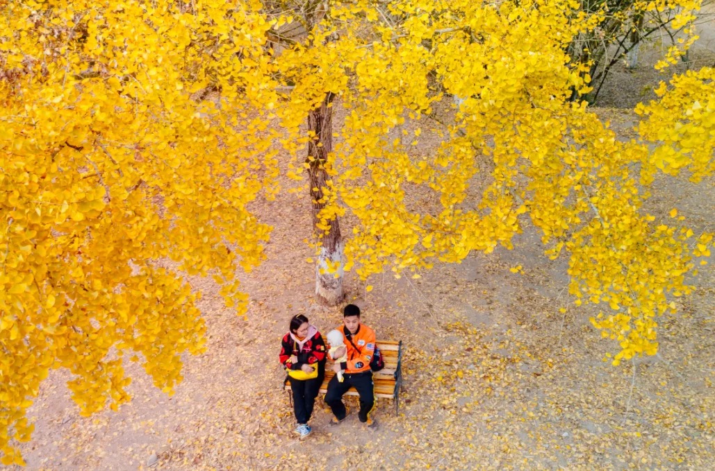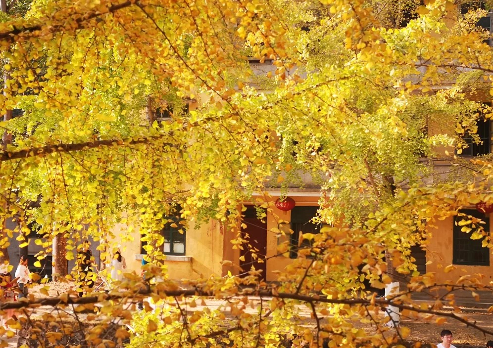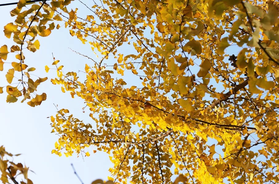 抬头望去满树的金黄,微风吹过,扇形叶子便飘洒而下,如漫天飞舞的金色蝴蝶,飘落于树下,成了一地的金黄。