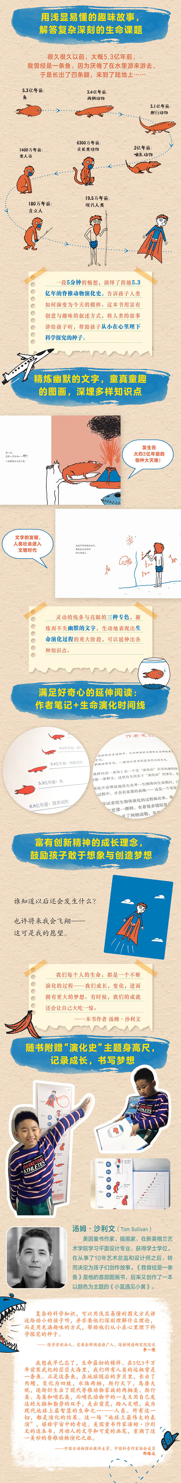 这本令人惊喜的图画书,以浅显易懂的方式解答了复杂而深刻的生命课题:在5.3亿年的脊椎动物演化历程中,人类如何演变为今天的样子?这个有点滑稽却很可爱的故事,不仅极具知识性,也是对孩子敢于想象与创造梦想的一种鼓励。