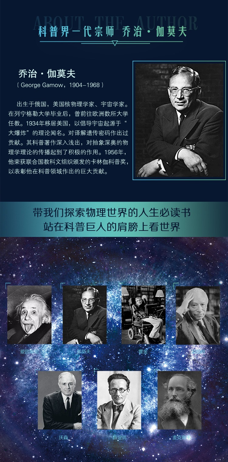 乔治•伽莫夫(George Gamow,1904-1968),1904年出生于俄国的敖德萨市,是美籍俄裔核物理学家、天文学家,也是杰出的科普学家。1928年至1932年,先后在丹麦哥本哈根大学和英国剑桥大学师从著名物理学家尼尔斯•玻尔和卢瑟福,从事研究工作。