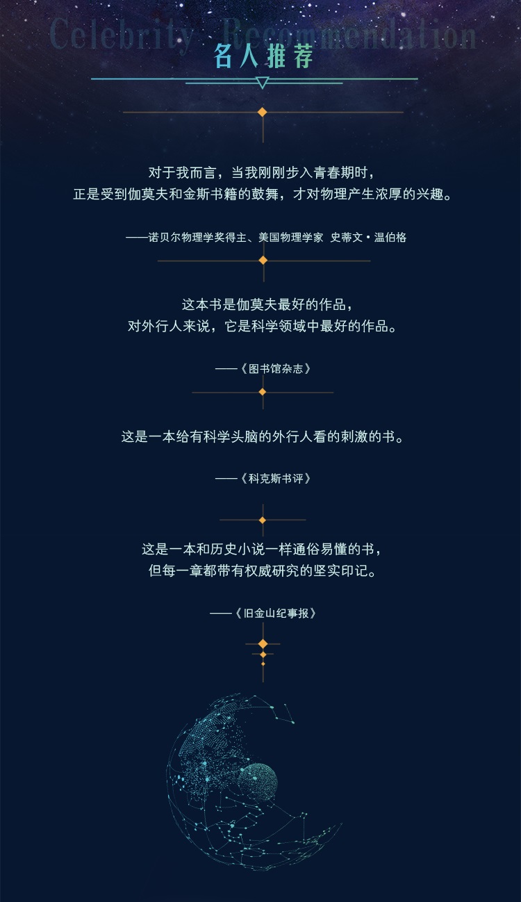 伽莫夫还是一位杰出的科普学家,在他一生正式出版的25部著作中,就有18部是科普作品。他的科普作品专业权威,把深奥抽象的物理学理论深入浅出地呈现给读者。他的多部作品风靡全球,其中有:《从一到无穷大》《物理世界奇遇记》《太阳的生与死》《地球简史》《从伽利略到爱因斯坦:伟大物理学家的故事》《给孩子讲万有引力》《给孩子讲量子力学》 等。1956年,他荣获联合国教科文组织颁发的卡林伽科普奖。