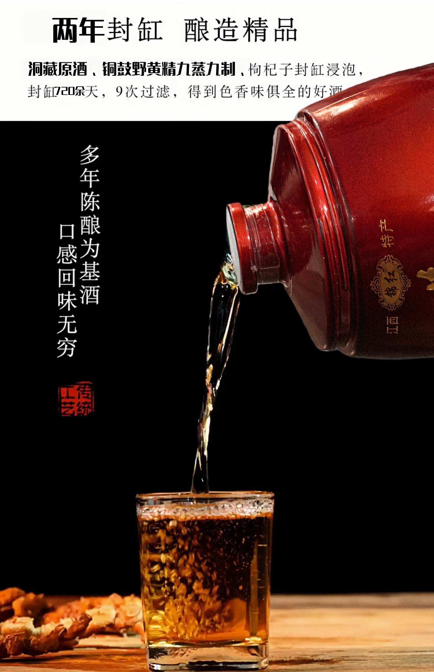 (上图)经过24个月的发酵,九蒸九制的黄精和酒完美的融合,就是新的生命,她叫黄精酒。