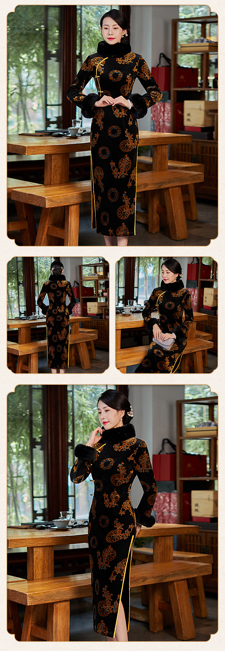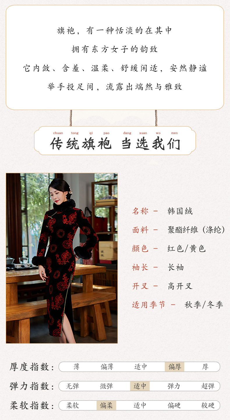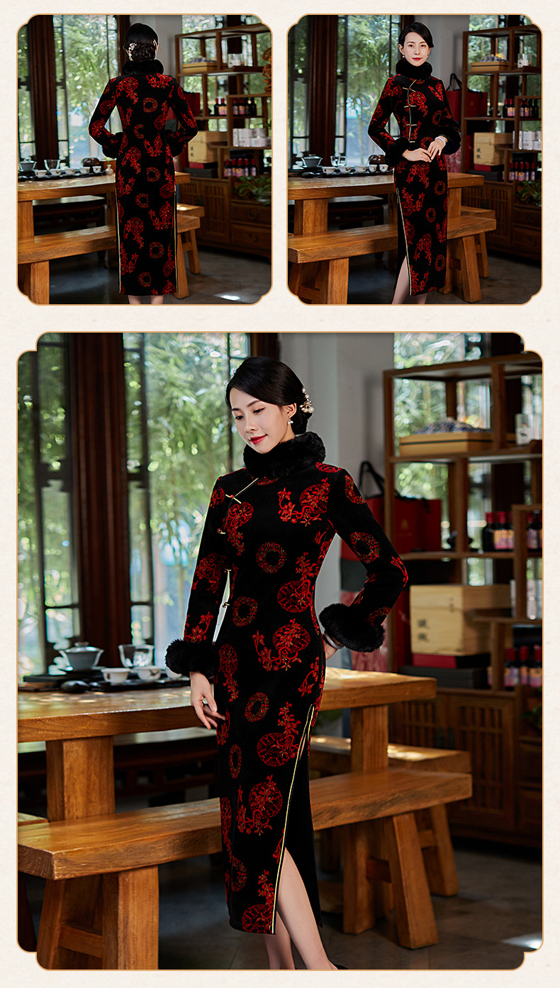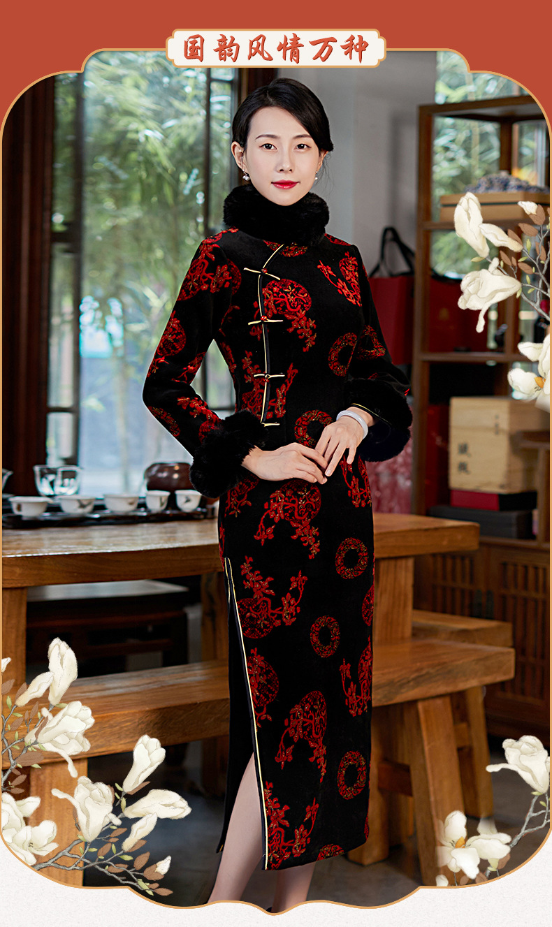 上海旗袍厂BJ-21100秋冬新款韩国绒长款毛领旗袍 复古修身改良旗袍连衣裙