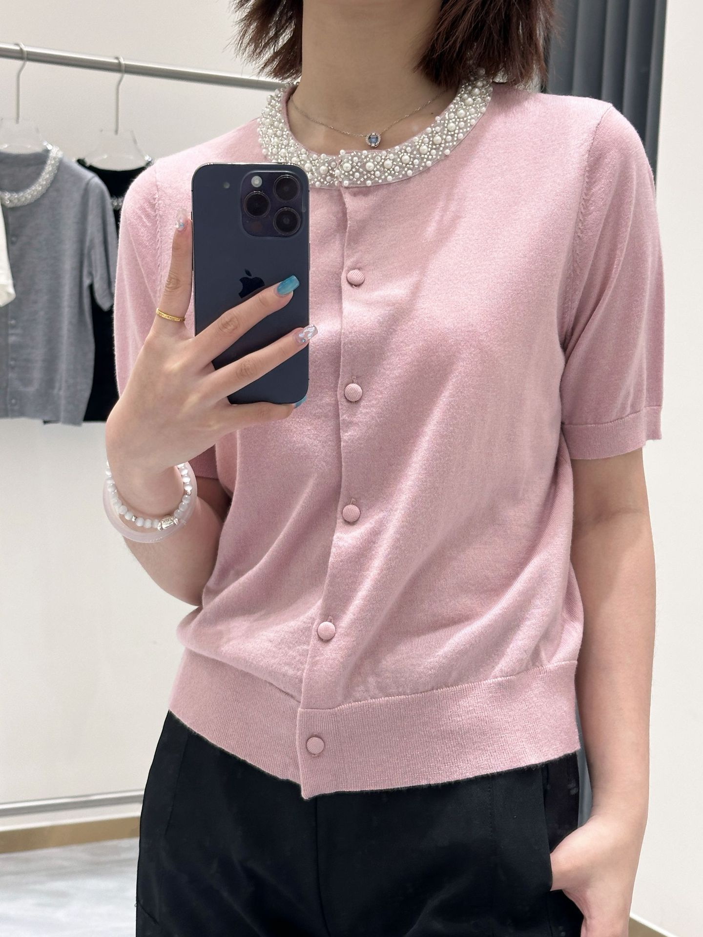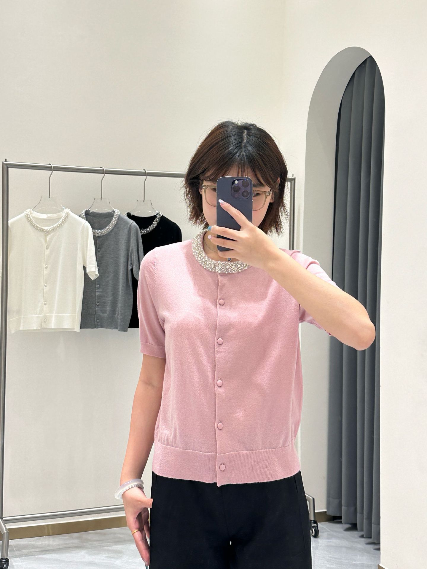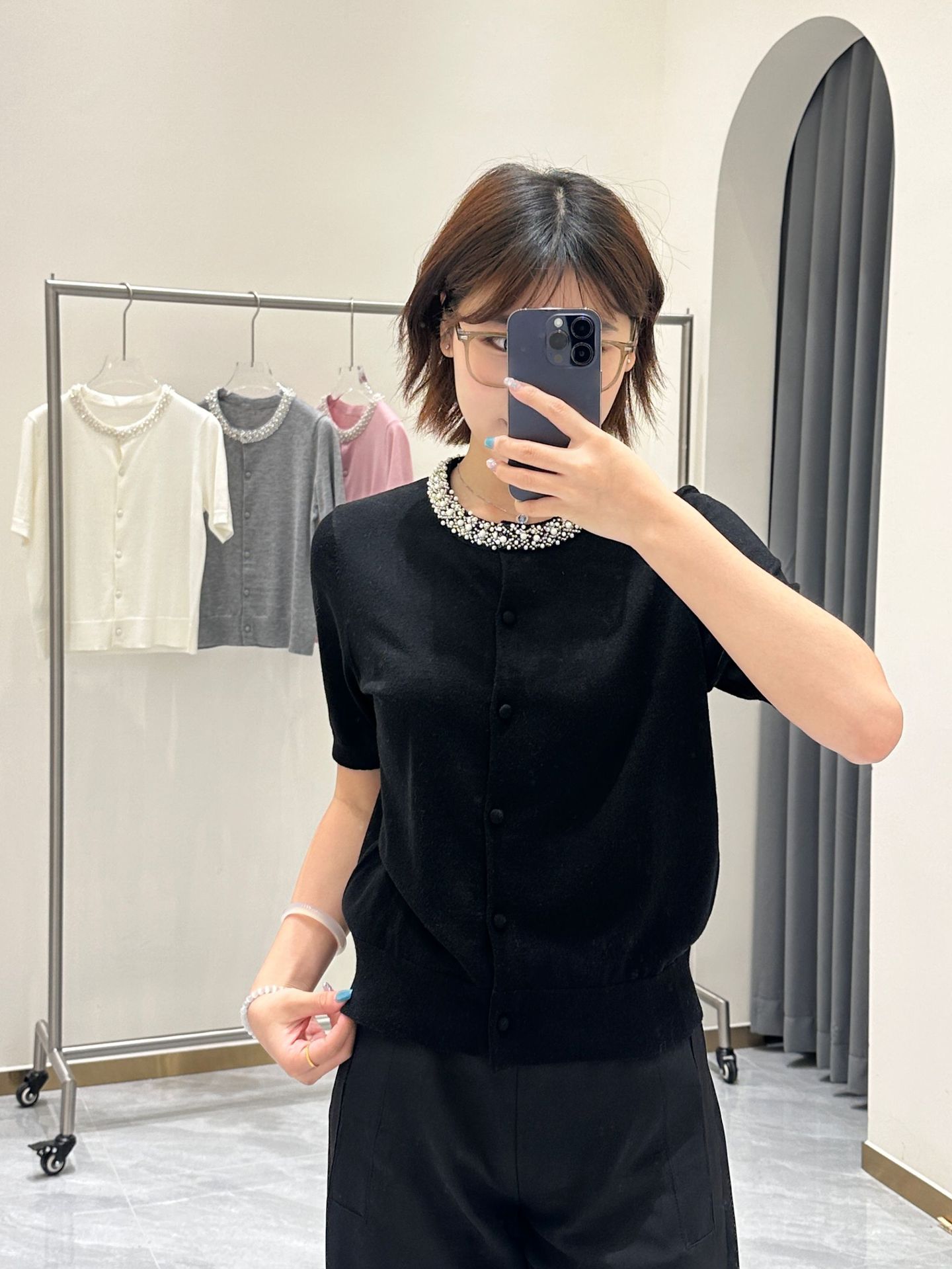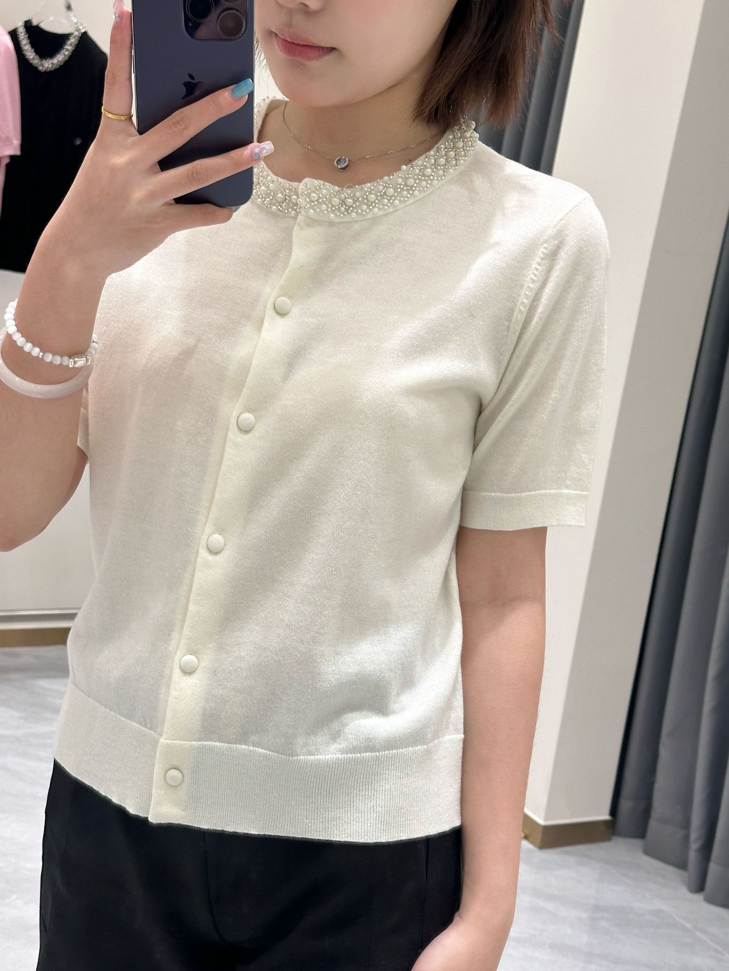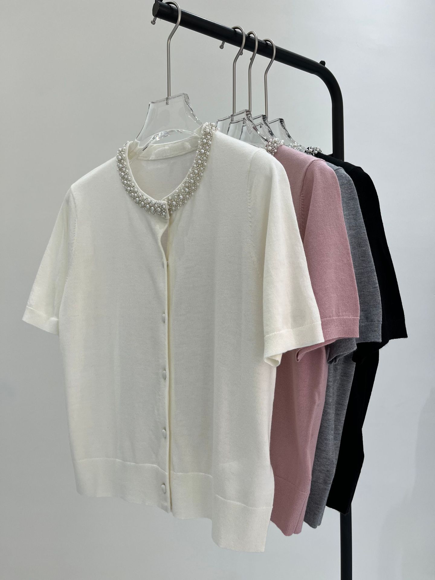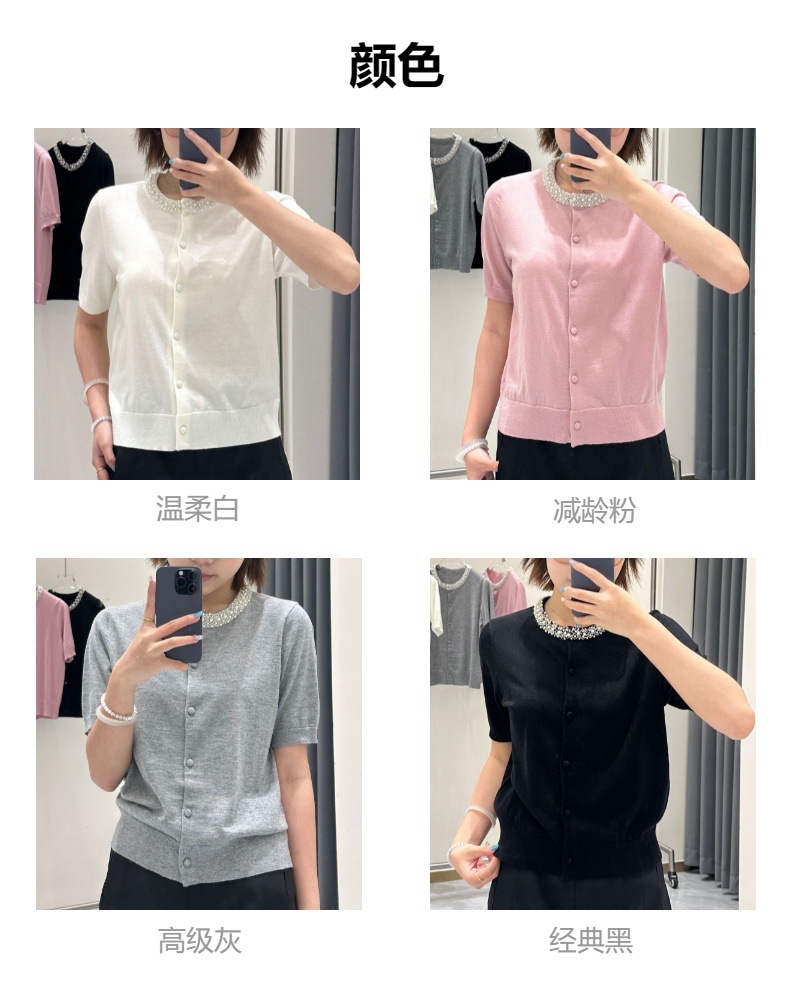 丁摩 春夏真丝羊毛小香风手工钉珠钻圆领短袖针织空调开衫上衣女5ZF-16153