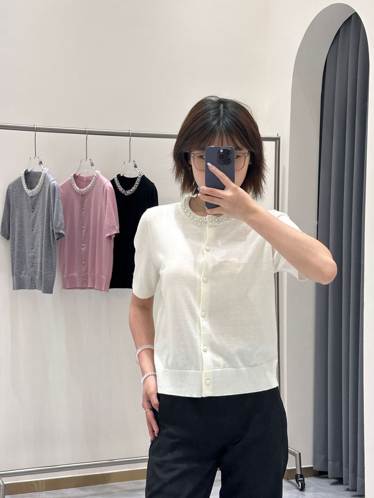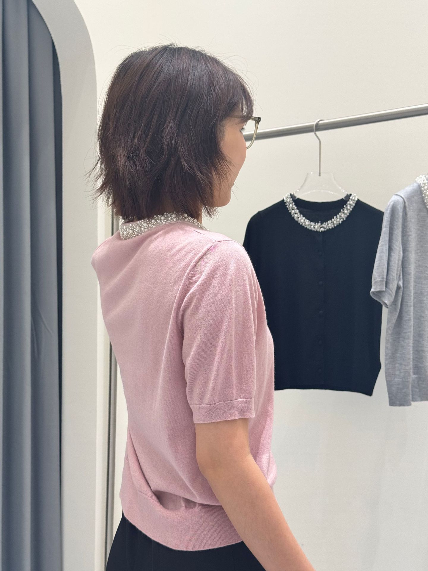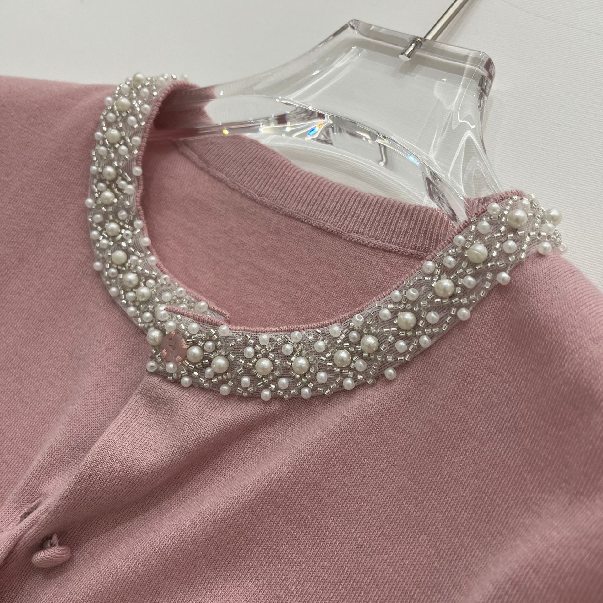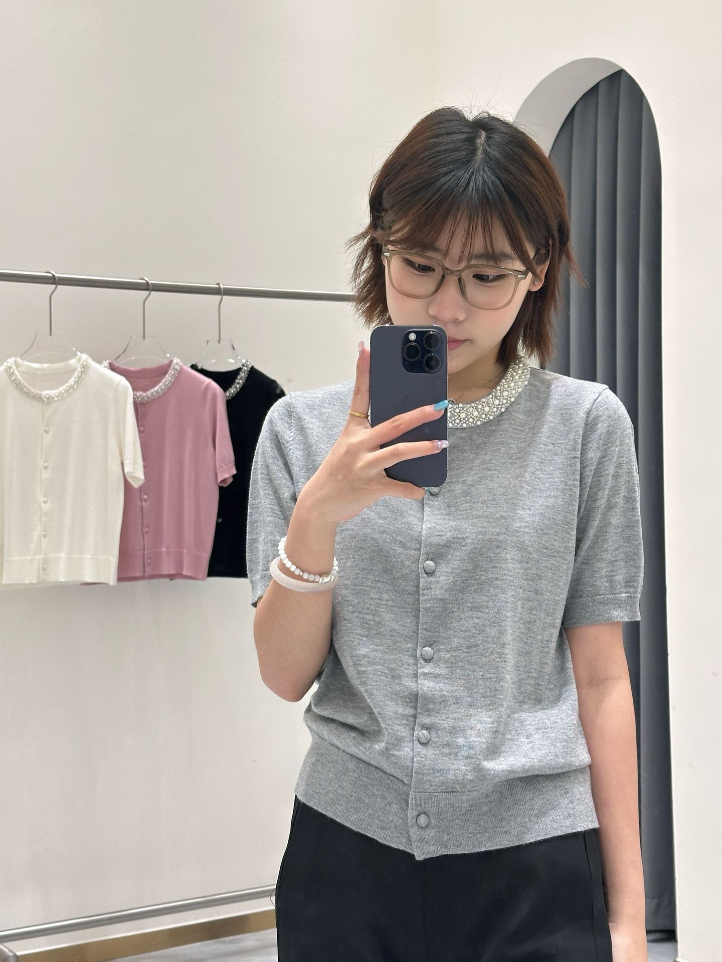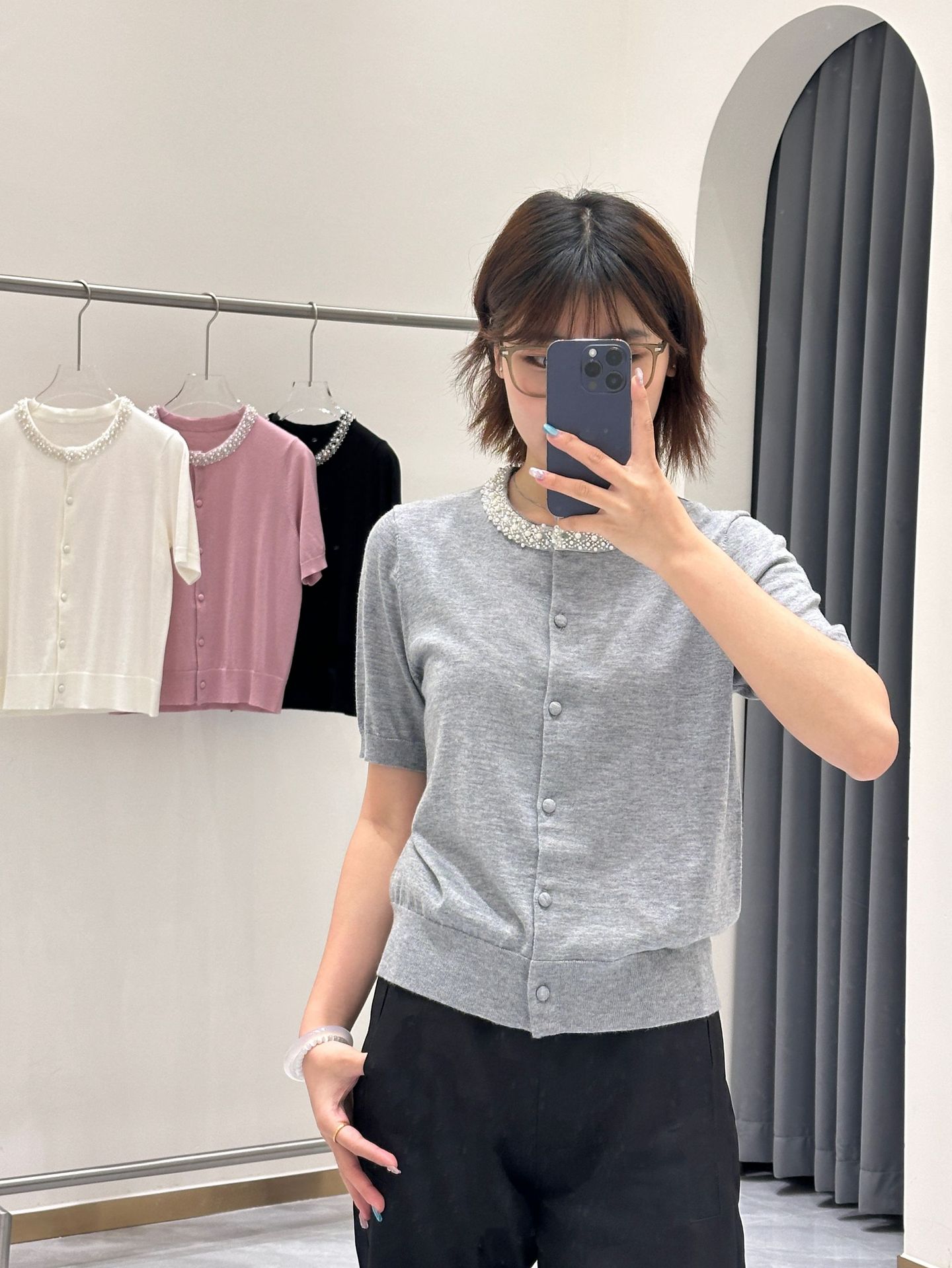 丁摩 春夏真丝羊毛小香风手工钉珠钻圆领短袖针织空调开衫上衣女5ZF-16153