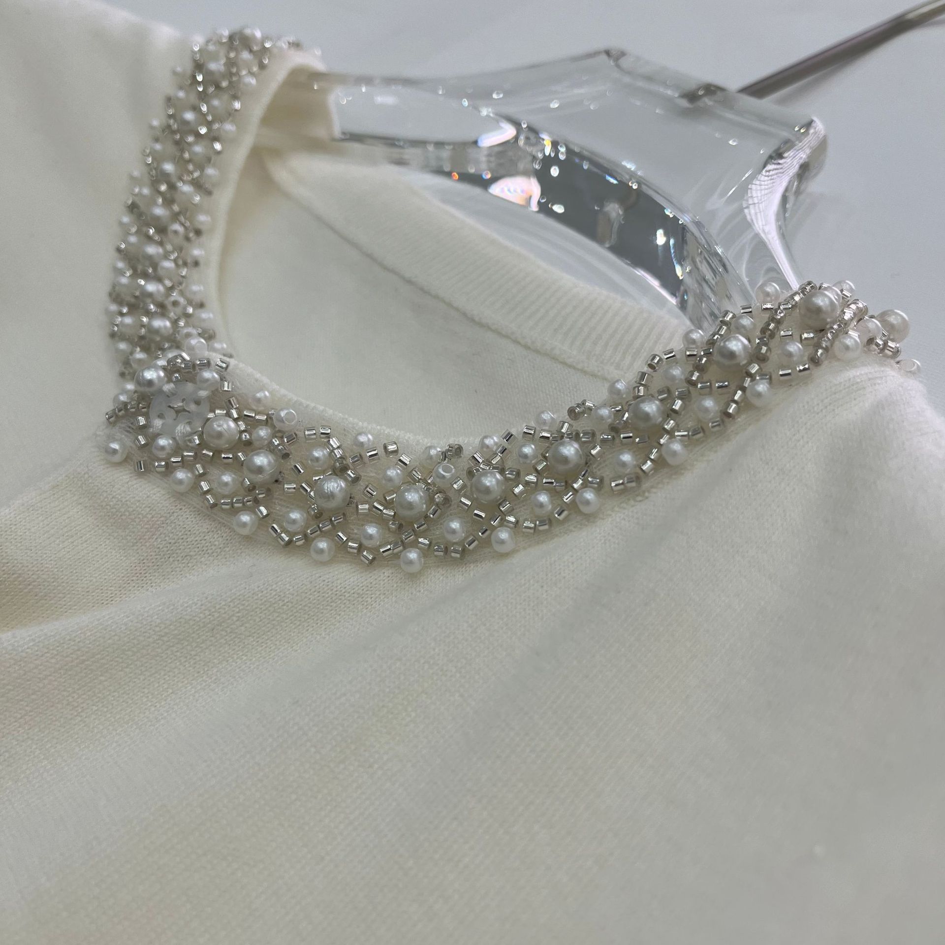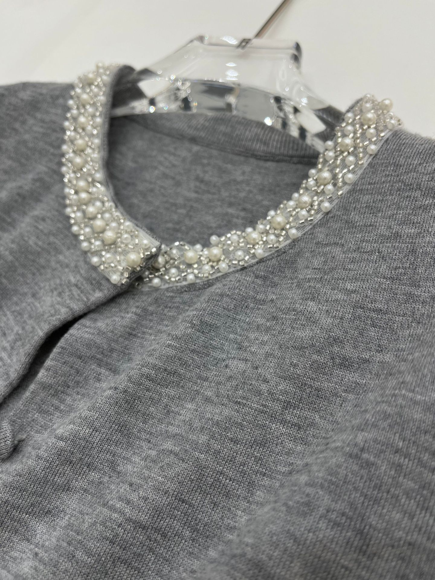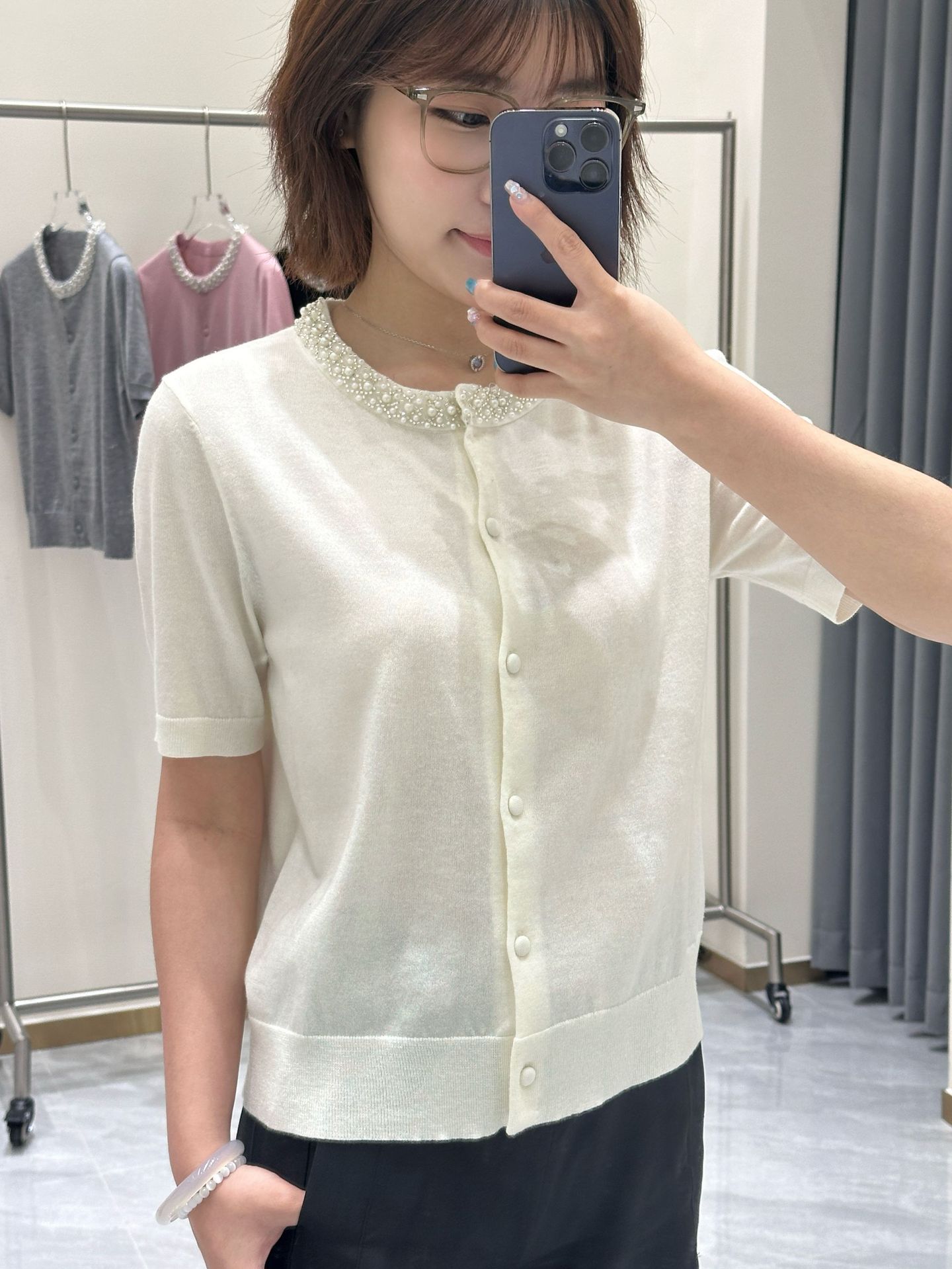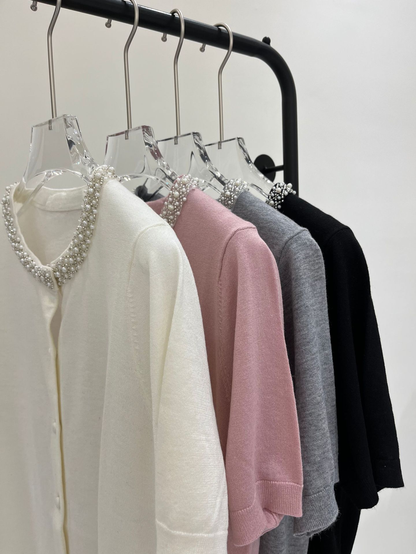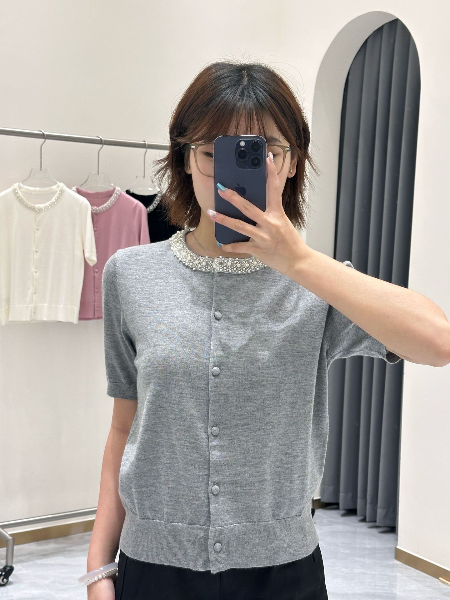 丁摩 春夏真丝羊毛小香风手工钉珠钻圆领短袖针织空调开衫上衣女5ZF-16153