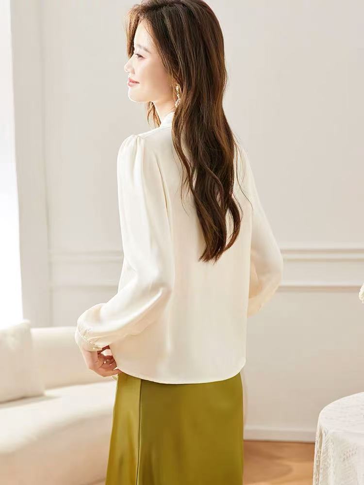 小码福利【2仓】植绒款 小众复古港味飘带领长袖雪纺百搭衬衫