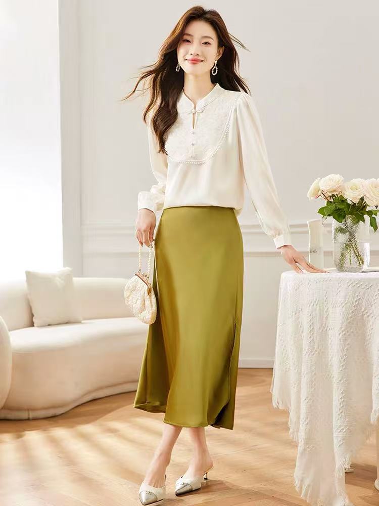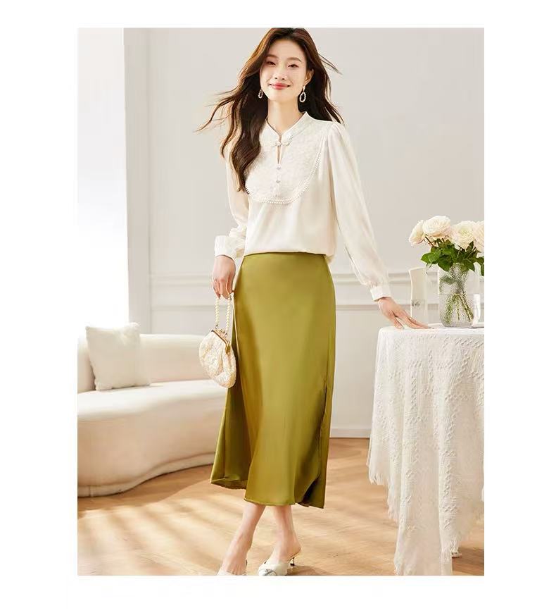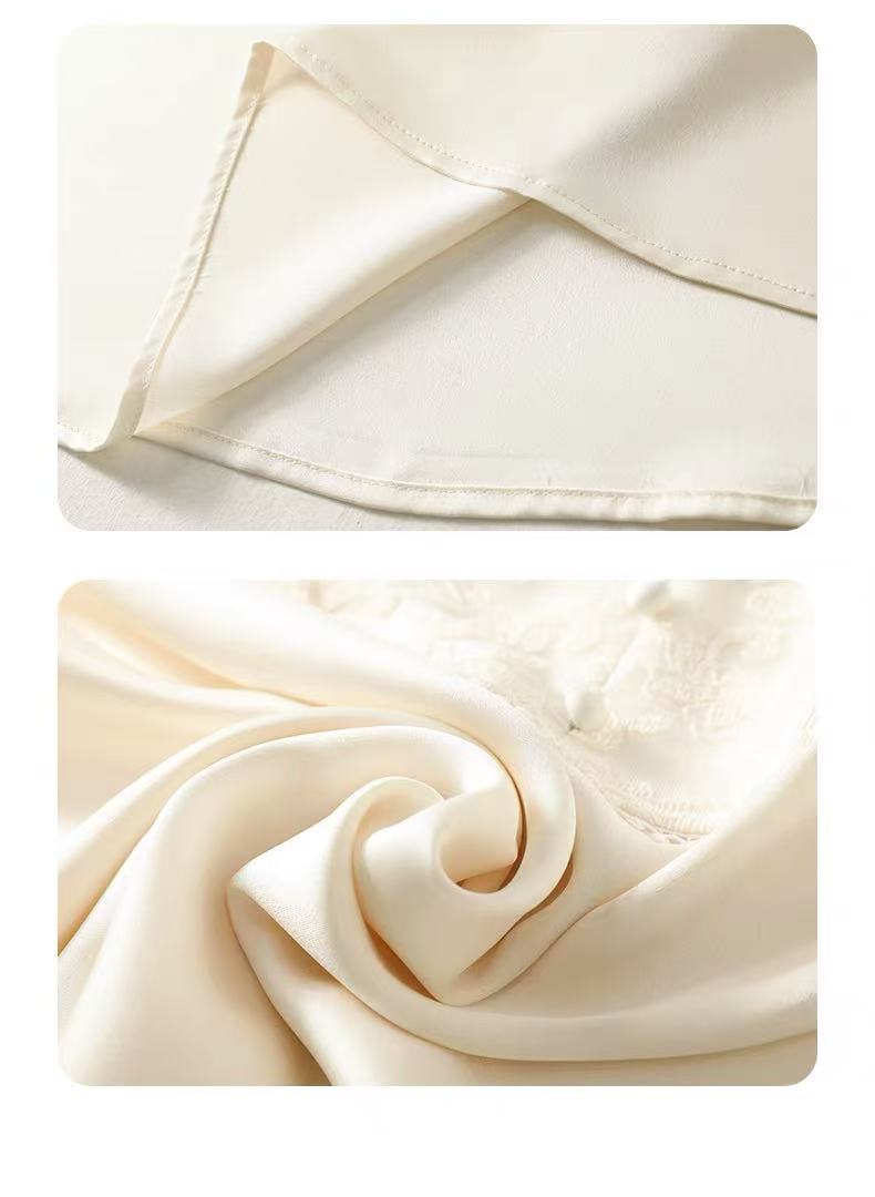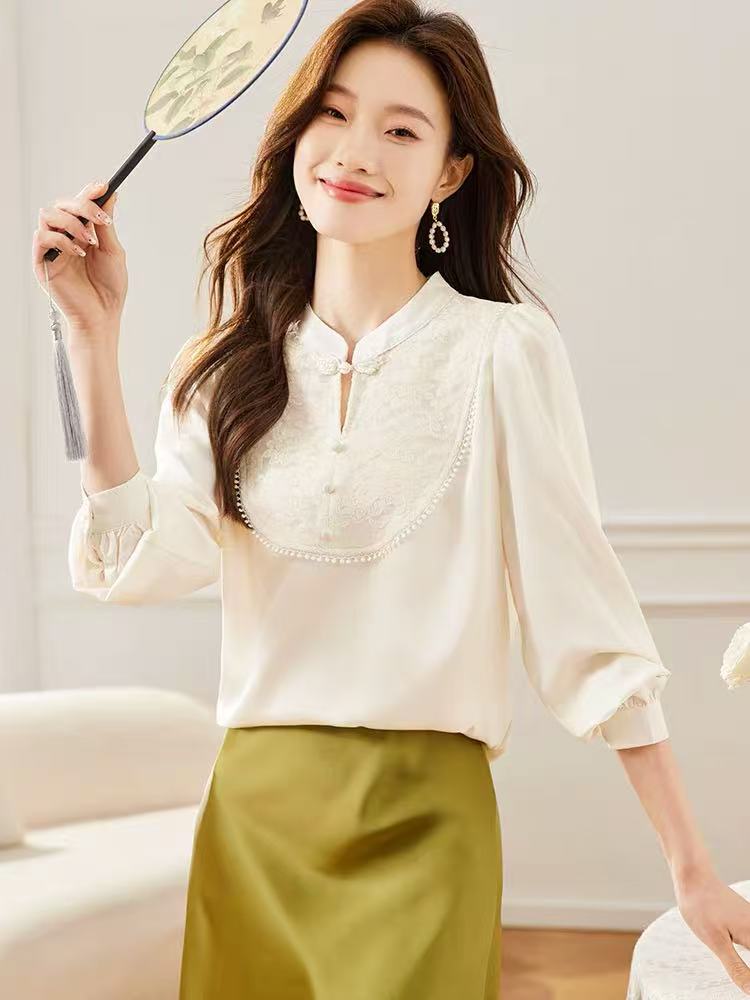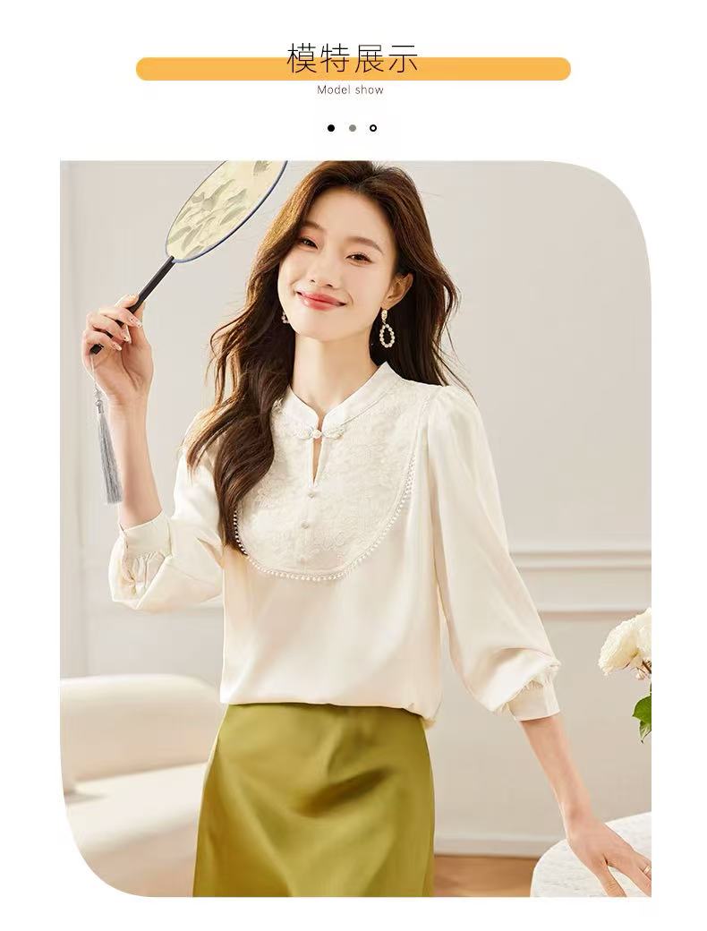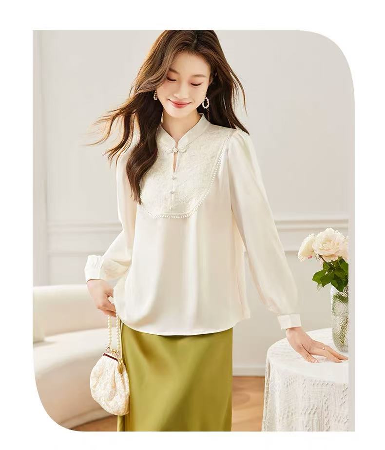 【新品推荐】仿真丝缎面顺滑新中式拼蕾丝长袖小衫-喜出
