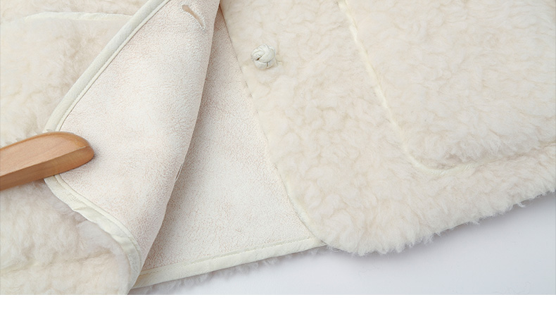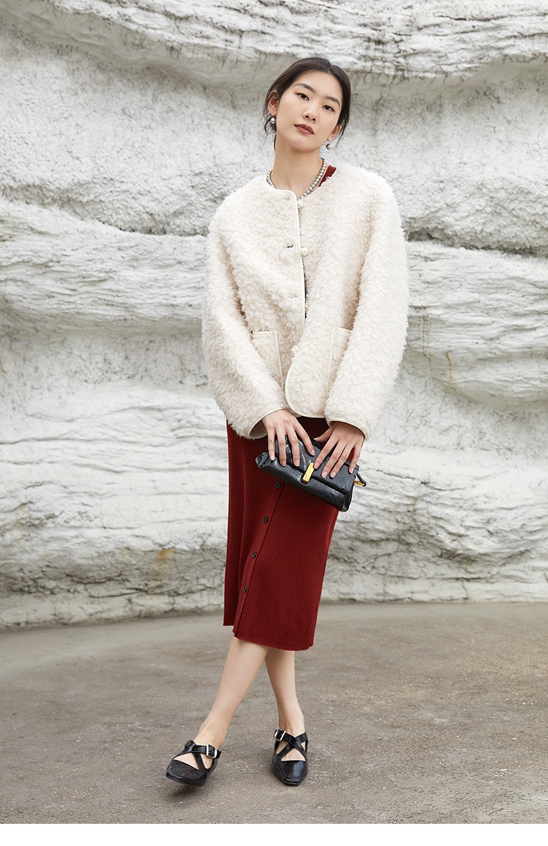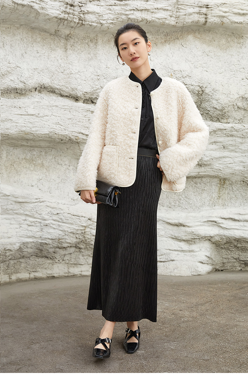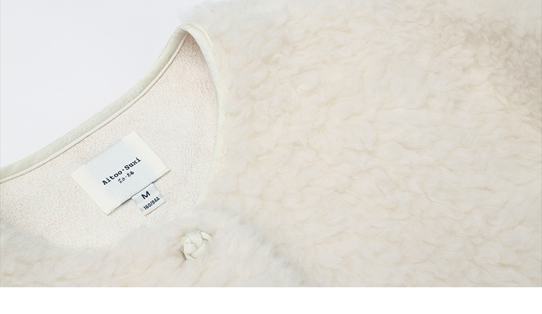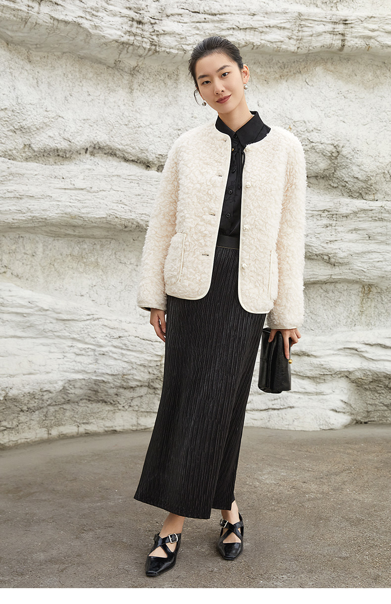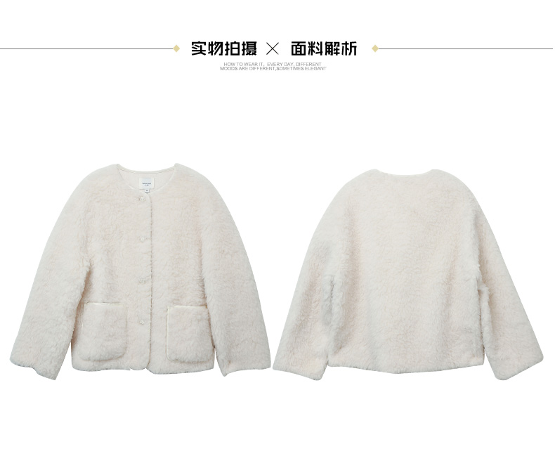 2025 冬季新款温柔米白色圆领毛绒外套 小香风单排扣口袋设计保暖短款仿皮草上衣