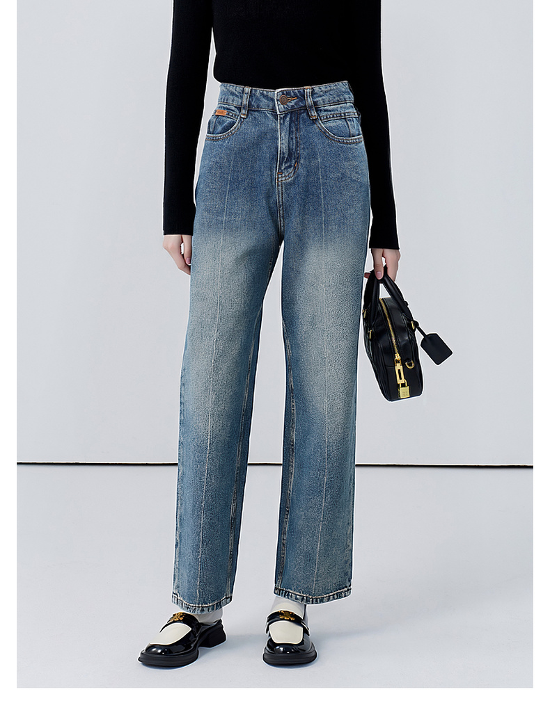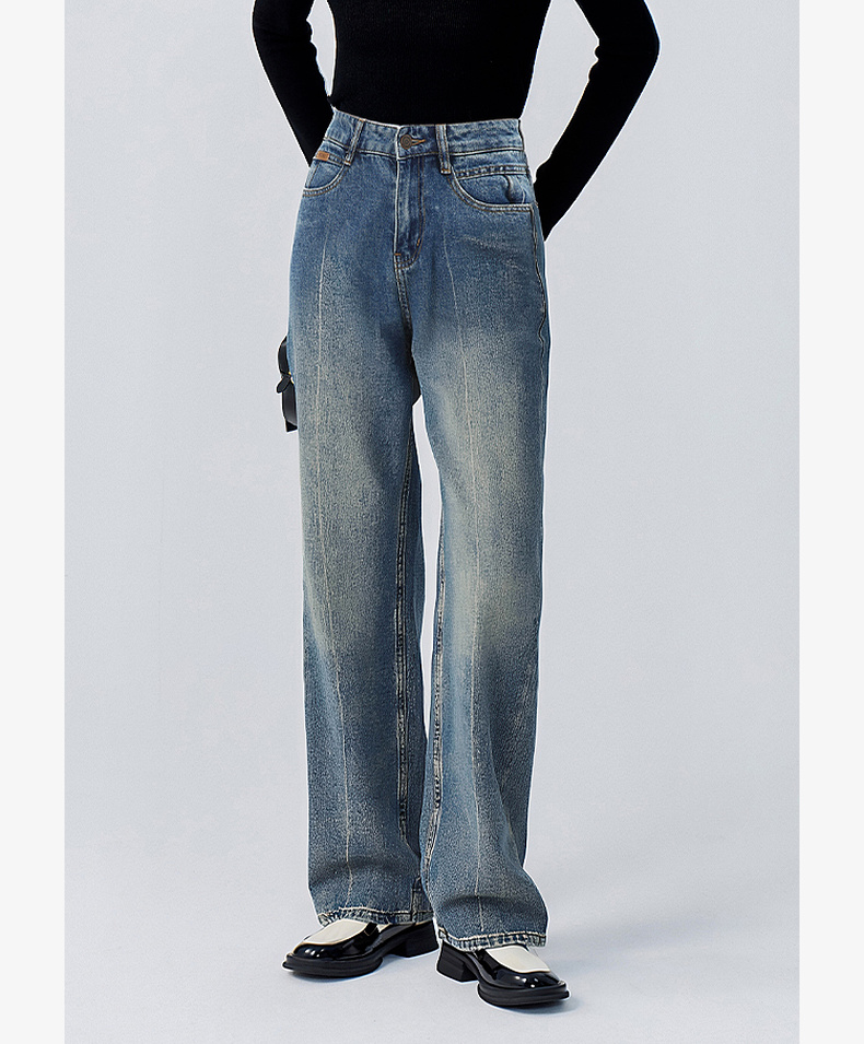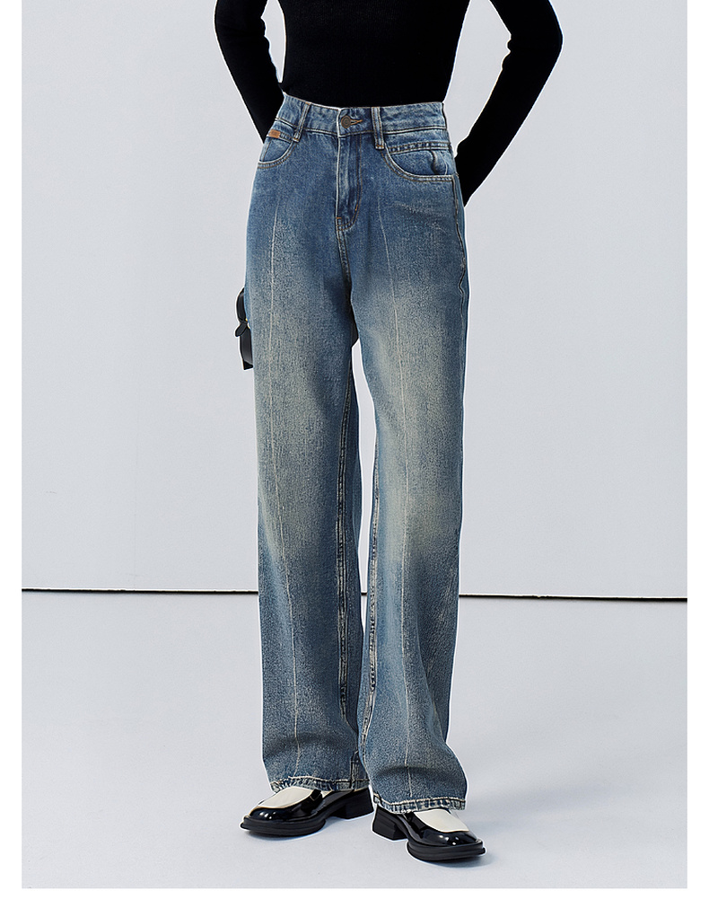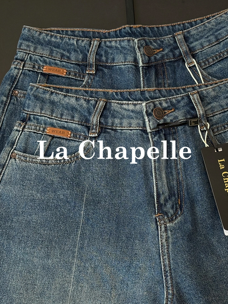 会员福利【雅赛尔+高棉】拉夏贝尔/La Chapelle字母皮标牛仔裤女高腰水洗宽松垂感休闲百搭直筒长裤秋季
